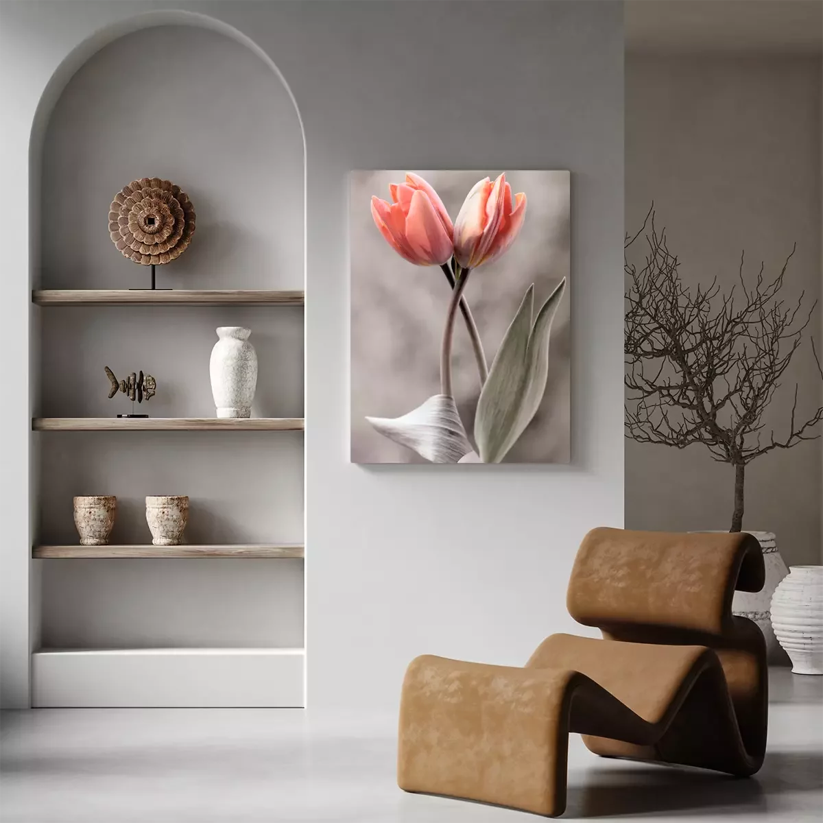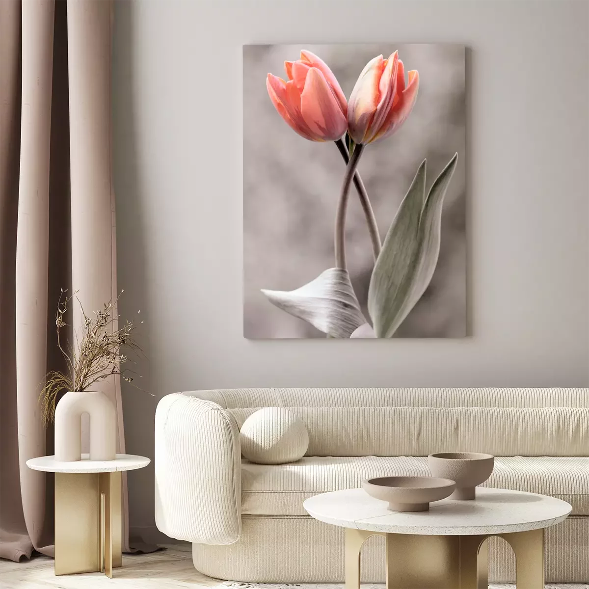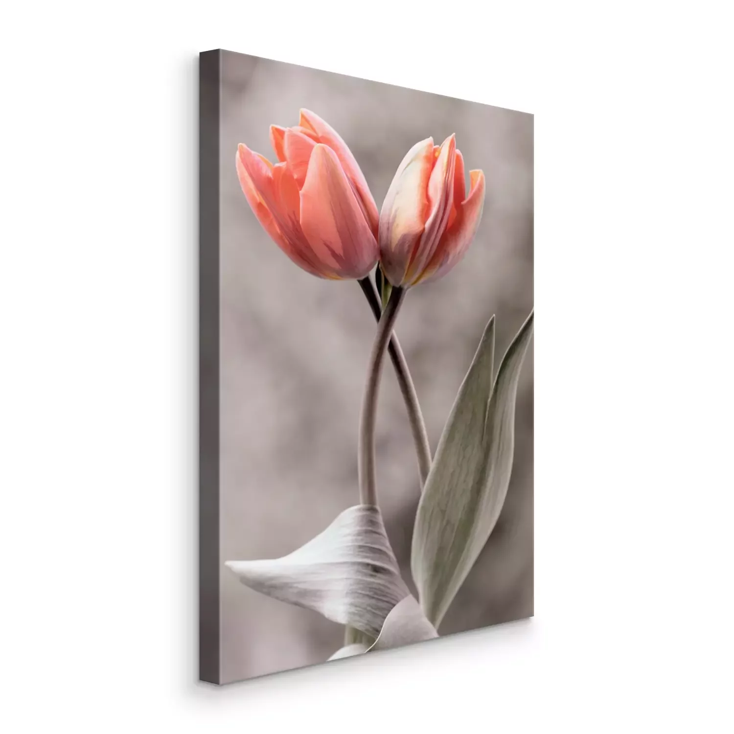 Zwei rosa tulpen vor verschwommenem grauen hintergrund