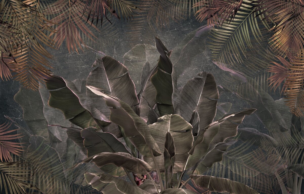 Fototapete: 3D-Bananenbäume und Palmblätter auf dunklem Betonhintergrund