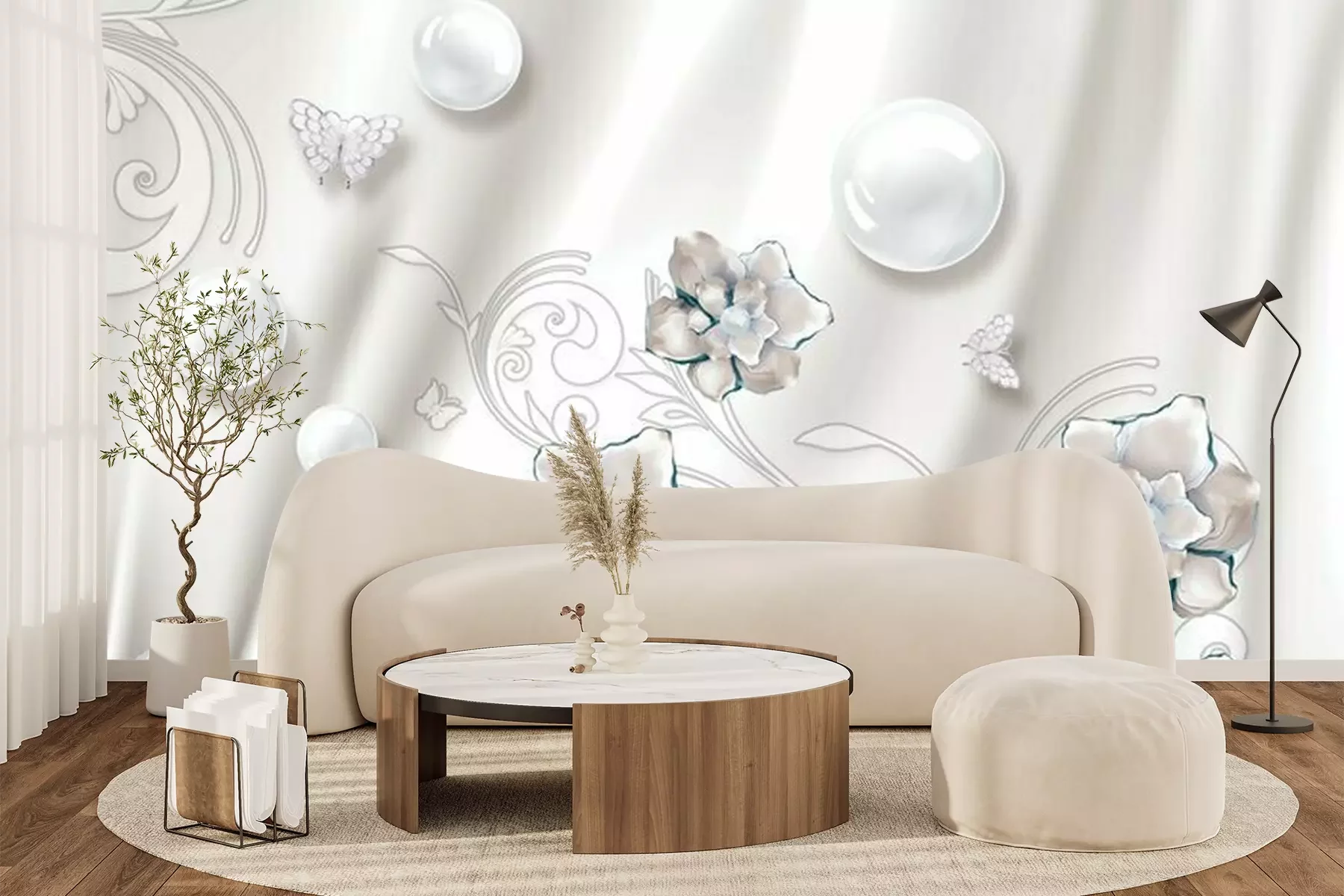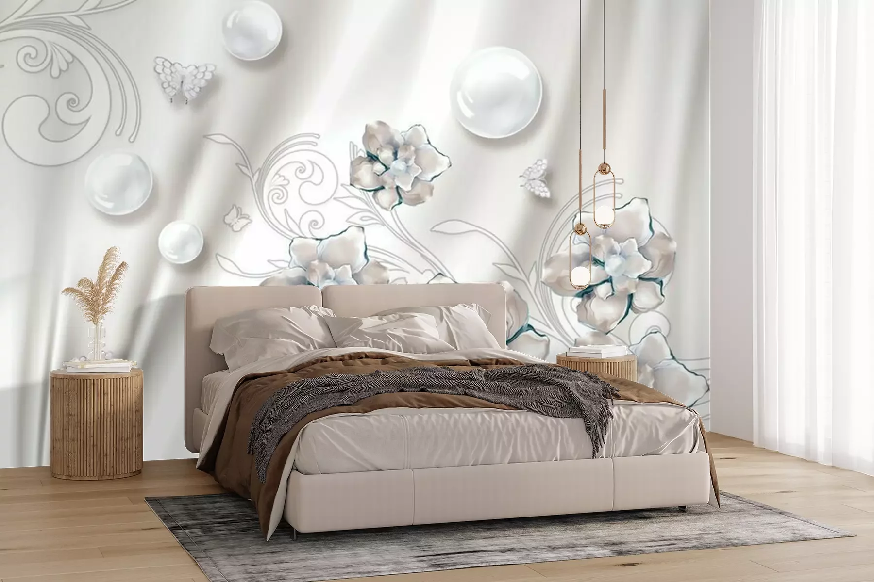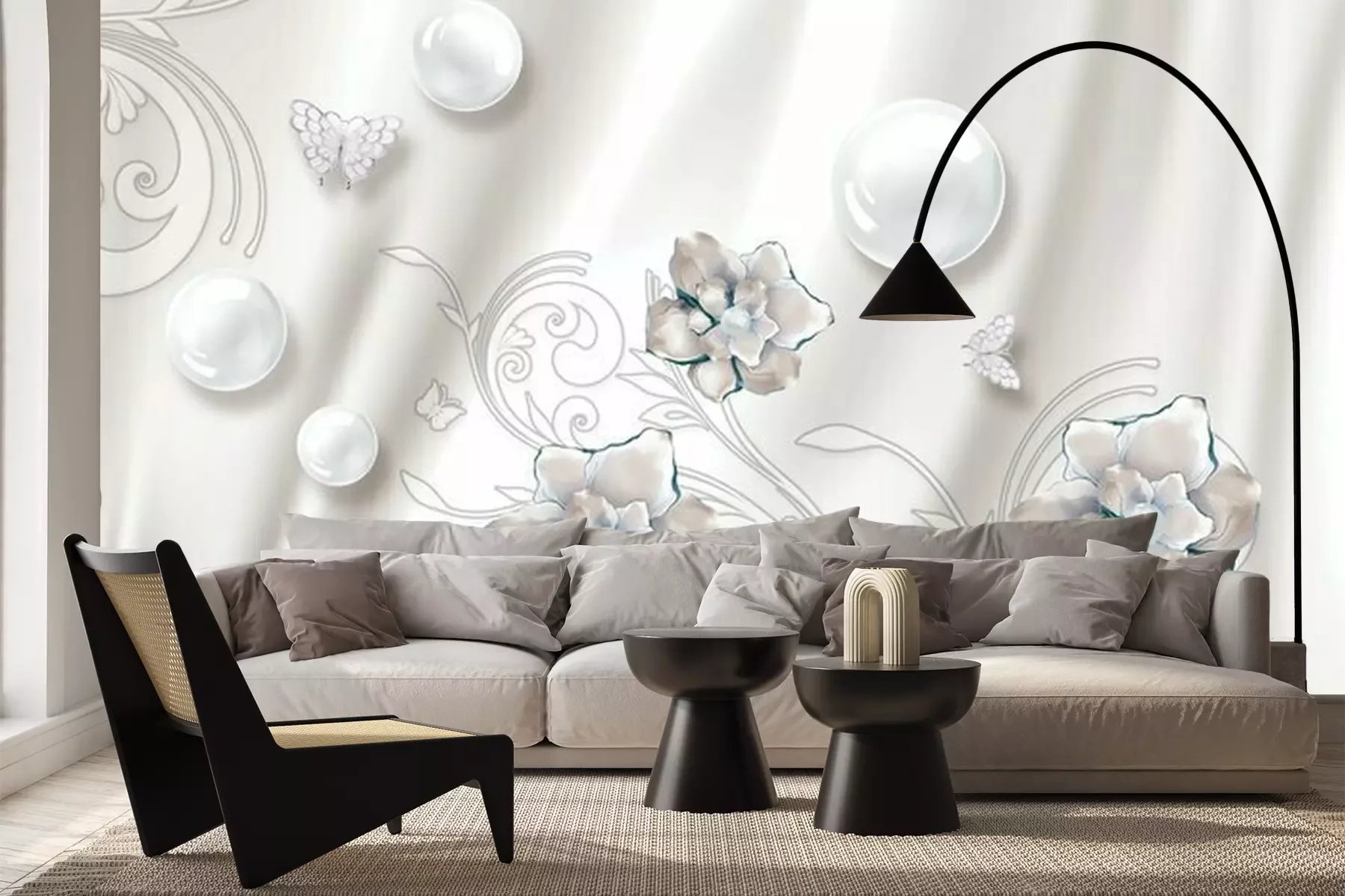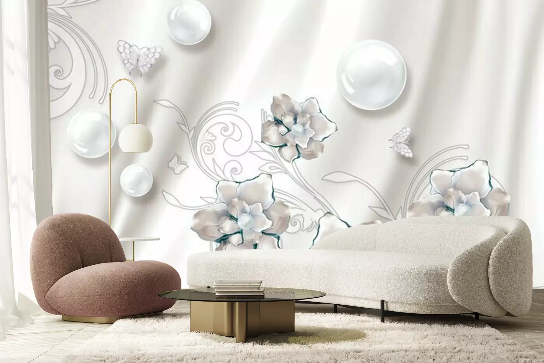 Fototapete 3D Kugeln in Weiß mit Blumen