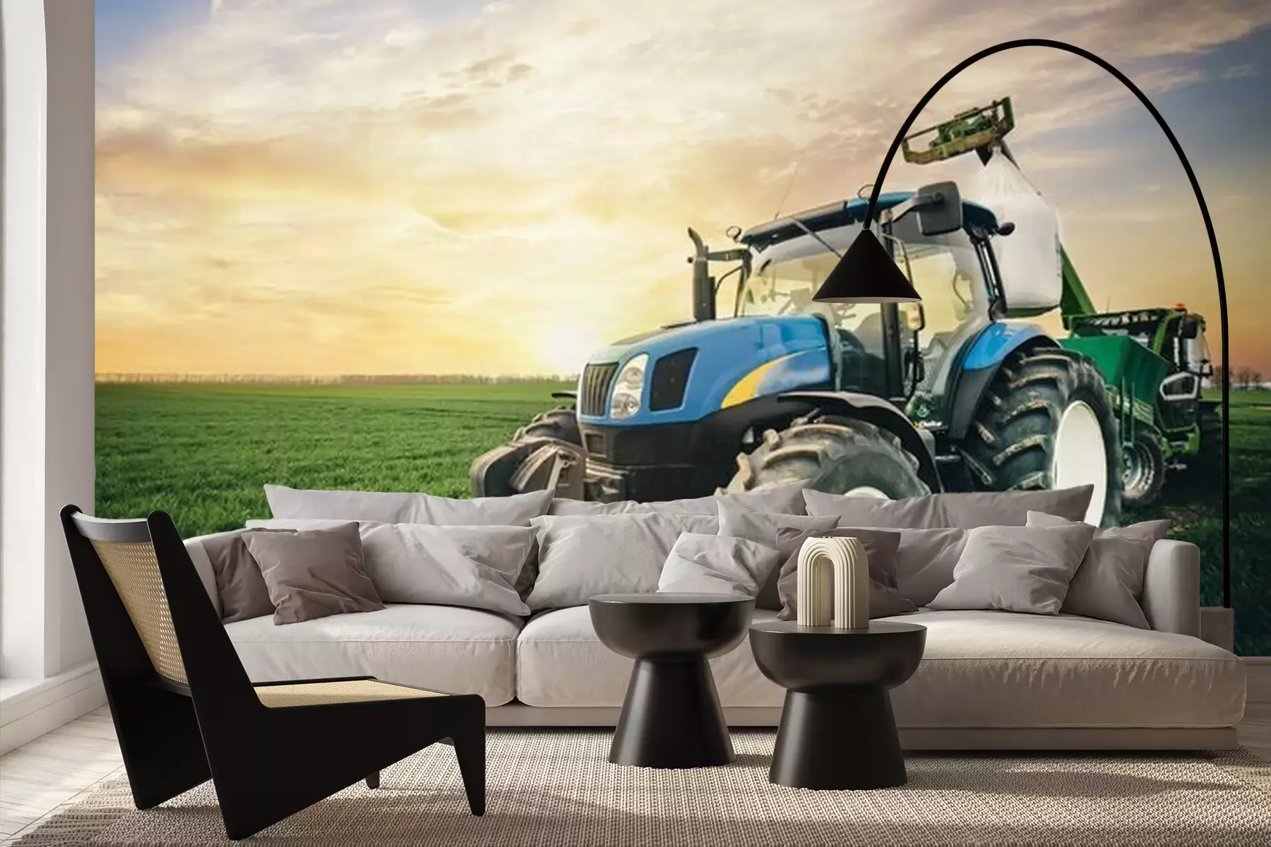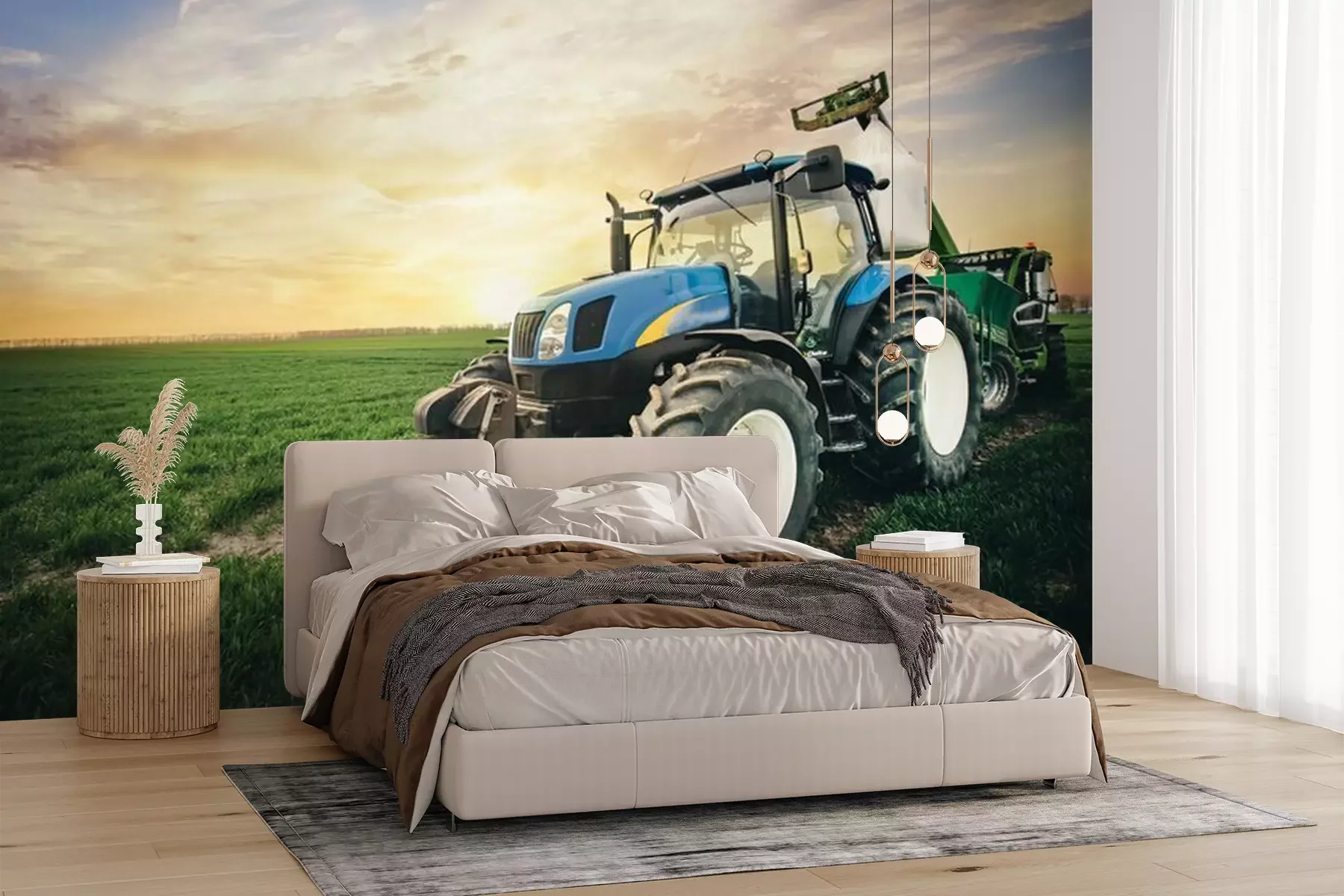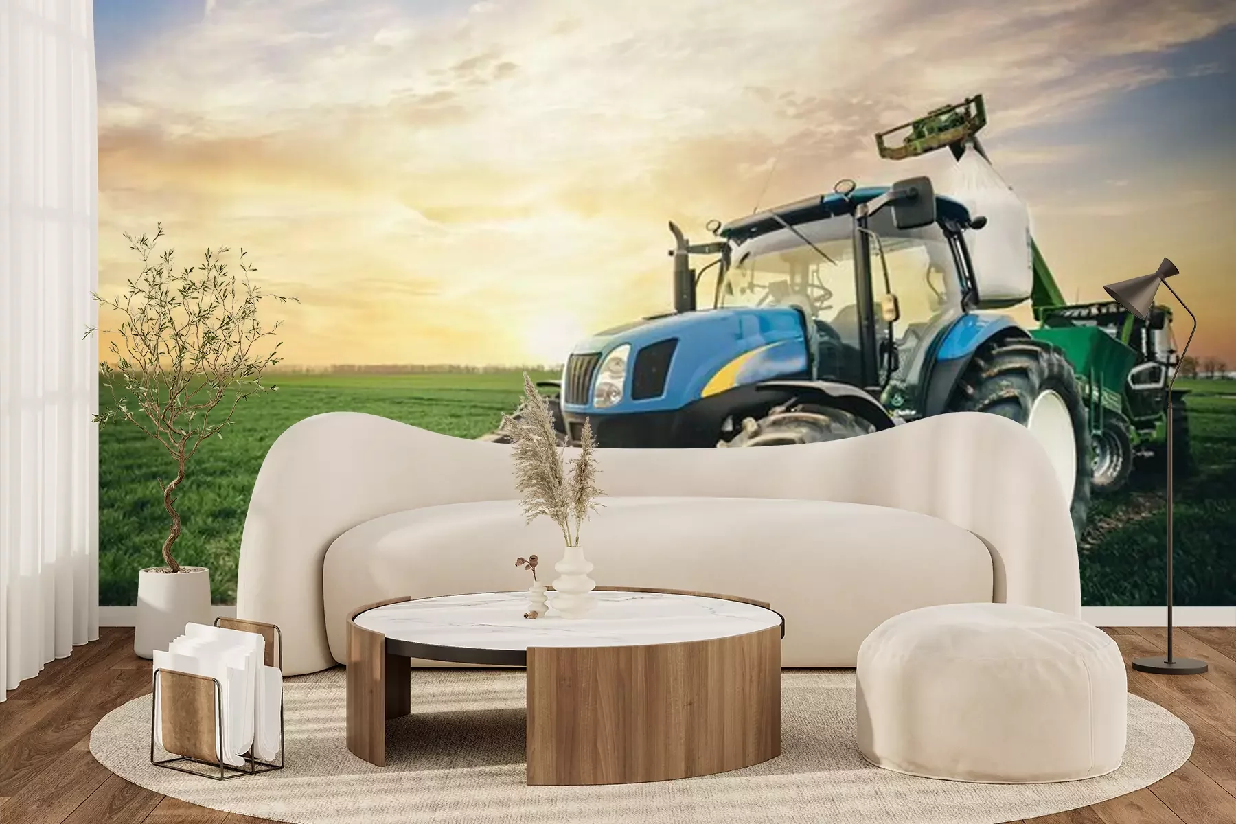 Fototapete 3d-Traktor auf dem Feld bei Sonnenuntergang