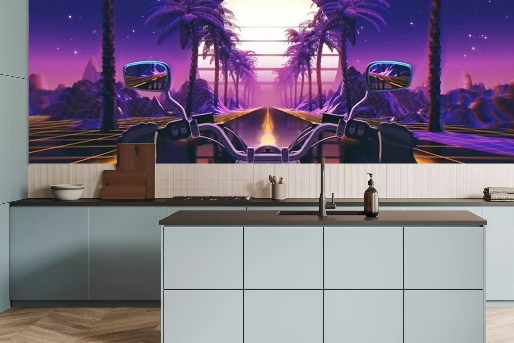 Fototapete 80s retro futuristic sci-fi background with motorcycle pov. Riding in retrowave VJ videogame landscape, neon lights and low poly grid. Stylized biker vintage vaporwave 3D animation background. 4K