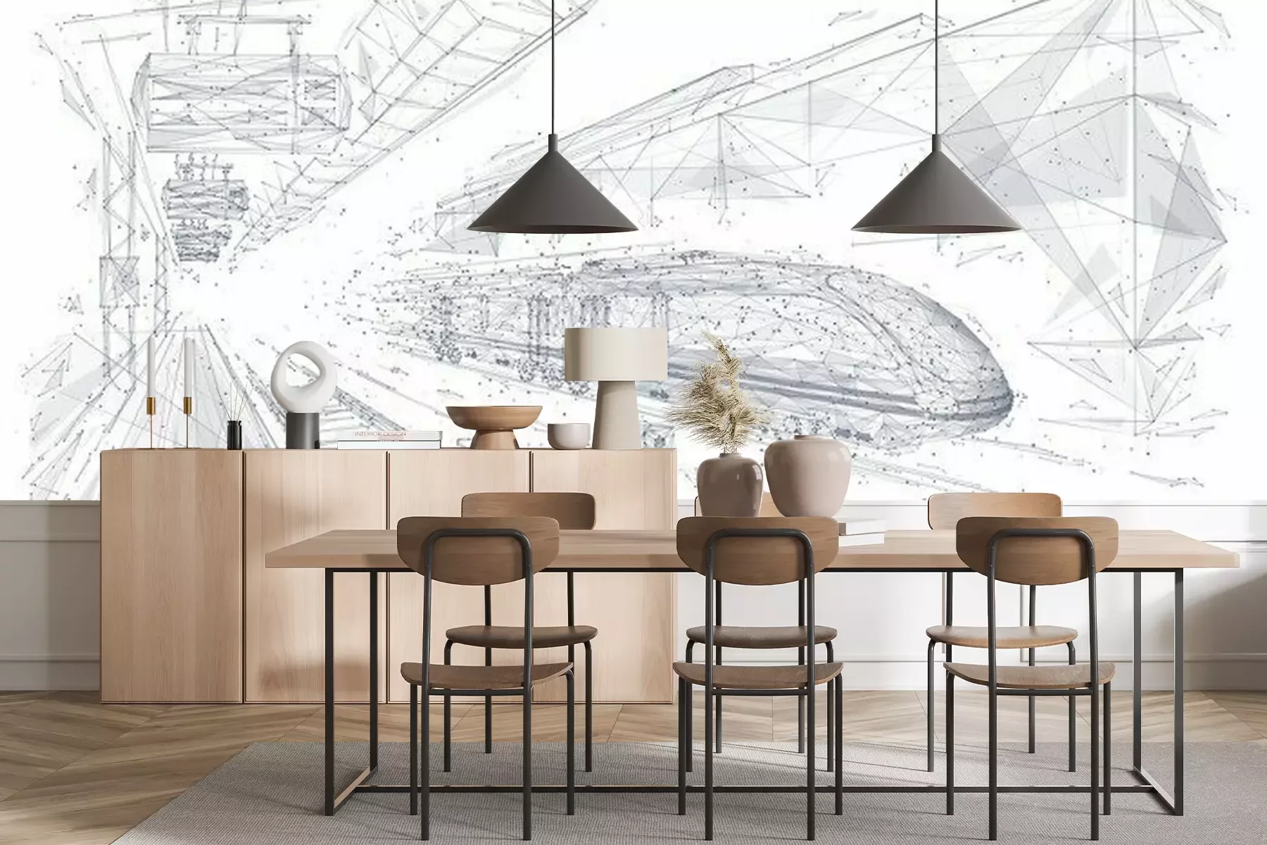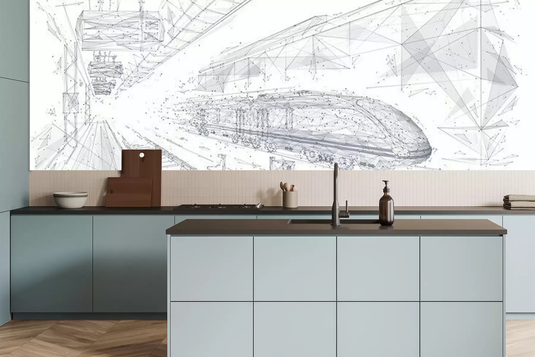 Fototapete Abstract low poly 3d wireframe of modern train at railway station or metro. Vector sketch drawing with connected dots. Rapid transit system, transportation, railway logistics concept isolated in white