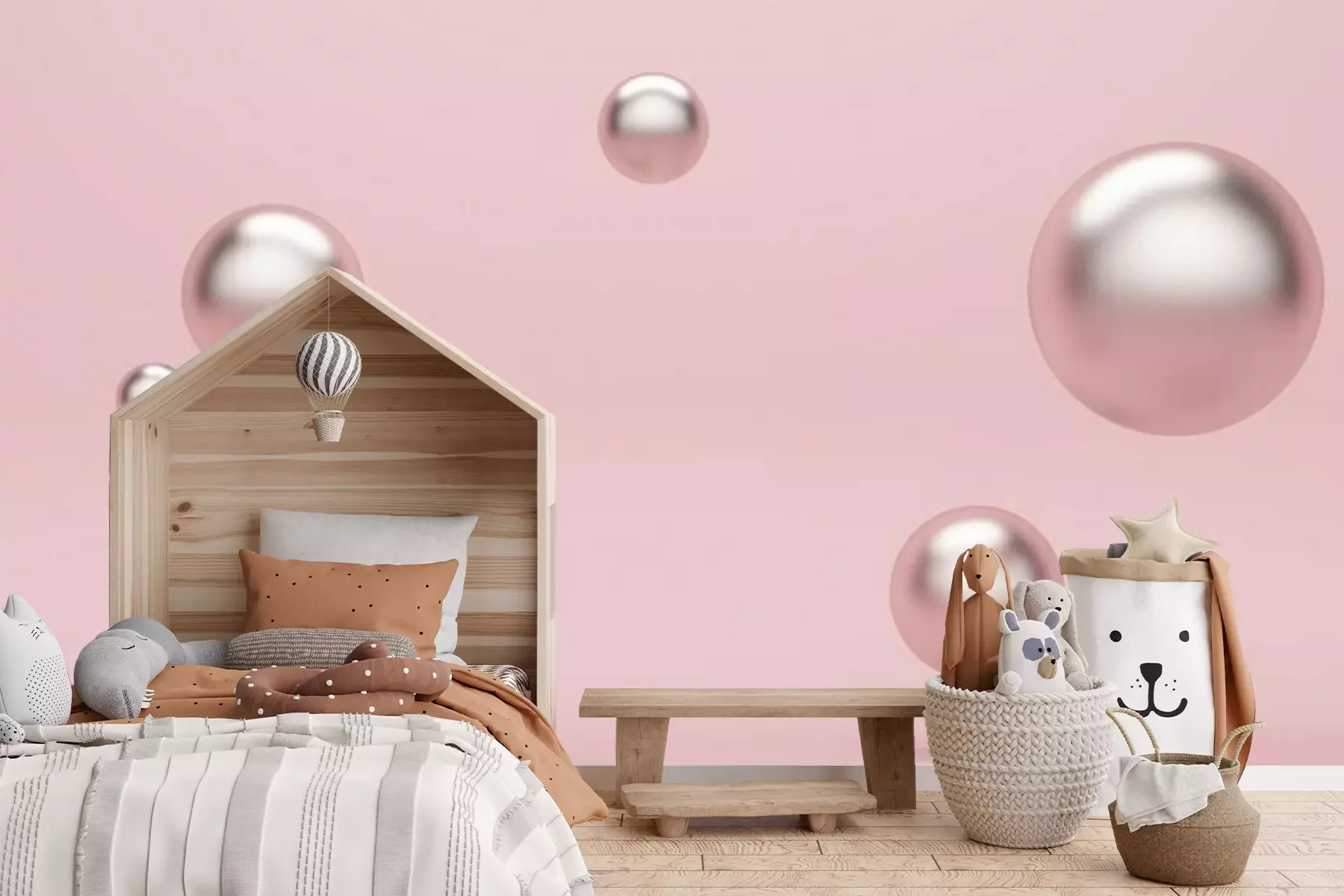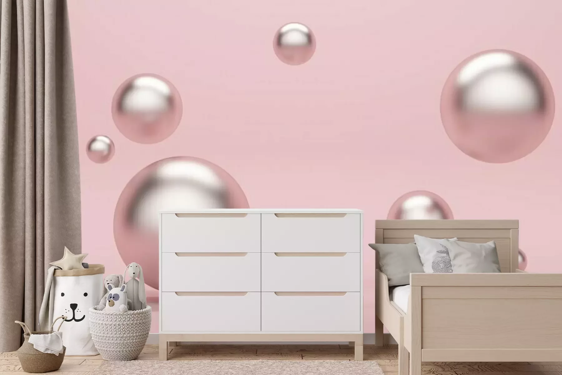 Fototapete Abstract pink background with metallic flying spheres. 3d rendering
