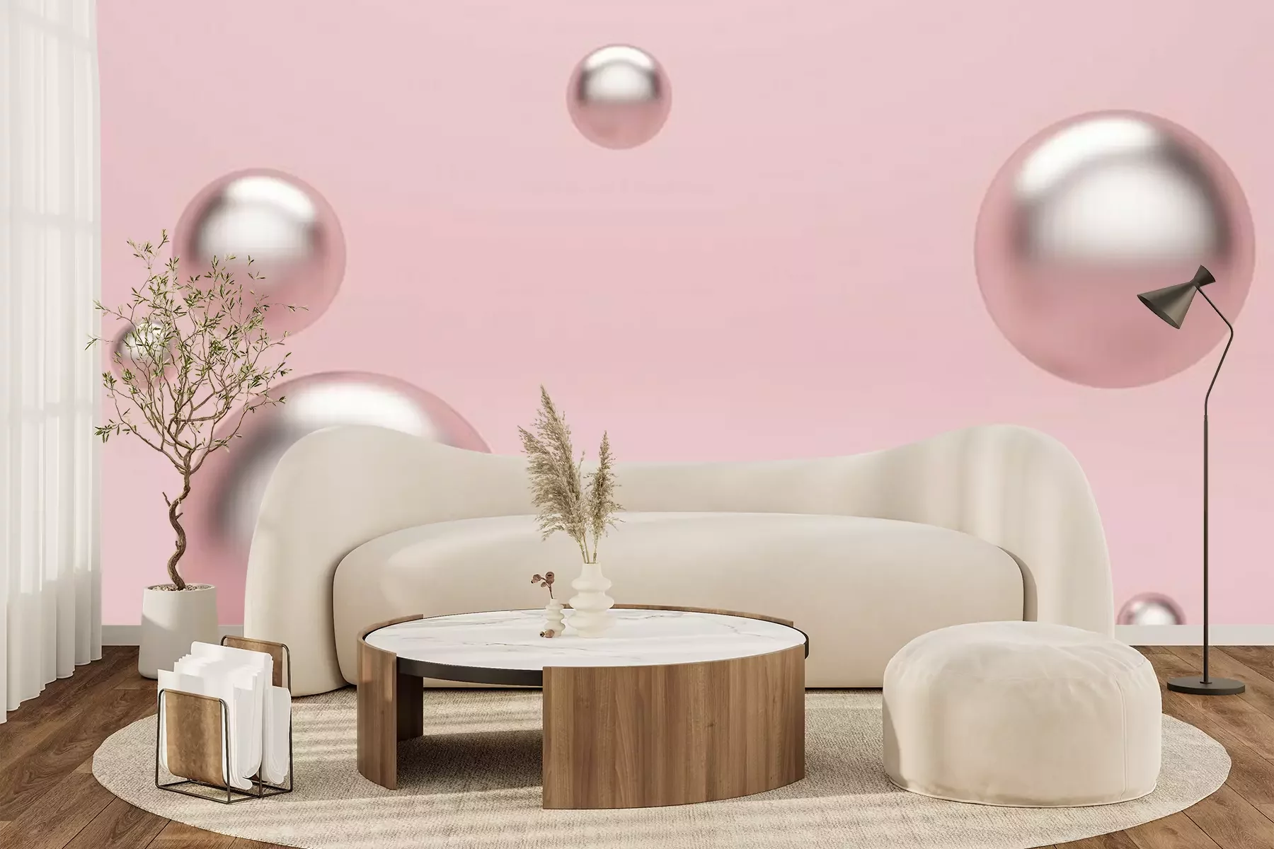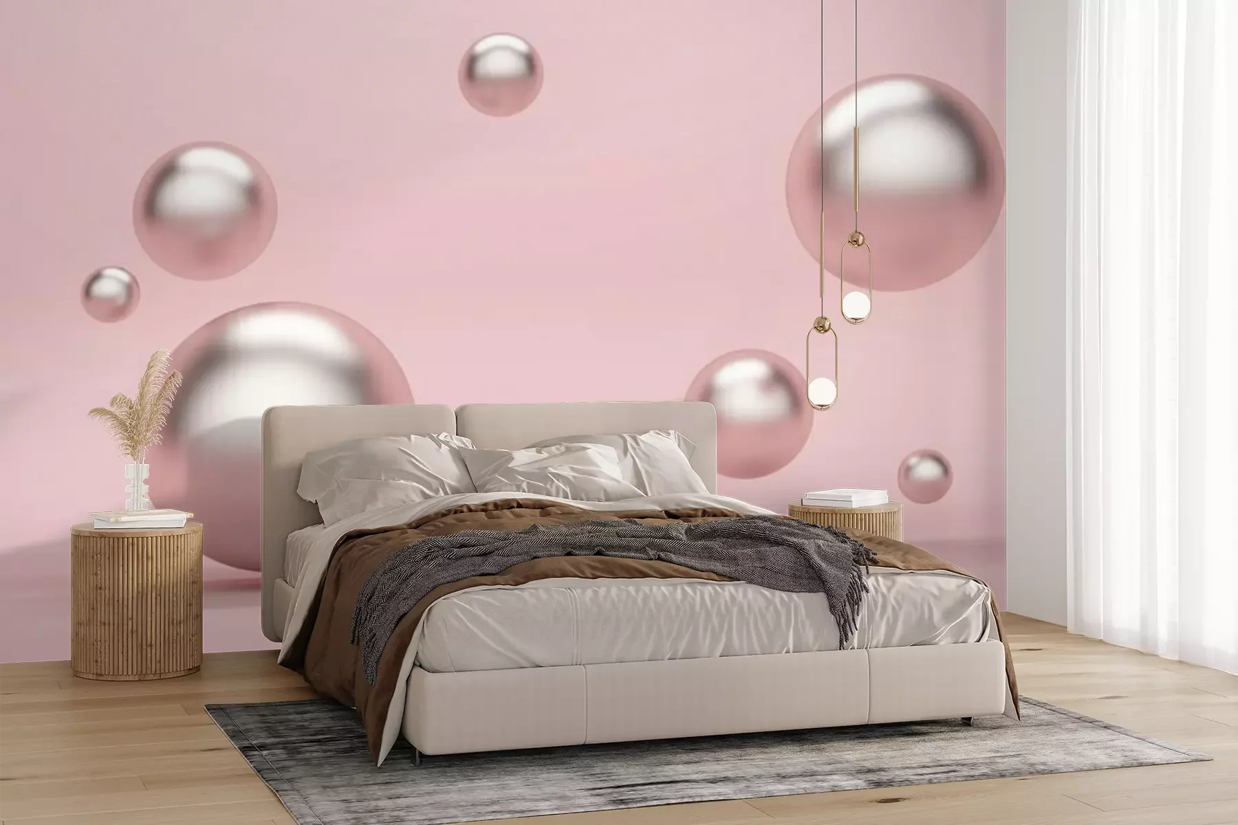 Fototapete Abstract pink background with metallic flying spheres. 3d rendering