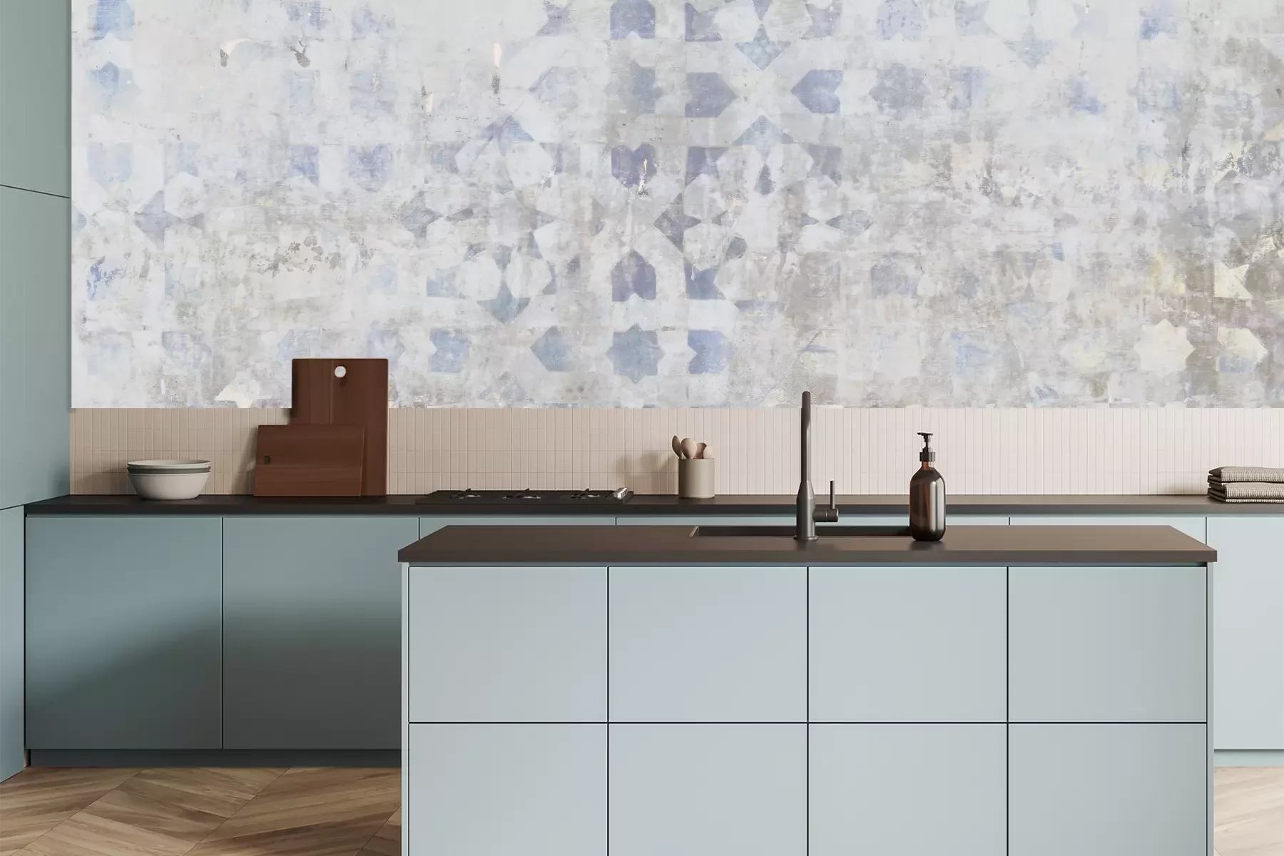 Das Material Premium+ besteht aus einer strukturierten Vinyl-Oberschicht und einem Trägermaterial (Vlies) mit einer Grammatur von 255 g/m², das kleine Unebenheiten der Wand zuverlässig kaschiert. Die feine Sandstruktur verleiht der Oberfläche eine luxuriöse Haptik, während das halbmatte Finish die Tiefe der Farben betont. Das Material ist dampfdurchlässig – so kann diese Fototapete auch in Küchen und Badezimmern eingesetzt werden. Die maximale Breite einer Tapetenbahn beträgt 100 cm. Bei größeren Abmessungen besteht die Fototapete aus mehreren gleich großen Bahnen. Der Kleber wird direkt auf die Wand aufgetragen, und die Fototapete wird auf Stoß angebracht, was für einen ästhetischen Effekt ohne sichtbare Fugen sorgt. Die Oberfläche ist pflegeleicht und kann bei Bedarf sanft mit einem feuchten Tuch abgewischt werden.