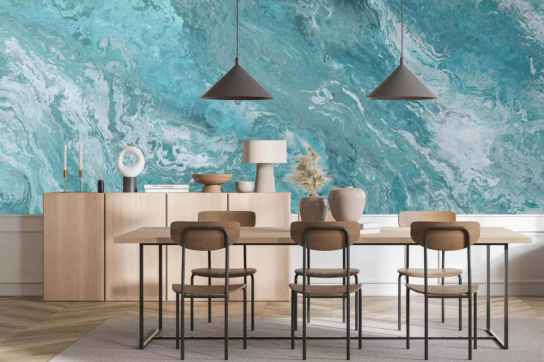 Das Material Premium+ besteht aus einer strukturierten Vinyl-Oberschicht und einem Trägermaterial (Vlies) mit einer Grammatur von 255 g/m², das kleine Unebenheiten der Wand zuverlässig kaschiert. Die feine Sandstruktur verleiht der Oberfläche eine luxuriöse Haptik, während das halbmatte Finish die Tiefe der Farben betont. Das Material ist dampfdurchlässig – so kann diese Fototapete auch in Küchen und Badezimmern eingesetzt werden. Die maximale Breite einer Tapetenbahn beträgt 100 cm. Bei größeren Abmessungen besteht die Fototapete aus mehreren gleich großen Bahnen. Der Kleber wird direkt auf die Wand aufgetragen, und die Fototapete wird auf Stoß angebracht, was für einen ästhetischen Effekt ohne sichtbare Fugen sorgt. Die Oberfläche ist pflegeleicht und kann bei Bedarf sanft mit einem feuchten Tuch abgewischt werden.