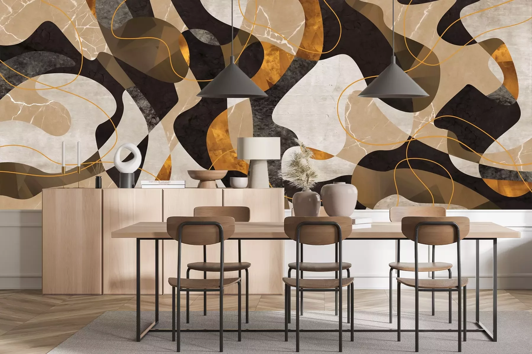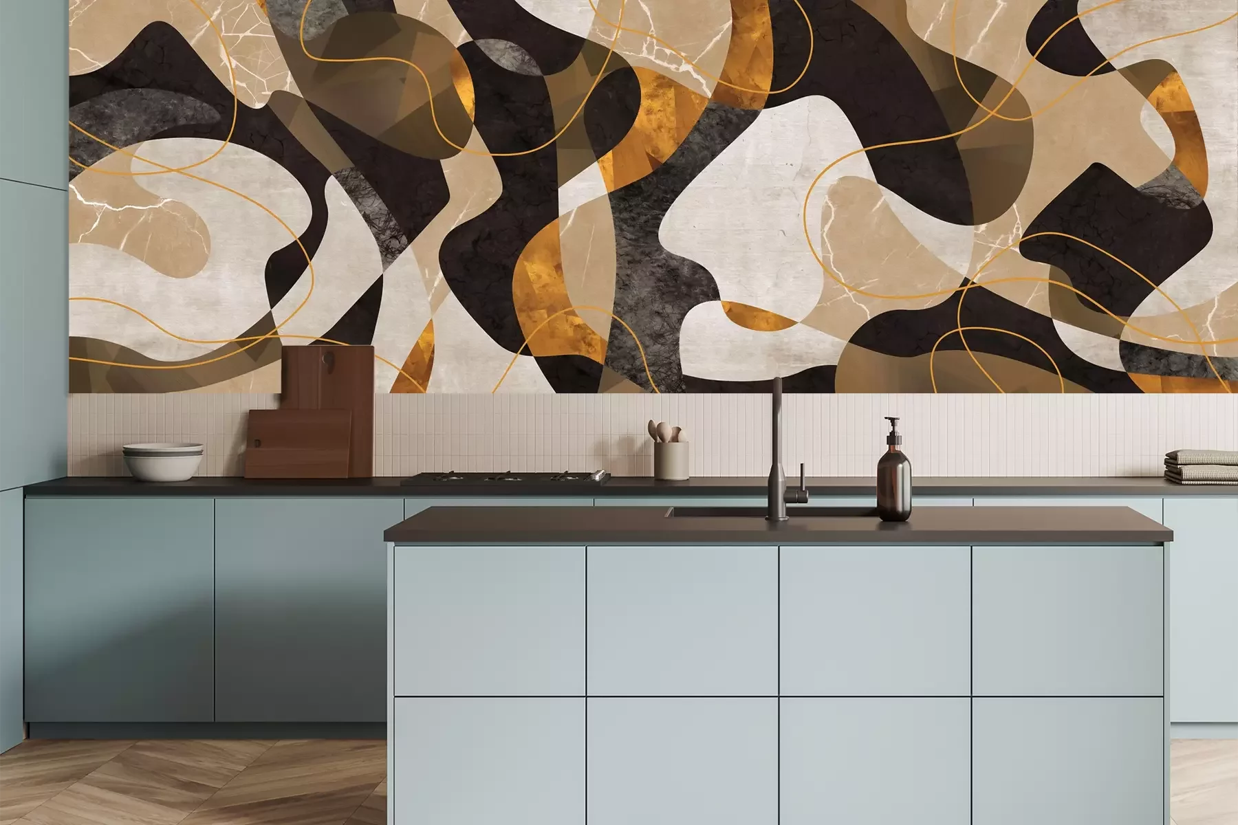 Das Material Premium+ besteht aus einer strukturierten Vinyl-Oberschicht und einem Trägermaterial (Vlies) mit einer Grammatur von 255 g/m², das kleine Unebenheiten der Wand zuverlässig kaschiert. Die feine Sandstruktur verleiht der Oberfläche eine luxuriöse Haptik, während das halbmatte Finish die Tiefe der Farben betont. Das Material ist dampfdurchlässig – so kann diese Fototapete auch in Küchen und Badezimmern eingesetzt werden. Die maximale Breite einer Tapetenbahn beträgt 100 cm. Bei größeren Abmessungen besteht die Fototapete aus mehreren gleich großen Bahnen. Der Kleber wird direkt auf die Wand aufgetragen, und die Fototapete wird auf Stoß angebracht, was für einen ästhetischen Effekt ohne sichtbare Fugen sorgt. Die Oberfläche ist pflegeleicht und kann bei Bedarf sanft mit einem feuchten Tuch abgewischt werden.