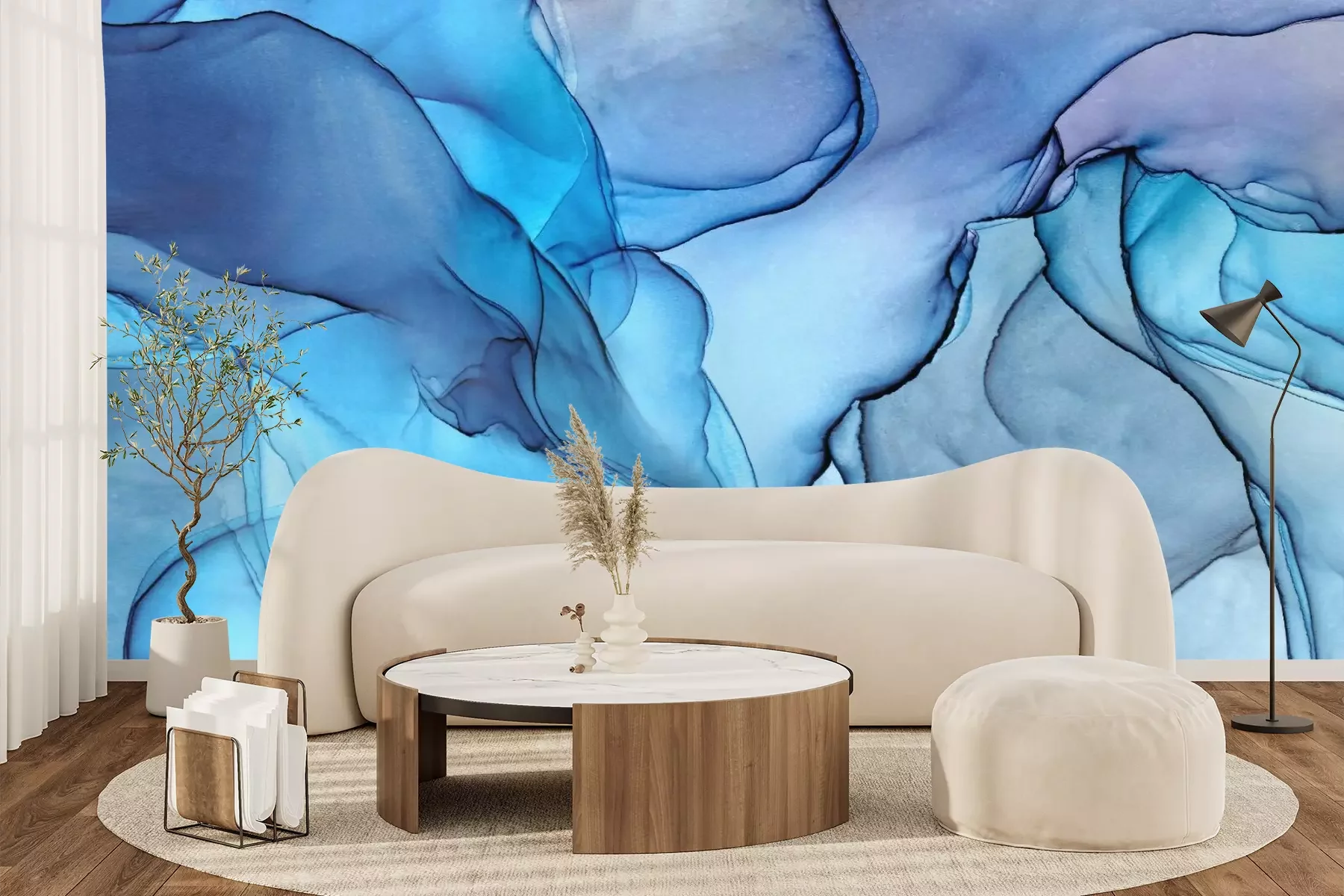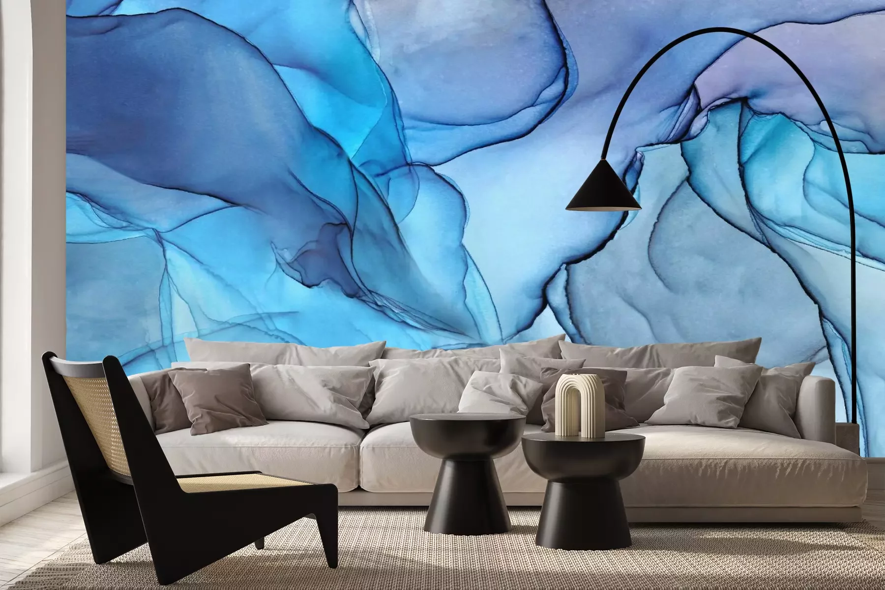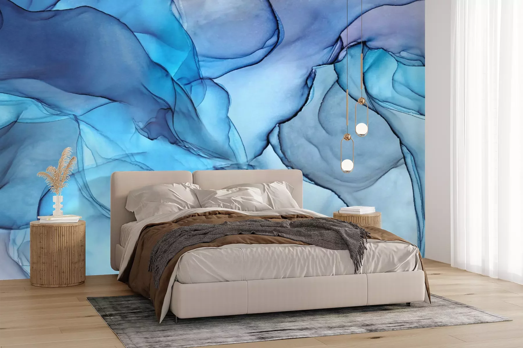 Das Material Premium+ besteht aus einer strukturierten Vinyl-Oberschicht und einem Trägermaterial (Vlies) mit einer Grammatur von 255 g/m², das kleine Unebenheiten der Wand zuverlässig kaschiert. Die feine Sandstruktur verleiht der Oberfläche eine luxuriöse Haptik, während das halbmatte Finish die Tiefe der Farben betont. Das Material ist dampfdurchlässig – so kann diese Fototapete auch in Küchen und Badezimmern eingesetzt werden. Die maximale Breite einer Tapetenbahn beträgt 100 cm. Bei größeren Abmessungen besteht die Fototapete aus mehreren gleich großen Bahnen. Der Kleber wird direkt auf die Wand aufgetragen, und die Fototapete wird auf Stoß angebracht, was für einen ästhetischen Effekt ohne sichtbare Fugen sorgt. Die Oberfläche ist pflegeleicht und kann bei Bedarf sanft mit einem feuchten Tuch abgewischt werden.