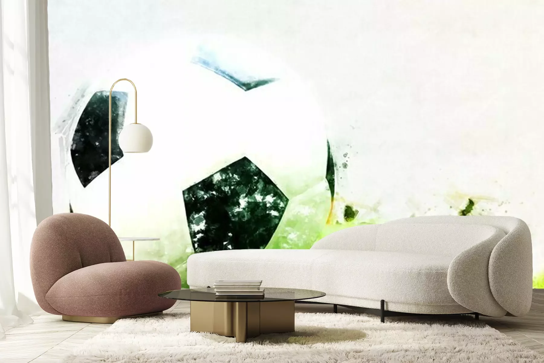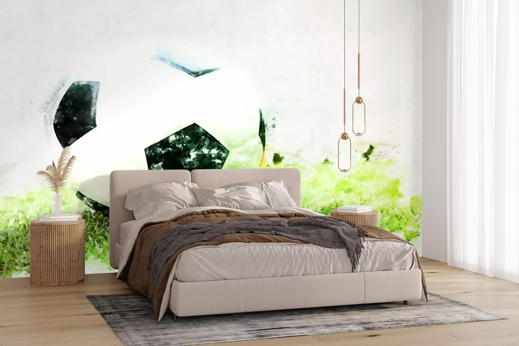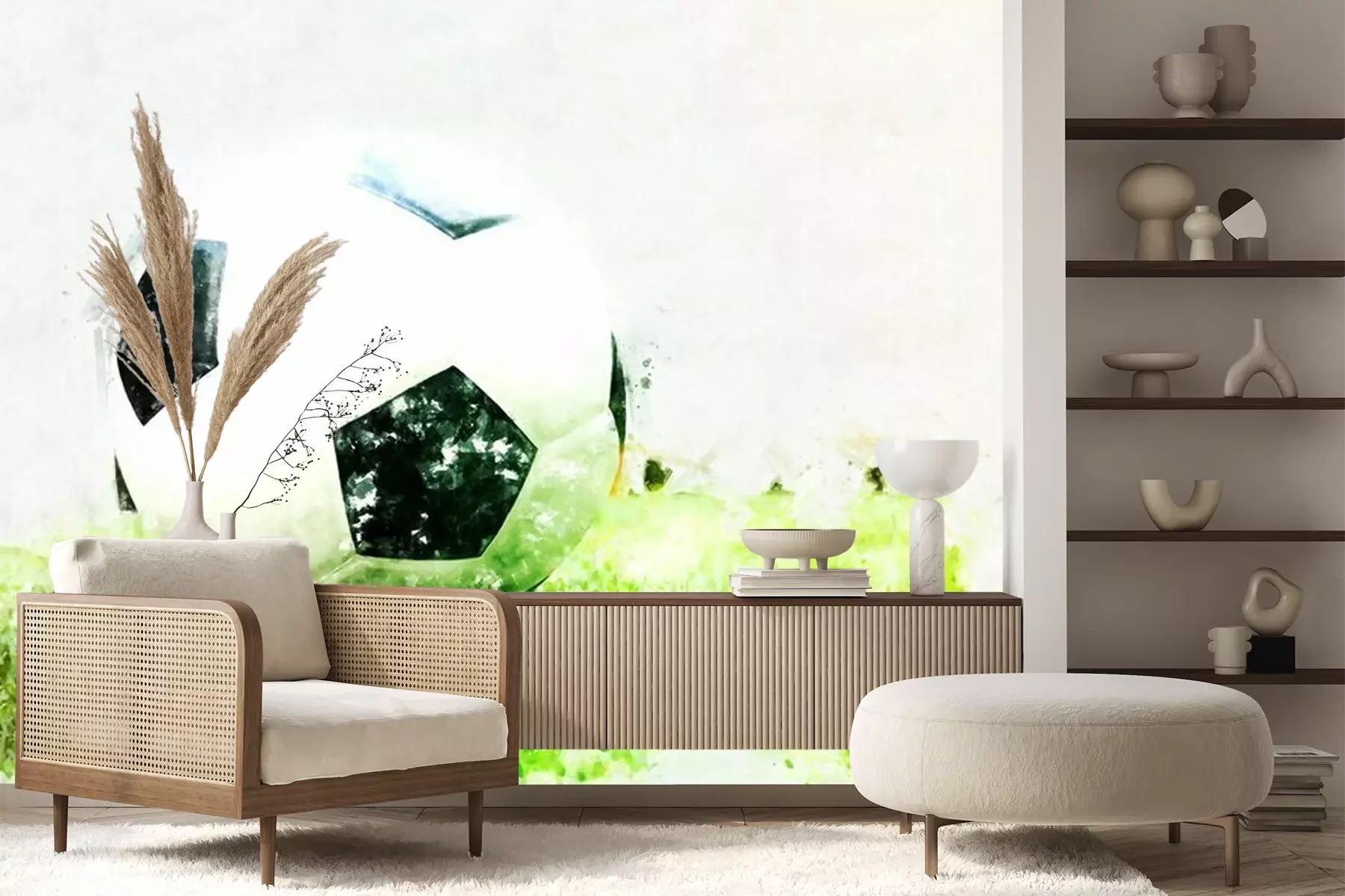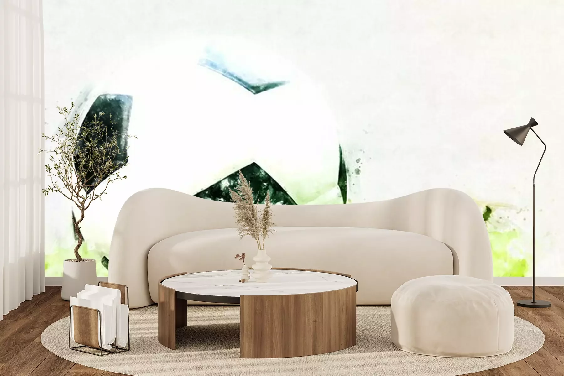 Fototapete Abstrakter Fußballball auf Aquarellmalereihintergrund des grünen Grases.