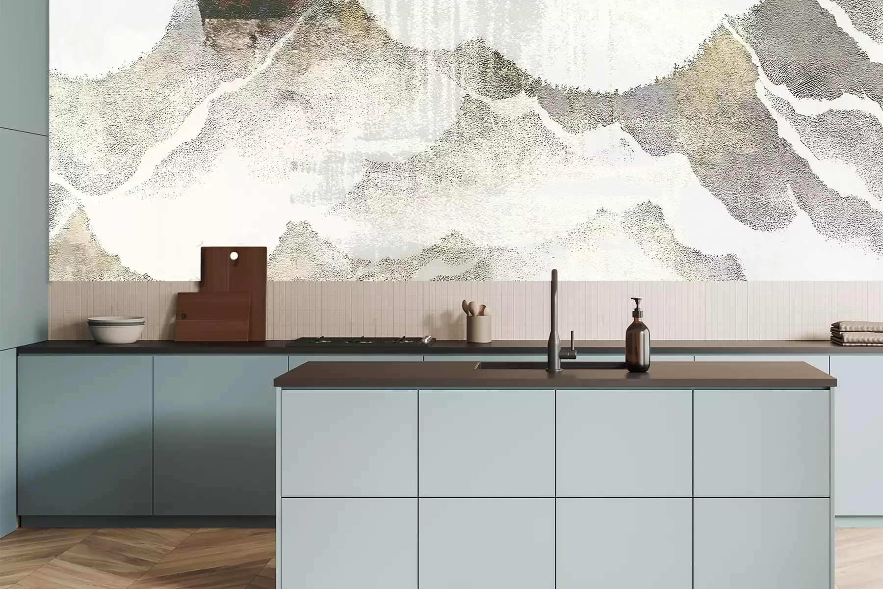 Das Material Premium+ besteht aus einer strukturierten Vinyl-Oberschicht und einem Trägermaterial (Vlies) mit einer Grammatur von 255 g/m², das kleine Unebenheiten der Wand zuverlässig kaschiert. Die feine Sandstruktur verleiht der Oberfläche eine luxuriöse Haptik, während das halbmatte Finish die Tiefe der Farben betont. Das Material ist dampfdurchlässig – so kann diese Fototapete auch in Küchen und Badezimmern eingesetzt werden. Die maximale Breite einer Tapetenbahn beträgt 100 cm. Bei größeren Abmessungen besteht die Fototapete aus mehreren gleich großen Bahnen. Der Kleber wird direkt auf die Wand aufgetragen, und die Fototapete wird auf Stoß angebracht, was für einen ästhetischen Effekt ohne sichtbare Fugen sorgt. Die Oberfläche ist pflegeleicht und kann bei Bedarf sanft mit einem feuchten Tuch abgewischt werden.