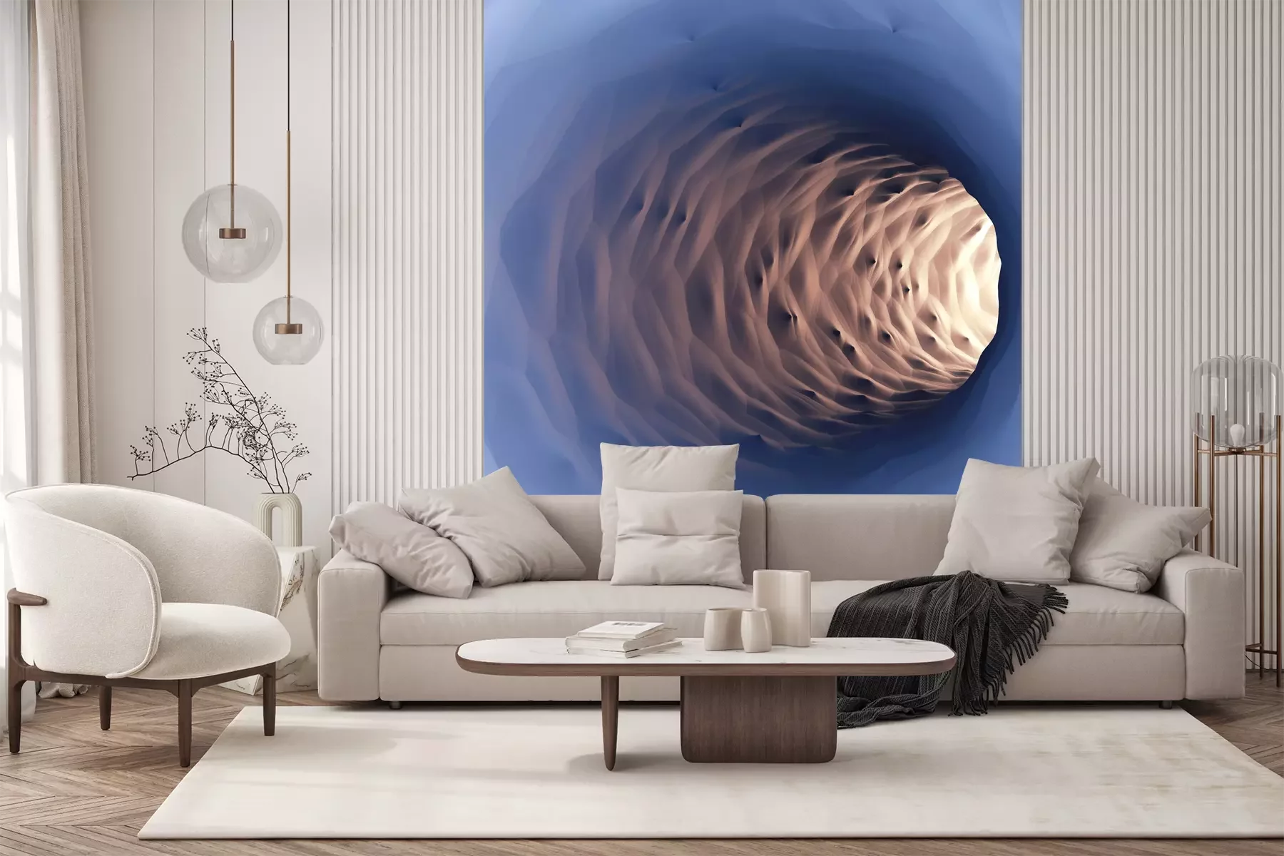 Das Material Premium+ besteht aus einer strukturierten Vinyl-Oberschicht und einem Trägermaterial (Vlies) mit einer Grammatur von 255 g/m², das kleine Unebenheiten der Wand zuverlässig kaschiert. Die feine Sandstruktur verleiht der Oberfläche eine luxuriöse Haptik, während das halbmatte Finish die Tiefe der Farben betont. Das Material ist dampfdurchlässig – so kann diese Fototapete auch in Küchen und Badezimmern eingesetzt werden. Die maximale Breite einer Tapetenbahn beträgt 100 cm. Bei größeren Abmessungen besteht die Fototapete aus mehreren gleich großen Bahnen. Der Kleber wird direkt auf die Wand aufgetragen, und die Fototapete wird auf Stoß angebracht, was für einen ästhetischen Effekt ohne sichtbare Fugen sorgt. Die Oberfläche ist pflegeleicht und kann bei Bedarf sanft mit einem feuchten Tuch abgewischt werden.
