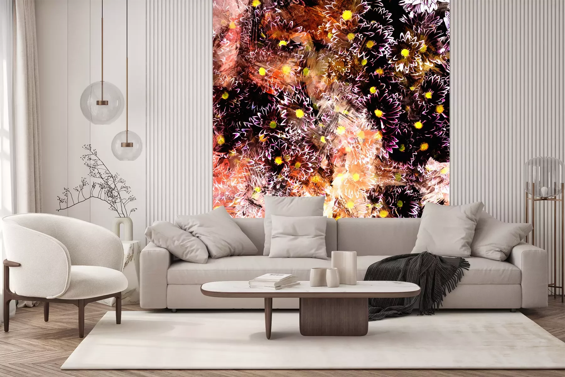 Das Material Premium+ besteht aus einer strukturierten Vinyl-Oberschicht und einem Trägermaterial (Vlies) mit einer Grammatur von 255 g/m², das kleine Unebenheiten der Wand zuverlässig kaschiert. Die feine Sandstruktur verleiht der Oberfläche eine luxuriöse Haptik, während das halbmatte Finish die Tiefe der Farben betont. Das Material ist dampfdurchlässig – so kann diese Fototapete auch in Küchen und Badezimmern eingesetzt werden. Die maximale Breite einer Tapetenbahn beträgt 100 cm. Bei größeren Abmessungen besteht die Fototapete aus mehreren gleich großen Bahnen. Der Kleber wird direkt auf die Wand aufgetragen, und die Fototapete wird auf Stoß angebracht, was für einen ästhetischen Effekt ohne sichtbare Fugen sorgt. Die Oberfläche ist pflegeleicht und kann bei Bedarf sanft mit einem feuchten Tuch abgewischt werden.