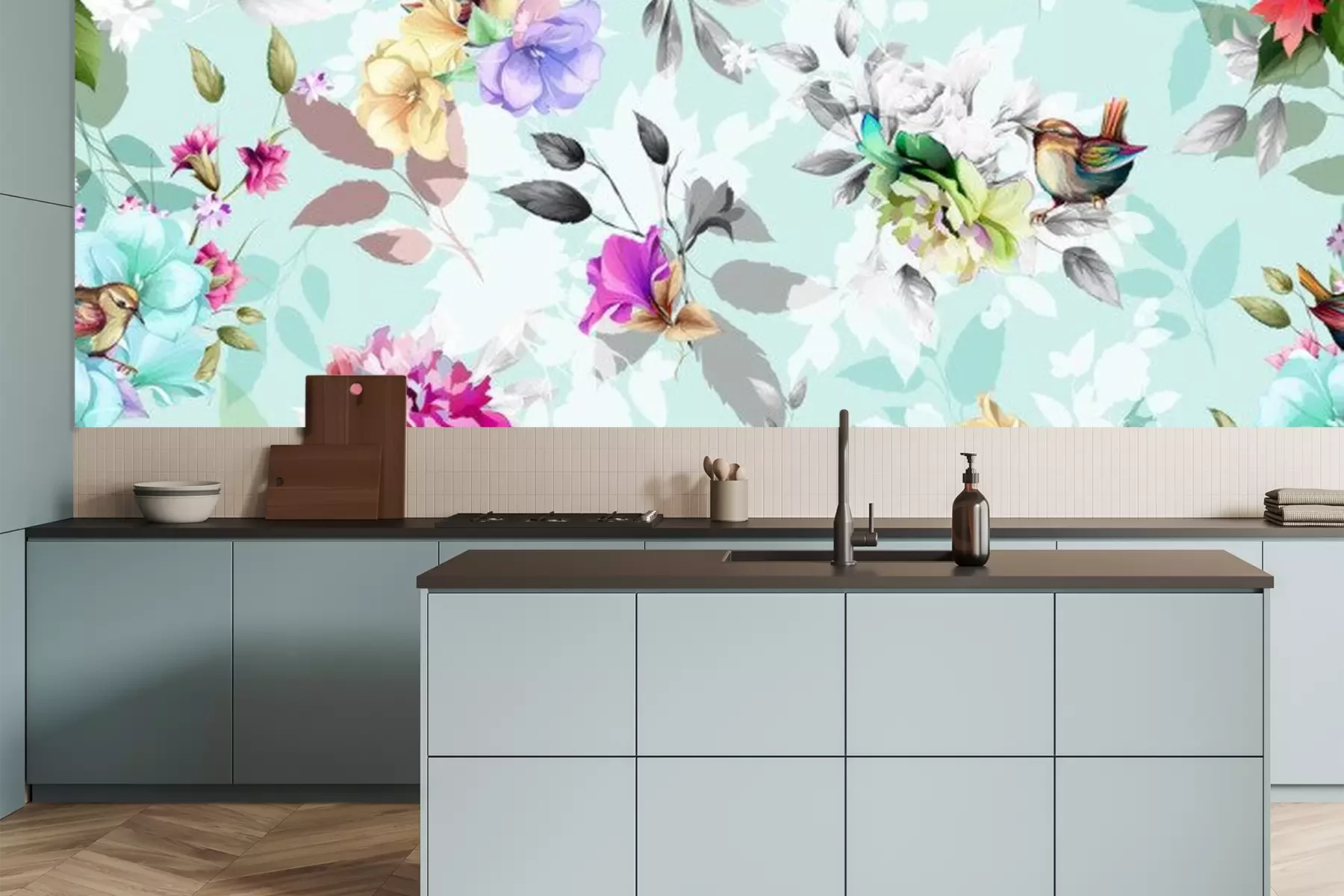 Fototapete Abstraktes Muster mit Vögeln inmitten von wilden Blumen
