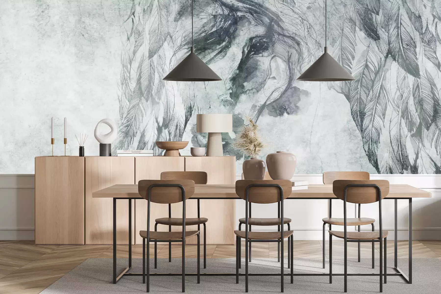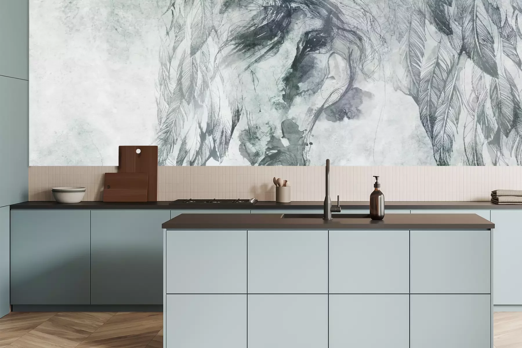 Das Material Premium+ besteht aus einer strukturierten Vinyl-Oberschicht und einem Trägermaterial (Vlies) mit einer Grammatur von 255 g/m², das kleine Unebenheiten der Wand zuverlässig kaschiert. Die feine Sandstruktur verleiht der Oberfläche eine luxuriöse Haptik, während das halbmatte Finish die Tiefe der Farben betont. Das Material ist dampfdurchlässig – so kann diese Fototapete auch in Küchen und Badezimmern eingesetzt werden. Die maximale Breite einer Tapetenbahn beträgt 100 cm. Bei größeren Abmessungen besteht die Fototapete aus mehreren gleich großen Bahnen. Der Kleber wird direkt auf die Wand aufgetragen, und die Fototapete wird auf Stoß angebracht, was für einen ästhetischen Effekt ohne sichtbare Fugen sorgt. Die Oberfläche ist pflegeleicht und kann bei Bedarf sanft mit einem feuchten Tuch abgewischt werden.
