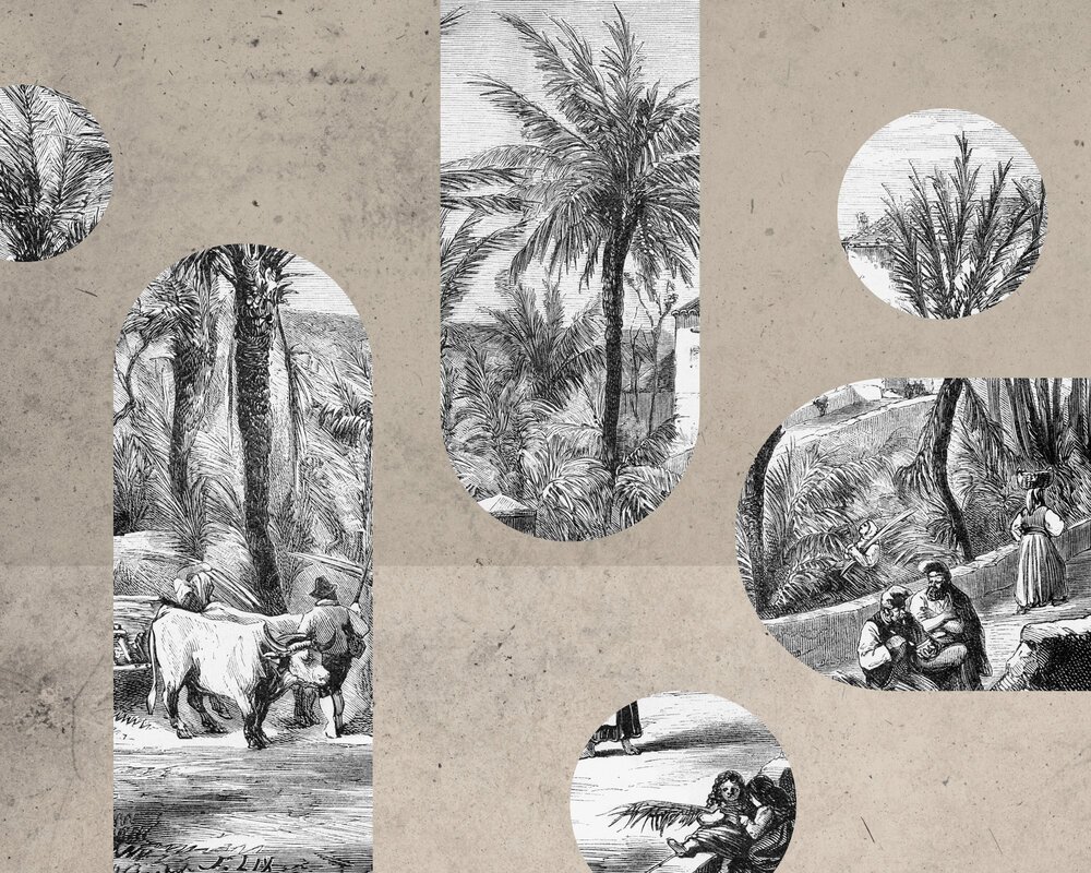 Fototapete: Alte palmfarbene Radierungen mit Darstellungen landwirtschaftlicher Arbeiten