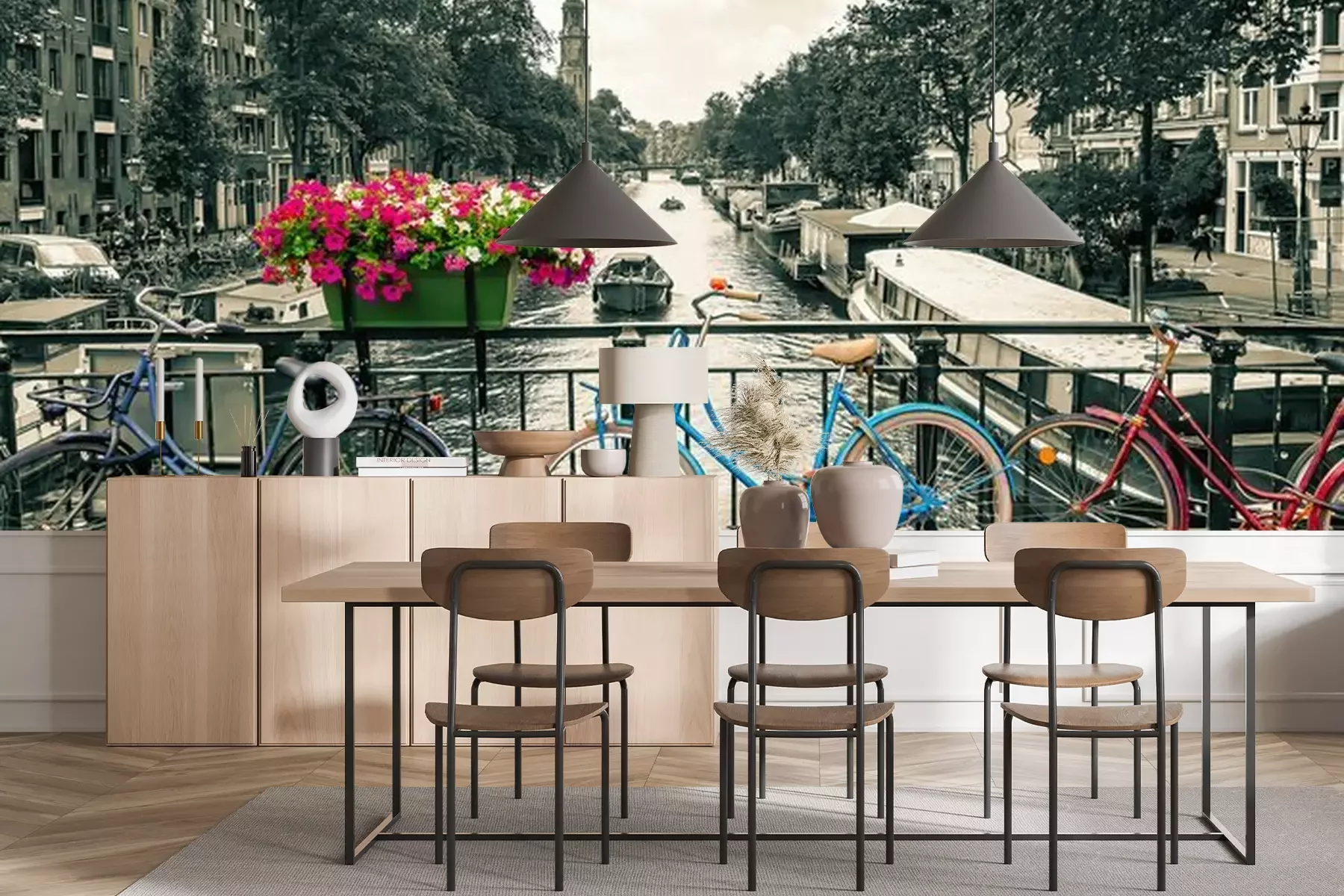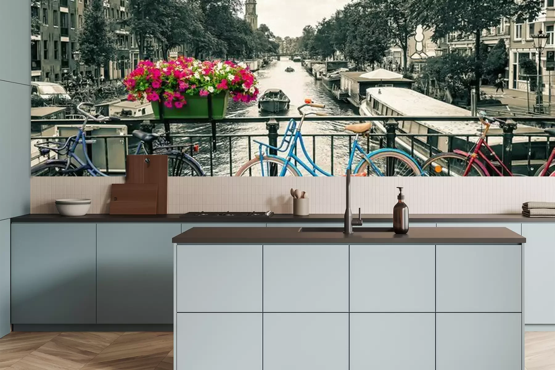 Fototapete Amsterdam - Black and white photo with colored bicycles