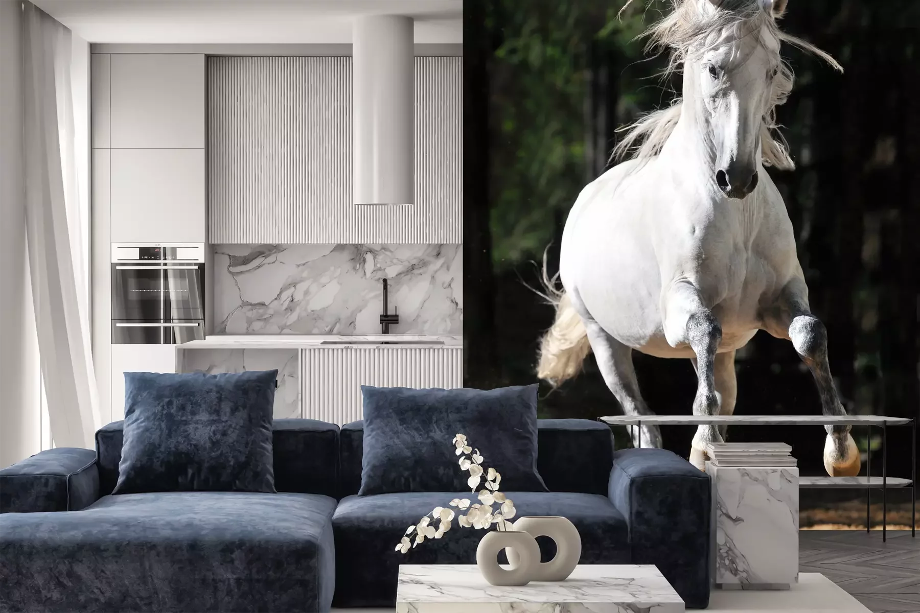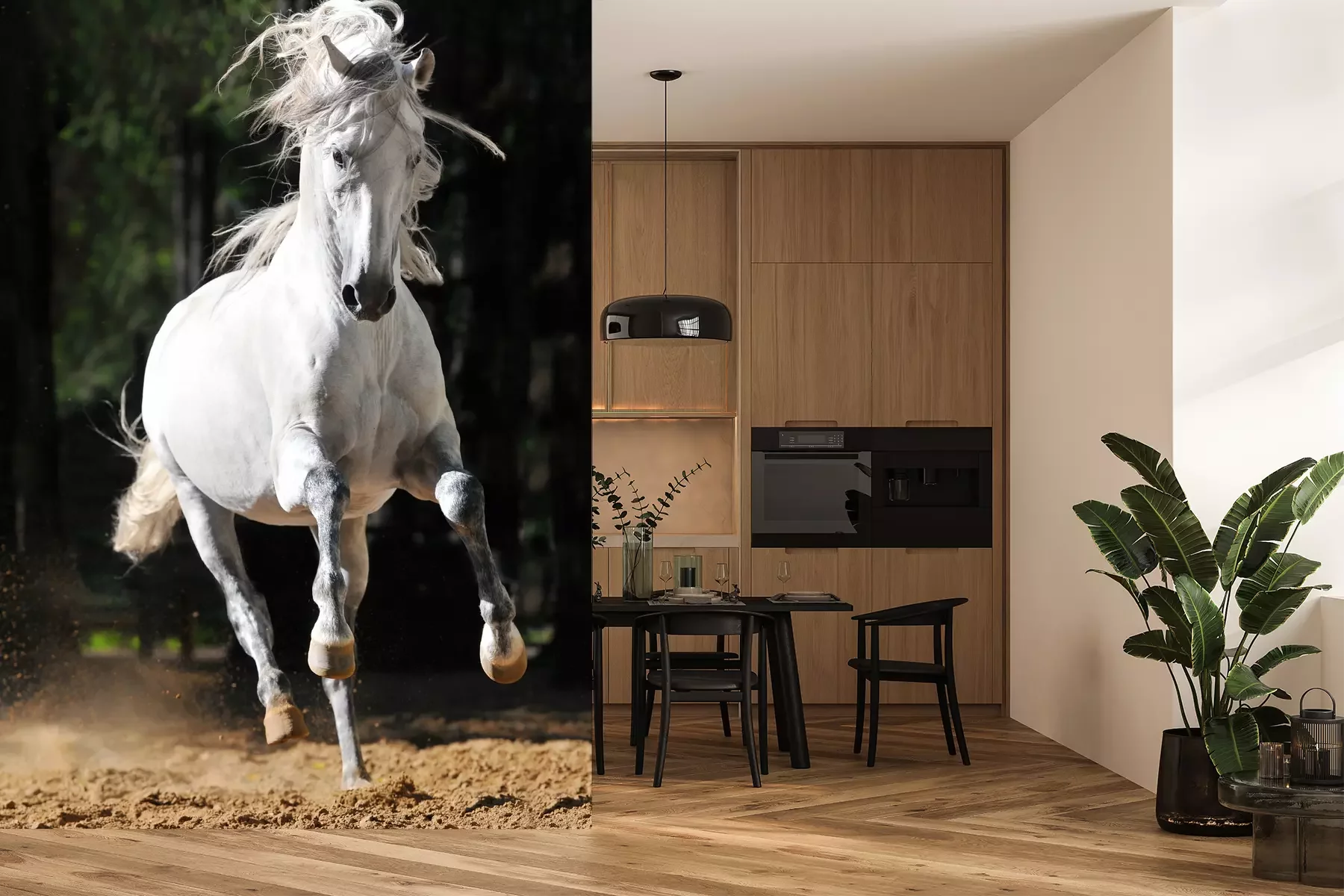 Das Material Premium+ besteht aus einer strukturierten Vinyl-Oberschicht und einem Trägermaterial (Vlies) mit einer Grammatur von 255 g/m², das kleine Unebenheiten der Wand zuverlässig kaschiert. Die feine Sandstruktur verleiht der Oberfläche eine luxuriöse Haptik, während das halbmatte Finish die Tiefe der Farben betont. Das Material ist dampfdurchlässig – so kann diese Fototapete auch in Küchen und Badezimmern eingesetzt werden. Die maximale Breite einer Tapetenbahn beträgt 100 cm. Bei größeren Abmessungen besteht die Fototapete aus mehreren gleich großen Bahnen. Der Kleber wird direkt auf die Wand aufgetragen, und die Fototapete wird auf Stoß angebracht, was für einen ästhetischen Effekt ohne sichtbare Fugen sorgt. Die Oberfläche ist pflegeleicht und kann bei Bedarf sanft mit einem feuchten Tuch abgewischt werden.