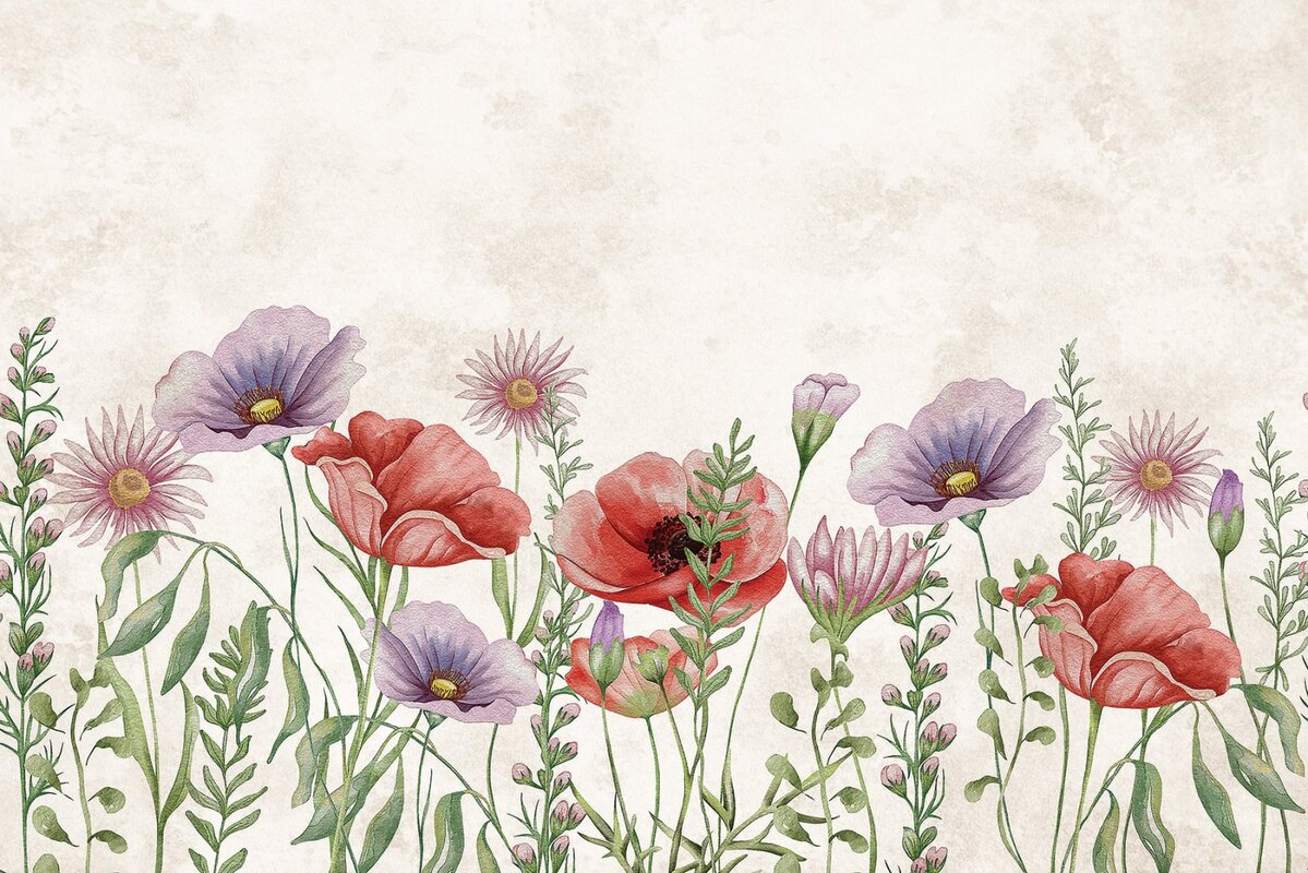 Fototapete: Aquarell-Mohnblumen und Wildblumen in Violett- und Rosatönen