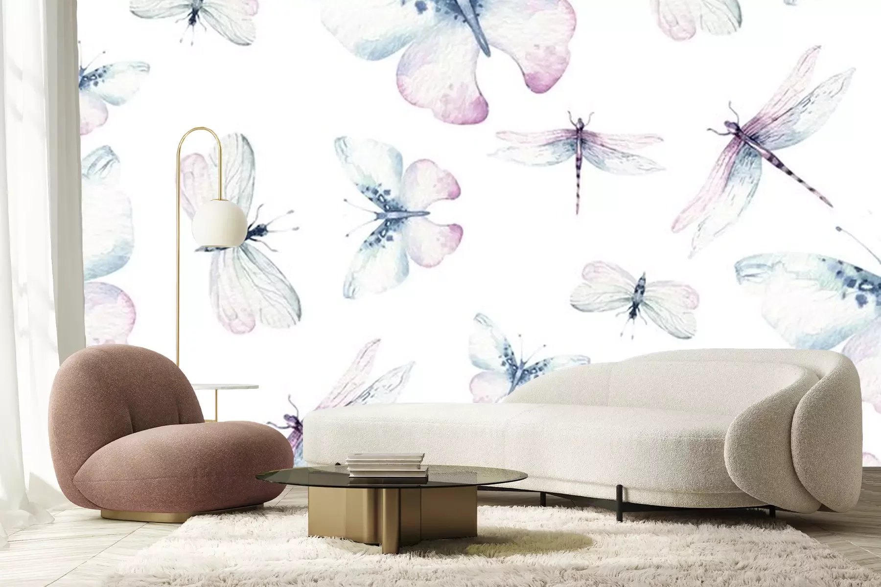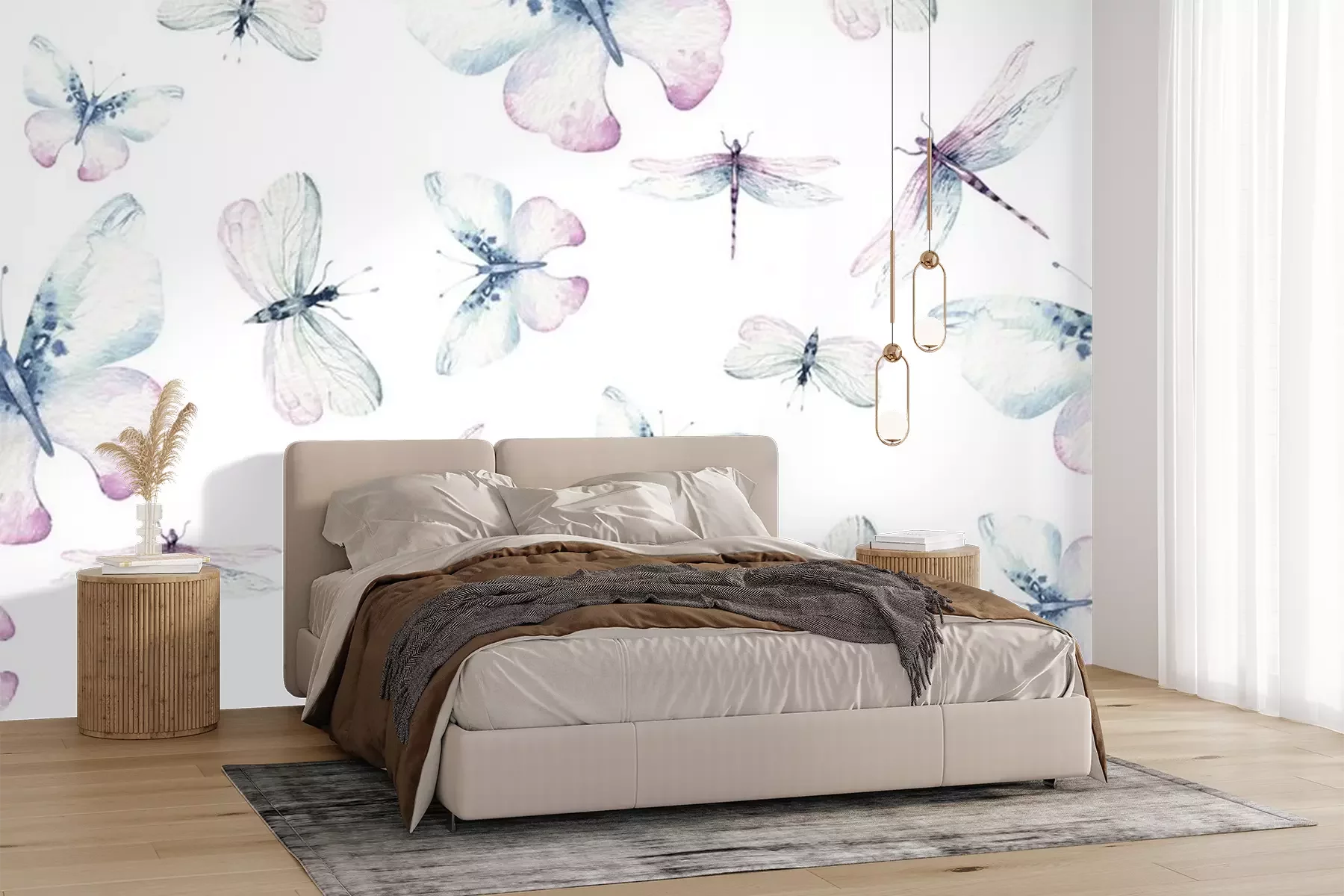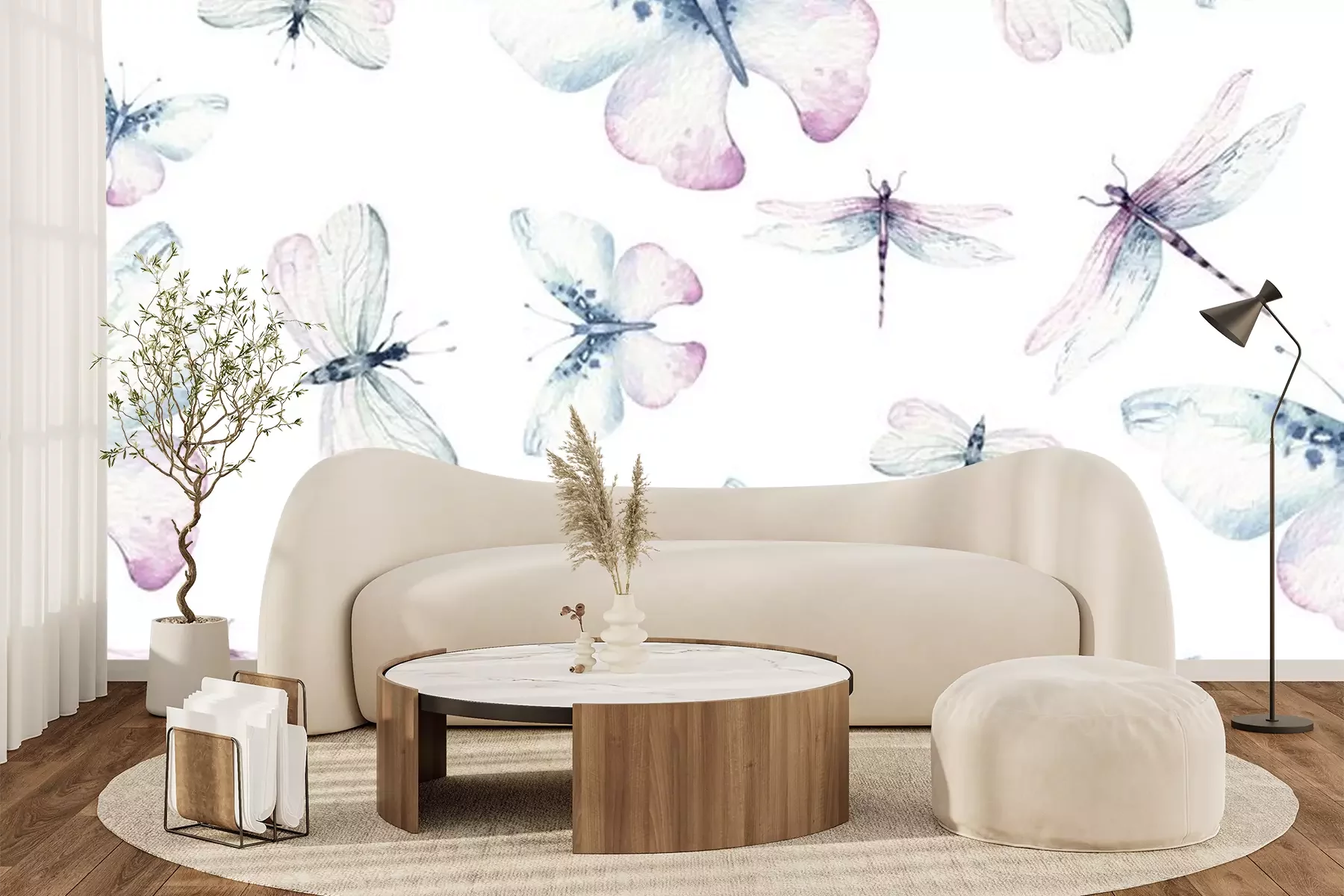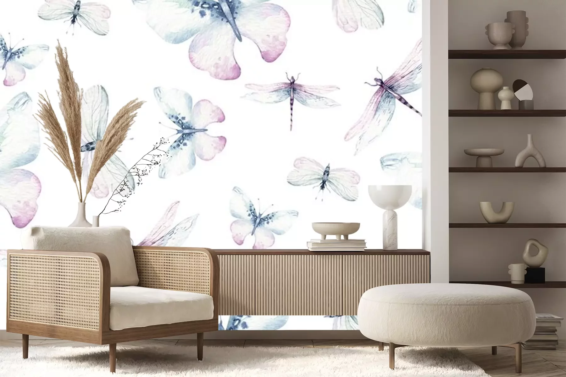 Fototapete Aquarell-Schmetterlinge und Libellen auf weißem Hintergrund