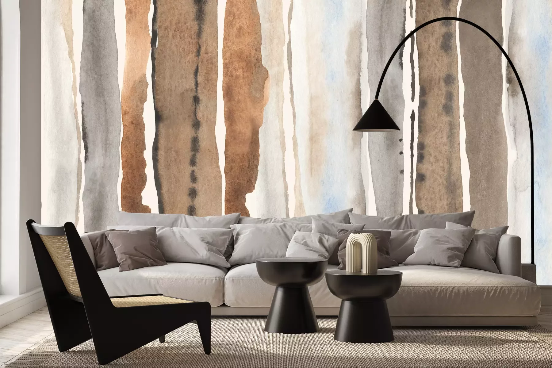 Das Material Premium+ besteht aus einer strukturierten Vinyl-Oberschicht und einem Trägermaterial (Vlies) mit einer Grammatur von 255 g/m², das kleine Unebenheiten der Wand zuverlässig kaschiert. Die feine Sandstruktur verleiht der Oberfläche eine luxuriöse Haptik, während das halbmatte Finish die Tiefe der Farben betont. Das Material ist dampfdurchlässig – so kann diese Fototapete auch in Küchen und Badezimmern eingesetzt werden. Die maximale Breite einer Tapetenbahn beträgt 100 cm. Bei größeren Abmessungen besteht die Fototapete aus mehreren gleich großen Bahnen. Der Kleber wird direkt auf die Wand aufgetragen, und die Fototapete wird auf Stoß angebracht, was für einen ästhetischen Effekt ohne sichtbare Fugen sorgt. Die Oberfläche ist pflegeleicht und kann bei Bedarf sanft mit einem feuchten Tuch abgewischt werden.