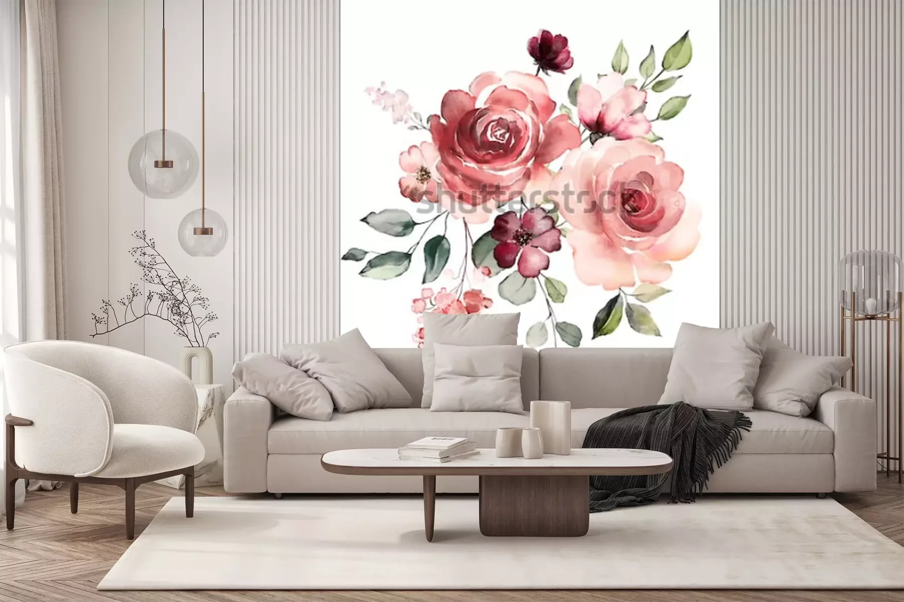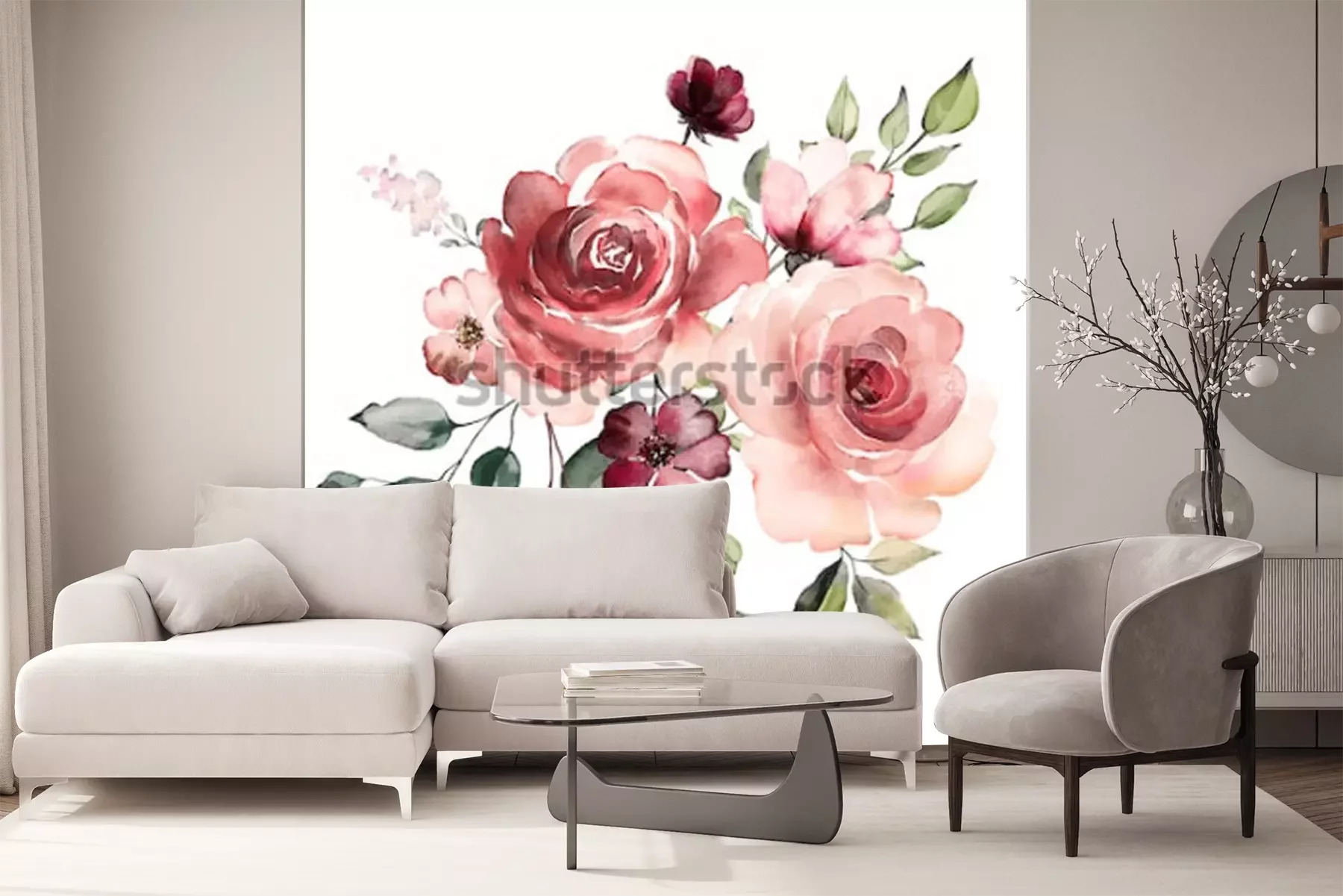 Fototapete Aquarellstrauß aus Rosen und Blättern