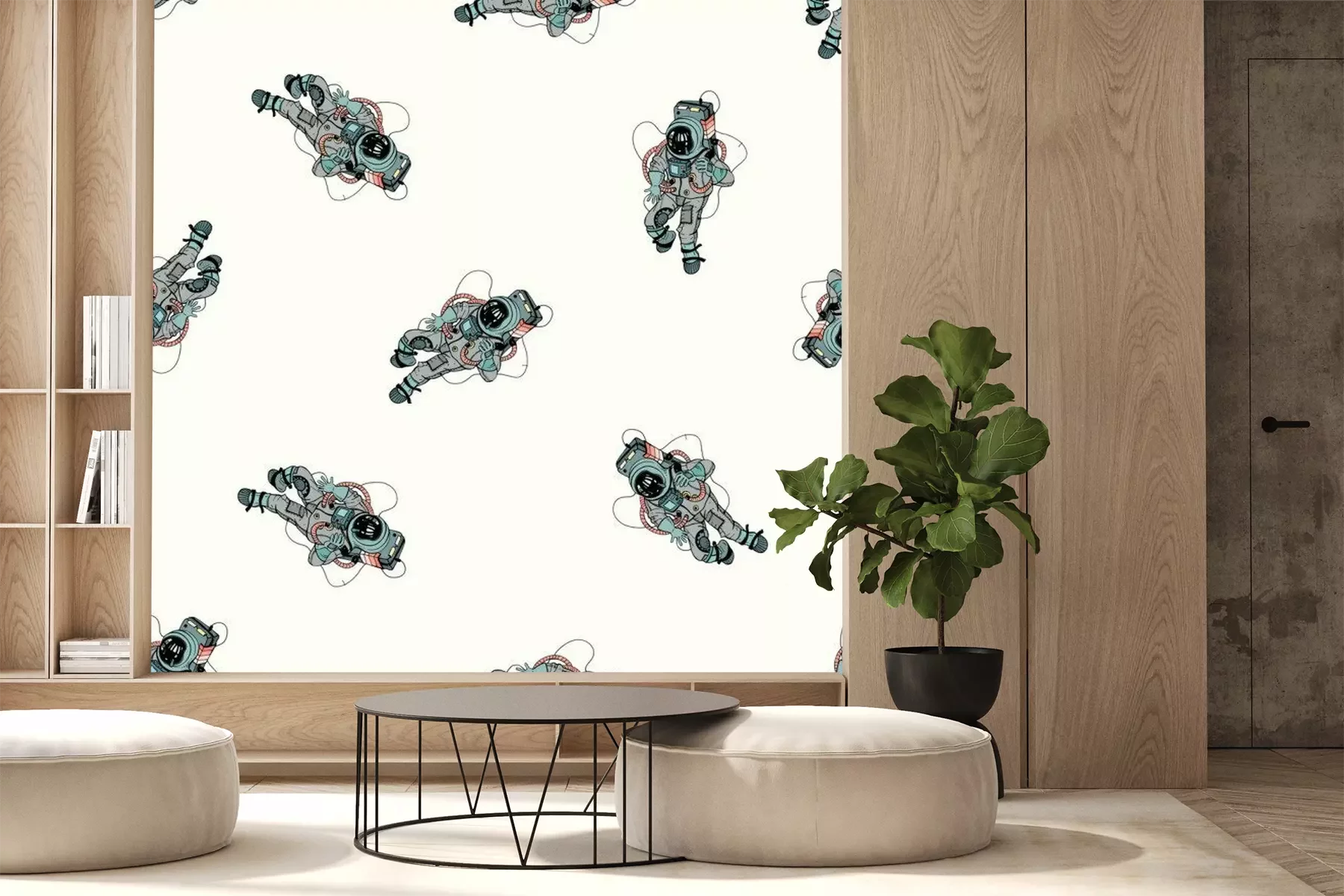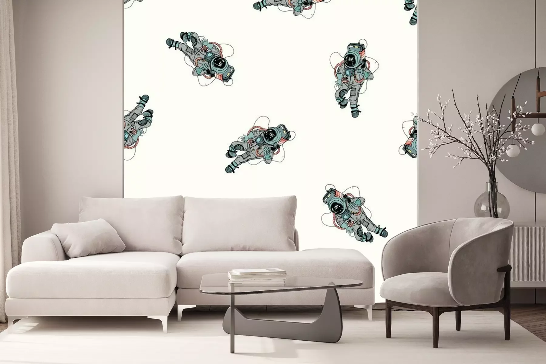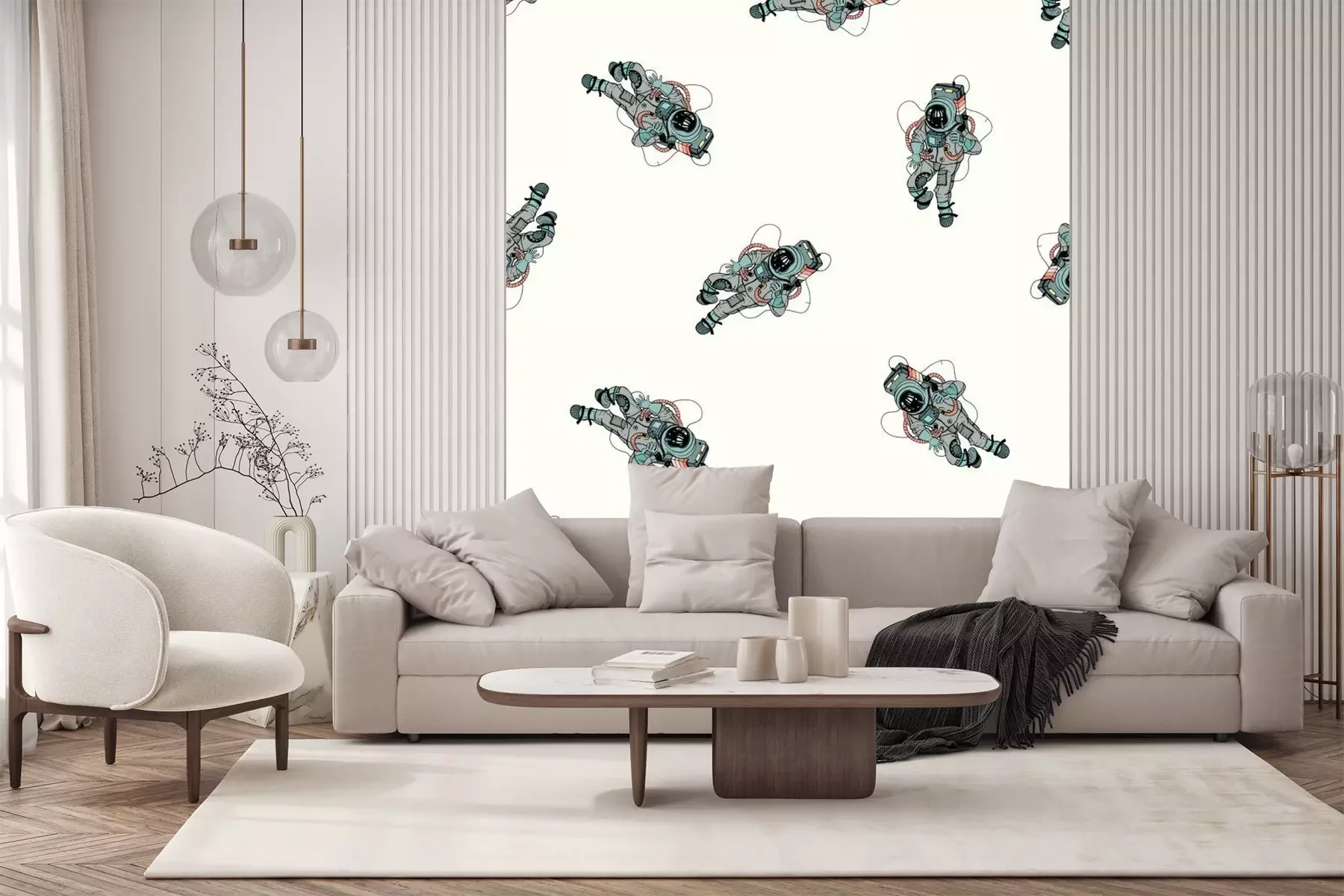 Fototapete Astronaut im Raumanzug nahtlose Muster. Kosmonaut im Raum auf weißem Hintergrund. Bunte Vektor-Illustration.