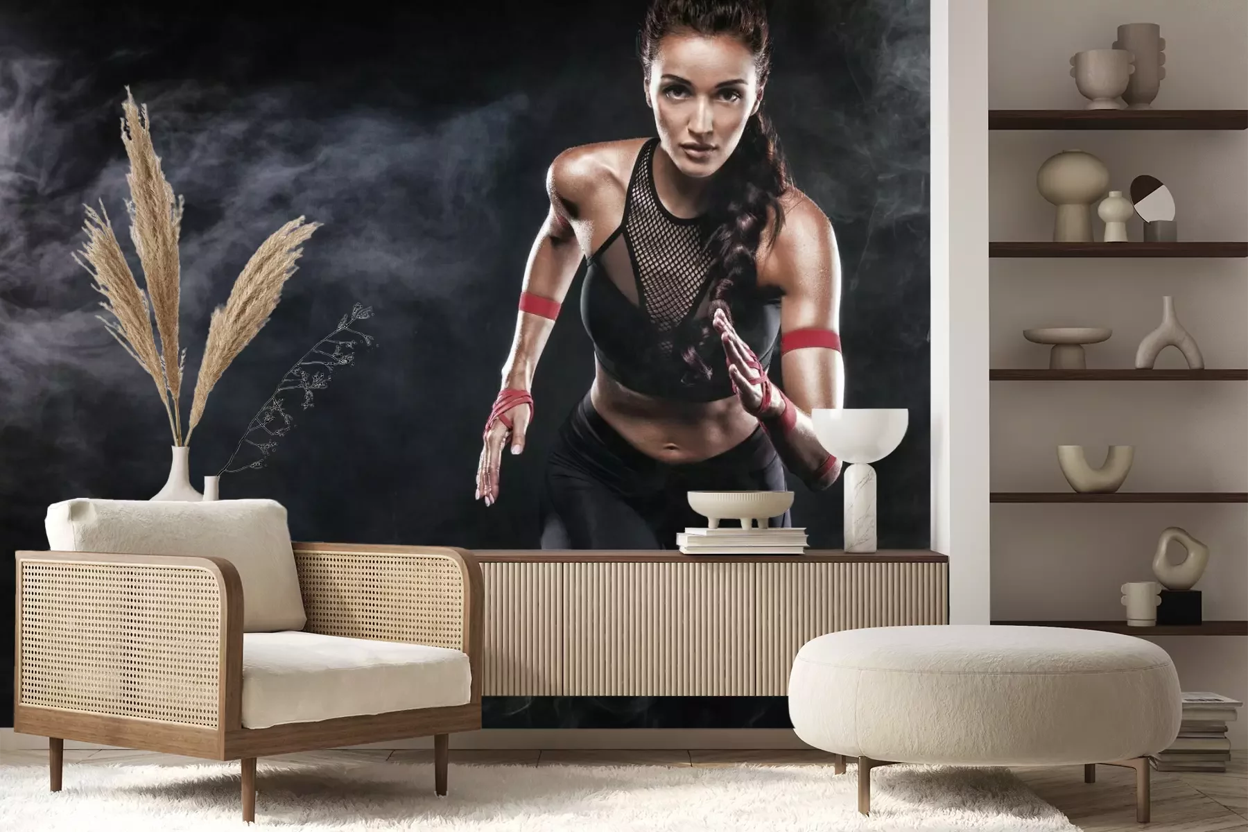 Das Material Premium+ besteht aus einer strukturierten Vinyl-Oberschicht und einem Trägermaterial (Vlies) mit einer Grammatur von 255 g/m², das kleine Unebenheiten der Wand zuverlässig kaschiert. Die feine Sandstruktur verleiht der Oberfläche eine luxuriöse Haptik, während das halbmatte Finish die Tiefe der Farben betont. Das Material ist dampfdurchlässig – so kann diese Fototapete auch in Küchen und Badezimmern eingesetzt werden. Die maximale Breite einer Tapetenbahn beträgt 100 cm. Bei größeren Abmessungen besteht die Fototapete aus mehreren gleich großen Bahnen. Der Kleber wird direkt auf die Wand aufgetragen, und die Fototapete wird auf Stoß angebracht, was für einen ästhetischen Effekt ohne sichtbare Fugen sorgt. Die Oberfläche ist pflegeleicht und kann bei Bedarf sanft mit einem feuchten Tuch abgewischt werden.