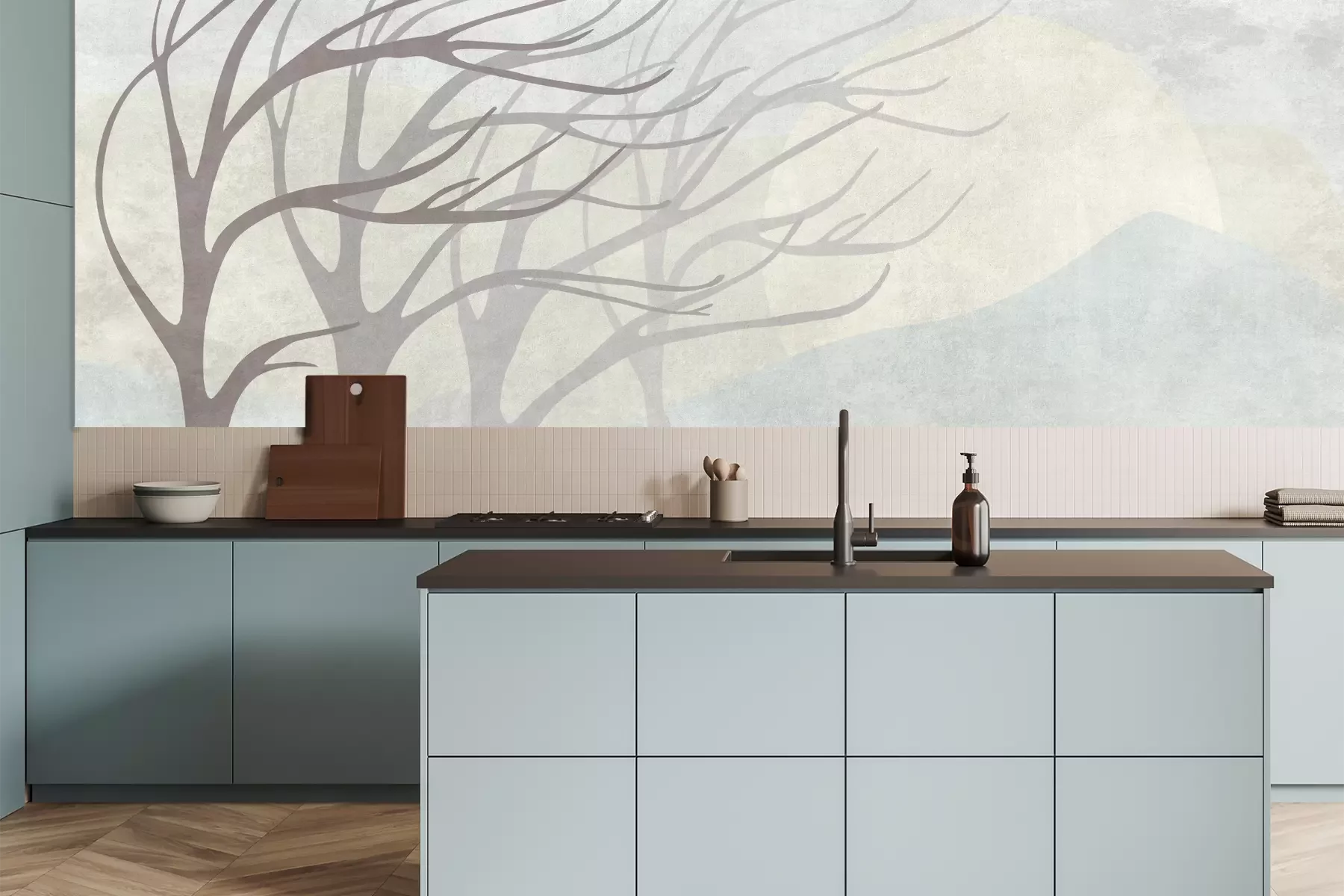 Das Material Premium+ besteht aus einer strukturierten Vinyl-Oberschicht und einem Trägermaterial (Vlies) mit einer Grammatur von 255 g/m², das kleine Unebenheiten der Wand zuverlässig kaschiert. Die feine Sandstruktur verleiht der Oberfläche eine luxuriöse Haptik, während das halbmatte Finish die Tiefe der Farben betont. Das Material ist dampfdurchlässig – so kann diese Fototapete auch in Küchen und Badezimmern eingesetzt werden. Die maximale Breite einer Tapetenbahn beträgt 100 cm. Bei größeren Abmessungen besteht die Fototapete aus mehreren gleich großen Bahnen. Der Kleber wird direkt auf die Wand aufgetragen, und die Fototapete wird auf Stoß angebracht, was für einen ästhetischen Effekt ohne sichtbare Fugen sorgt. Die Oberfläche ist pflegeleicht und kann bei Bedarf sanft mit einem feuchten Tuch abgewischt werden.
