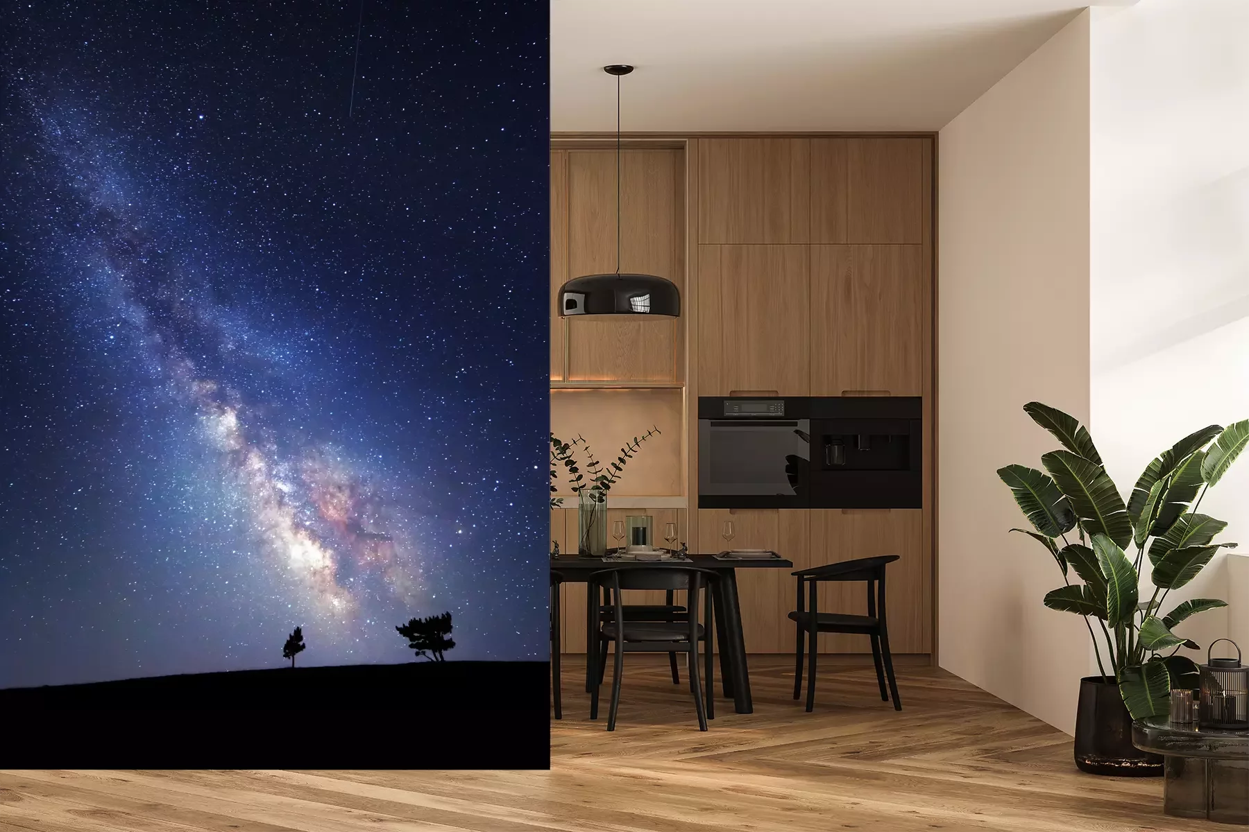 Das Material Premium+ besteht aus einer strukturierten Vinyl-Oberschicht und einem Trägermaterial (Vlies) mit einer Grammatur von 255 g/m², das kleine Unebenheiten der Wand zuverlässig kaschiert. Die feine Sandstruktur verleiht der Oberfläche eine luxuriöse Haptik, während das halbmatte Finish die Tiefe der Farben betont. Das Material ist dampfdurchlässig – so kann diese Fototapete auch in Küchen und Badezimmern eingesetzt werden. Die maximale Breite einer Tapetenbahn beträgt 100 cm. Bei größeren Abmessungen besteht die Fototapete aus mehreren gleich großen Bahnen. Der Kleber wird direkt auf die Wand aufgetragen, und die Fototapete wird auf Stoß angebracht, was für einen ästhetischen Effekt ohne sichtbare Fugen sorgt. Die Oberfläche ist pflegeleicht und kann bei Bedarf sanft mit einem feuchten Tuch abgewischt werden.