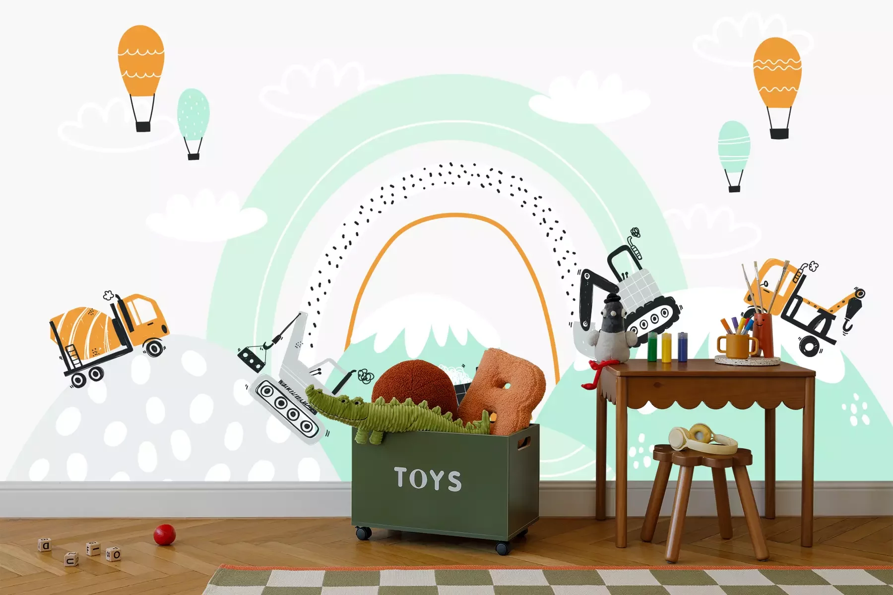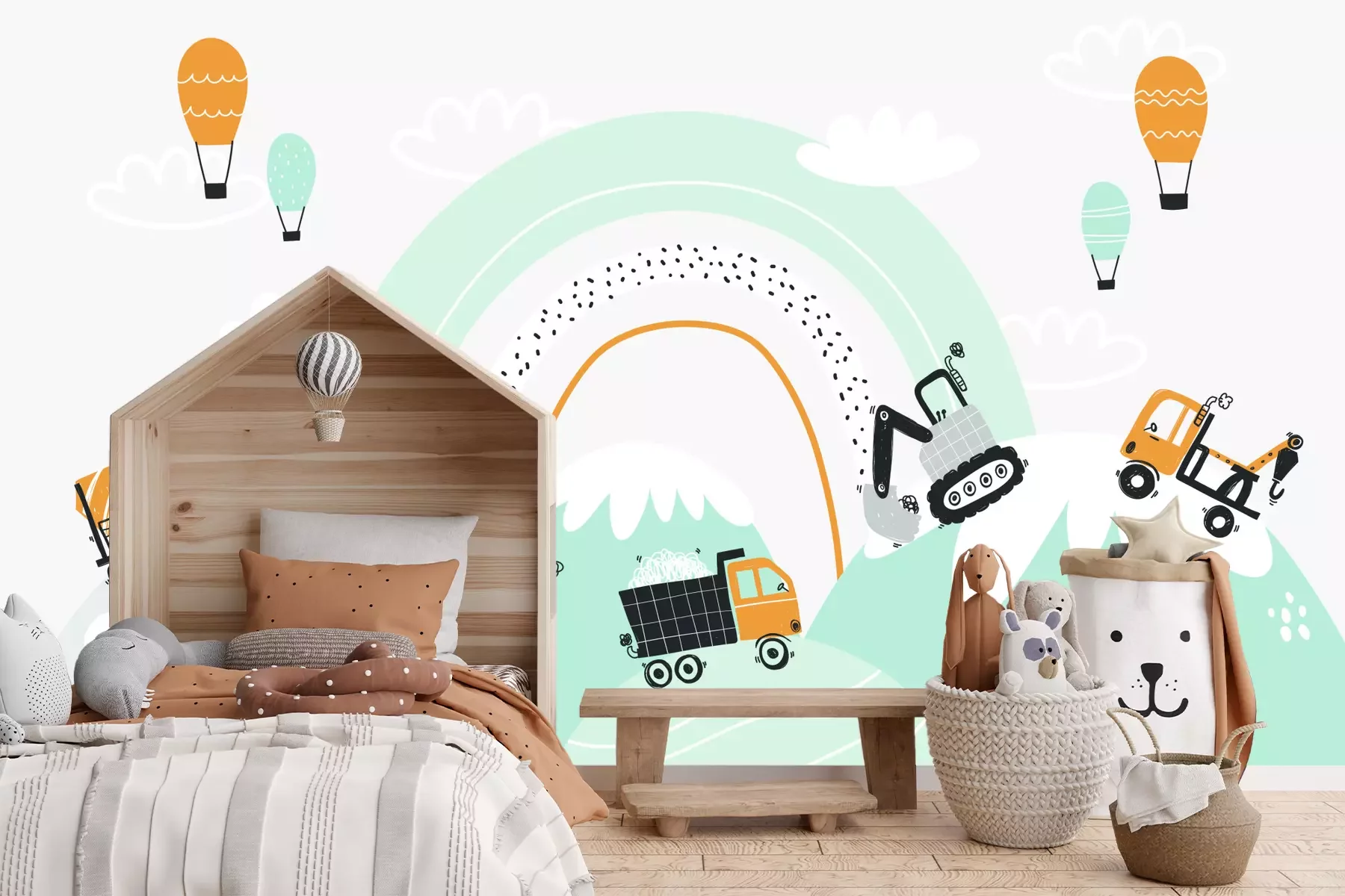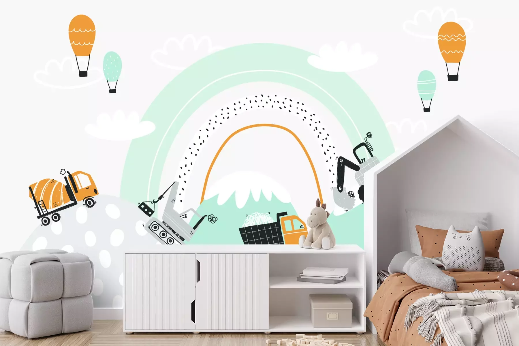 Eine effektvolle und zugleich kostengünstige Möglichkeit, das Kinderzimmer aufzufrischen, ist eine passende Fototapete. Bagger und Baustellenfahrzeuge, die das Hauptthema unseres Produkts bilden, sind die ideale Wahl für das Reich eines kleinen Autofans. Auffällige grafische Elemente vor dem Hintergrund eines Regenbogens wurden im modernen Stil und in einer Pastell-Farbgebung gestaltet. Zarte Grau-, Mintgrün- und Weißtöne sowie belebende honigfarbene Akzente greifen die Farbpalette auf, die oft in skandinavischen Arrangements zu finden ist. Es lohnt sich, dies bei der Planung der Einrichtung des Kinderzimmers zu berücksichtigen, um einen stimmigen und harmonischen Raum zu schaffen. Hier spielt eine wichtige Rolle unsere Fototapete. Zeichnung zu einem bei Jungen beliebten Thema zieht mit ihrer interessanten Komposition alle Blicke auf sich. Charakter verleihen ihr die Linien und Punkte auf der Fototapete. Bagger und andere Elemente auf der Zeichnung regen die Fantasie der Kinder an und schaffen eine inspirierende Umgebung. Dein Kind kann sich in seinem Zimmer entspannen, aber auch jeden Tag in vollen Zügen genießen – mit einer märchenhaften Fototapete. Fahrzeuge, die sich zu einem rhythmischen Band formieren, erfüllen nicht nur eine dekorative Funktion, sondern können auch zu kreativen Spielen anregen. Du musst dir jedoch keine Sorgen machen, dass dabei Schäden auf der Fototapete entstehen. Durch die hohe Qualität unseres Produkts ist sie besonders kratzfest. Die einfache Reinigung der Oberfläche ist ein weiterer Vorteil – besonders wichtig in einem Raum, der von den jüngsten Familienmitgliedern genutzt wird. Auch für sie produzieren wir unsere Fototapete. Fahrzeuge in Pastelltönen machen sich nicht nur in privaten Räumen schön, sondern auch in Kindergärten, Schulen oder Spielzimmern. Du kannst sicher sein, dass dank der hohen Druckqualität alle grafischen Elemente lange ihre ursprünglichen Farben behalten. Die verschiedenen Farbtöne harmonieren wunderbar mit Innenräumen, die mit Holzmöbeln und Accessoires wie Wolkenkissen, Fahrzeugpostern oder Leinenvorhängen ausgestattet sind. Außerdem musst du dir keine Sorgen um die Anbringung dieser Fototapete für Jungen machen, denn sie wurde aus einem Material gefertigt, das die Bildung von Luftblasen verhindert. Dadurch verläuft die Montage reibungslos und das Endergebnis begeistert durch Ästhetik und Langlebigkeit.