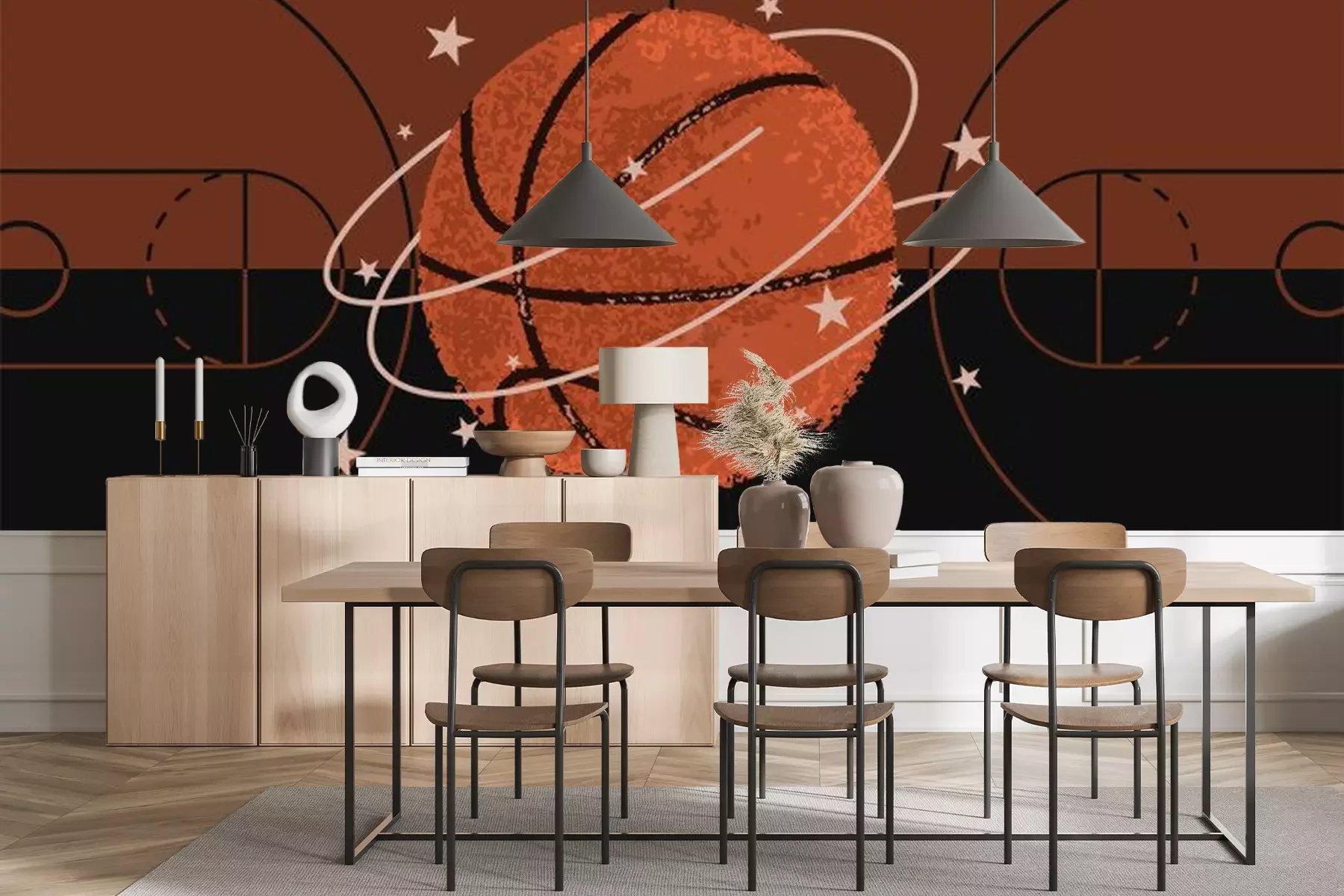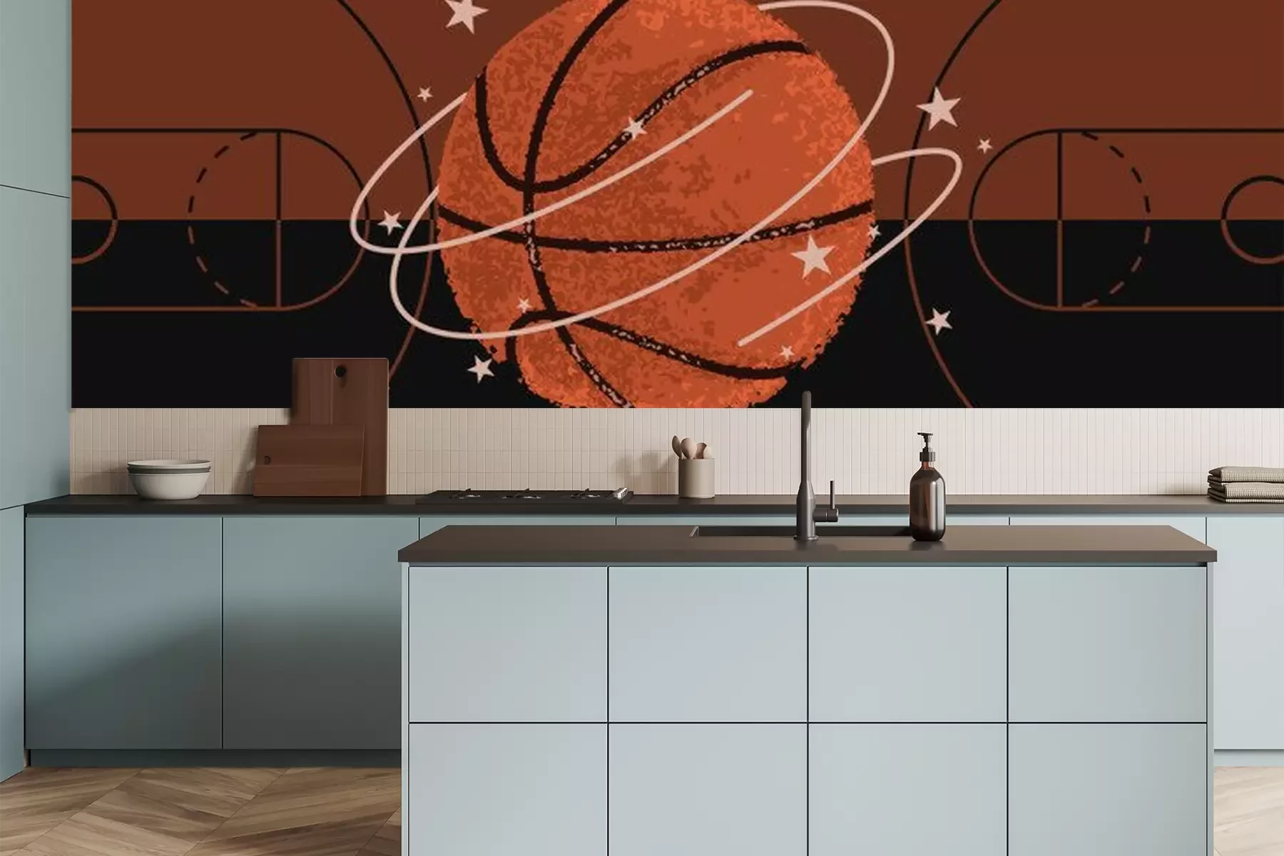 Fototapete Ball vor dem Hintergrund eines Basketballfeldes