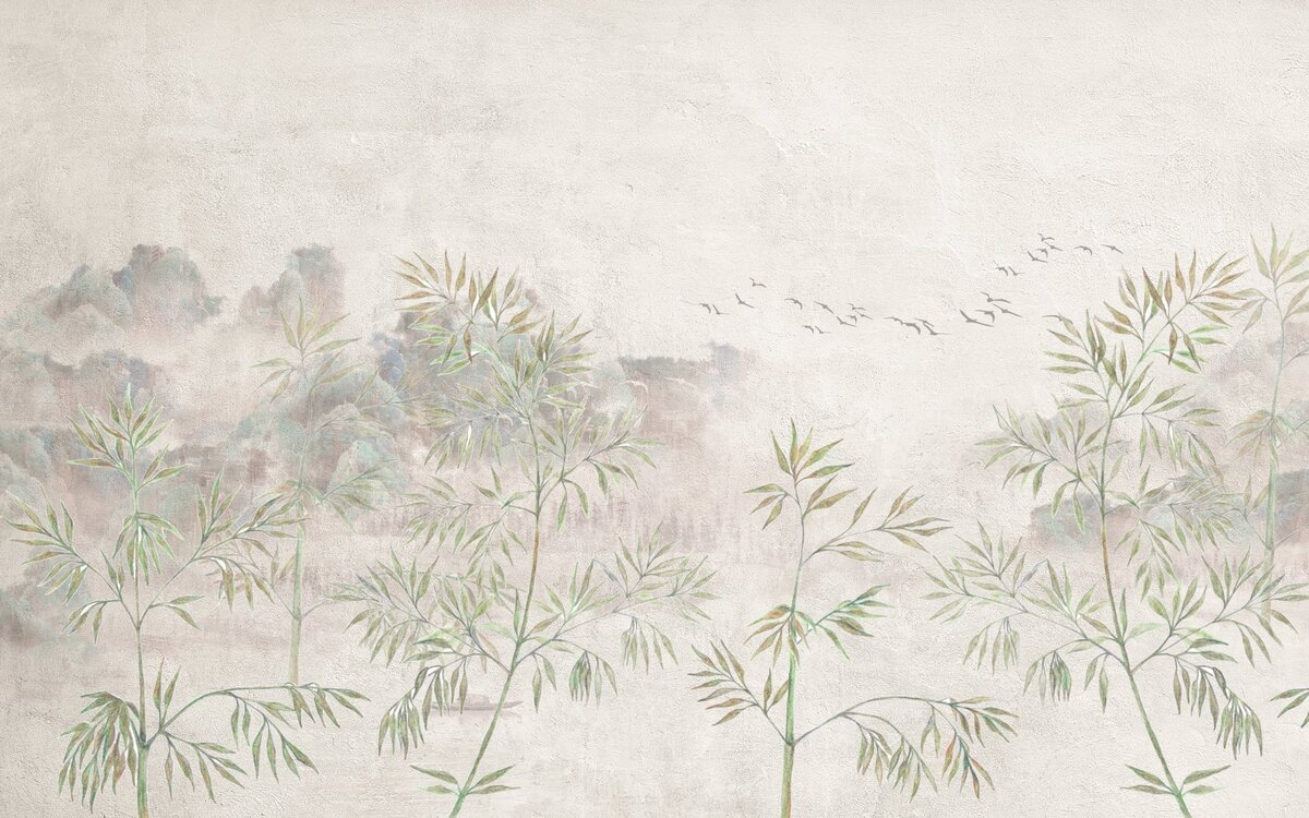 Fototapete: Bambusbäume mit fliegenden Vögeln auf strukturiertem Hintergrund