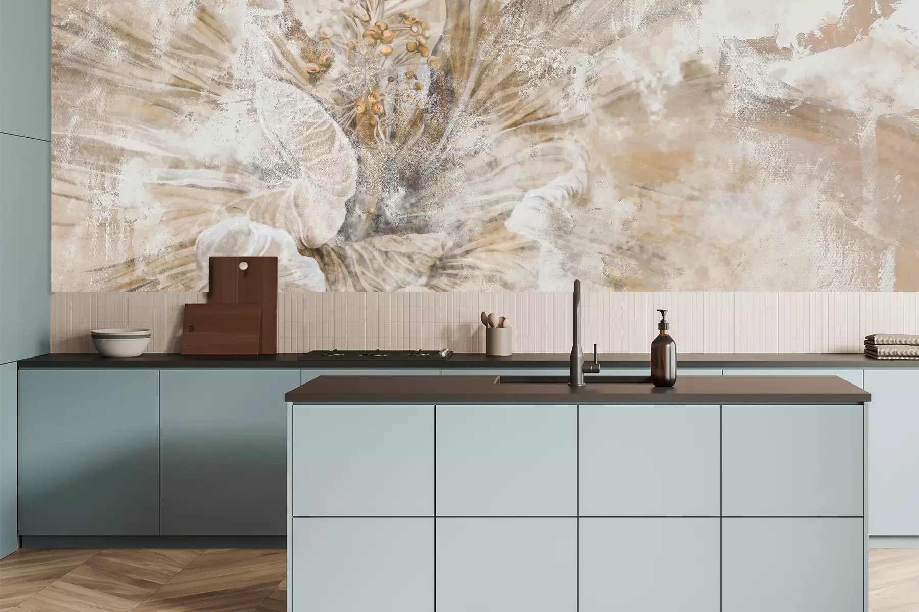 Das Material Premium+ besteht aus einer strukturierten Vinyl-Oberschicht und einem Trägermaterial (Vlies) mit einer Grammatur von 255 g/m², das kleine Unebenheiten der Wand zuverlässig kaschiert. Die feine Sandstruktur verleiht der Oberfläche eine luxuriöse Haptik, während das halbmatte Finish die Tiefe der Farben betont. Das Material ist dampfdurchlässig – so kann diese Fototapete auch in Küchen und Badezimmern eingesetzt werden. Die maximale Breite einer Tapetenbahn beträgt 100 cm. Bei größeren Abmessungen besteht die Fototapete aus mehreren gleich großen Bahnen. Der Kleber wird direkt auf die Wand aufgetragen, und die Fototapete wird auf Stoß angebracht, was für einen ästhetischen Effekt ohne sichtbare Fugen sorgt. Die Oberfläche ist pflegeleicht und kann bei Bedarf sanft mit einem feuchten Tuch abgewischt werden.