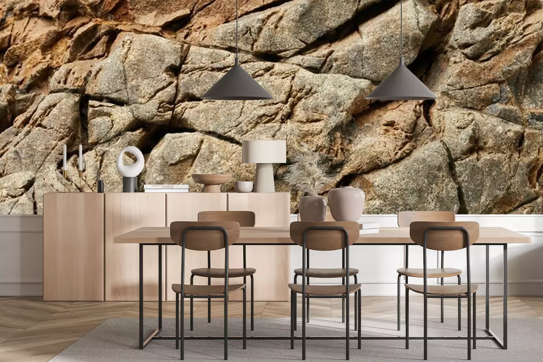 Das Material Premium+ besteht aus einer strukturierten Vinyl-Oberschicht und einem Trägermaterial (Vlies) mit einer Grammatur von 255 g/m², das kleine Unebenheiten der Wand zuverlässig kaschiert. Die feine Sandstruktur verleiht der Oberfläche eine luxuriöse Haptik, während das halbmatte Finish die Tiefe der Farben betont. Das Material ist dampfdurchlässig – so kann diese Fototapete auch in Küchen und Badezimmern eingesetzt werden. Die maximale Breite einer Tapetenbahn beträgt 100 cm. Bei größeren Abmessungen besteht die Fototapete aus mehreren gleich großen Bahnen. Der Kleber wird direkt auf die Wand aufgetragen, und die Fototapete wird auf Stoß angebracht, was für einen ästhetischen Effekt ohne sichtbare Fugen sorgt. Die Oberfläche ist pflegeleicht und kann bei Bedarf sanft mit einem feuchten Tuch abgewischt werden.