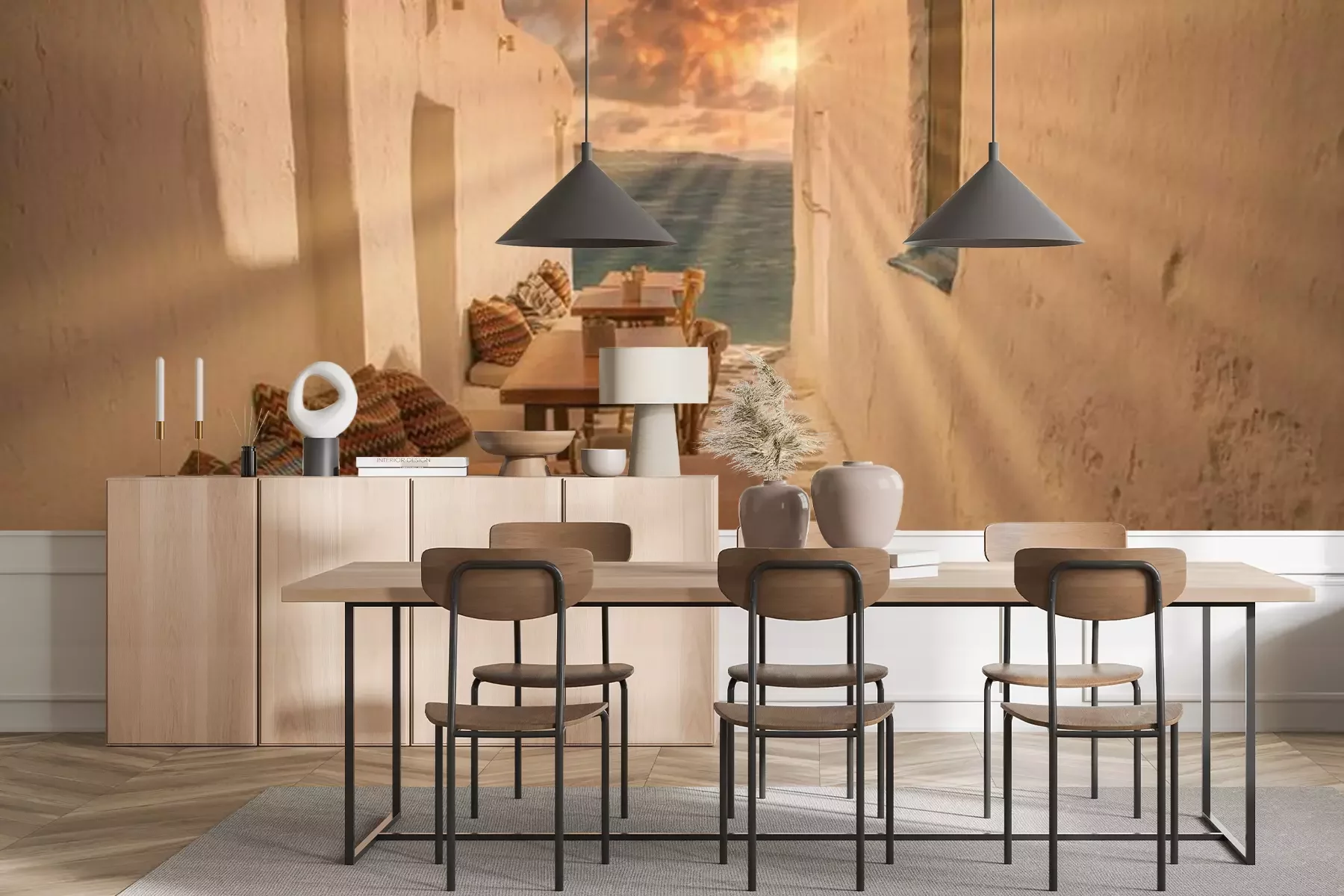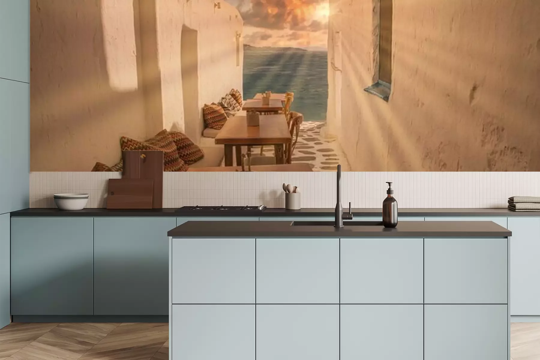Fototapete Benches with pillows in a typical Greek bar in Mykonos town with sea view, Cyclades islands, Greece. Travel concept.