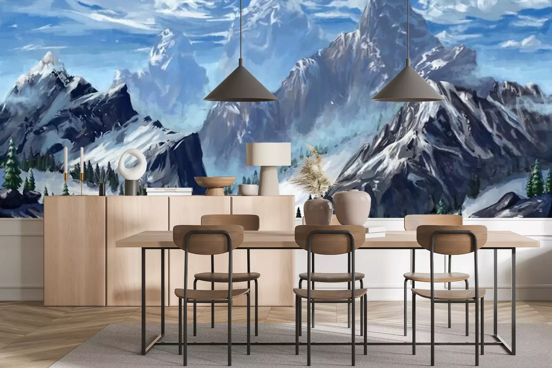 Das Material Premium+ besteht aus einer strukturierten Vinyl-Oberschicht und einem Trägermaterial (Vlies) mit einer Grammatur von 255 g/m², das kleine Unebenheiten der Wand zuverlässig kaschiert. Die feine Sandstruktur verleiht der Oberfläche eine luxuriöse Haptik, während das halbmatte Finish die Tiefe der Farben betont. Das Material ist dampfdurchlässig – so kann diese Fototapete auch in Küchen und Badezimmern eingesetzt werden. Die maximale Breite einer Tapetenbahn beträgt 100 cm. Bei größeren Abmessungen besteht die Fototapete aus mehreren gleich großen Bahnen. Der Kleber wird direkt auf die Wand aufgetragen, und die Fototapete wird auf Stoß angebracht, was für einen ästhetischen Effekt ohne sichtbare Fugen sorgt. Die Oberfläche ist pflegeleicht und kann bei Bedarf sanft mit einem feuchten Tuch abgewischt werden.