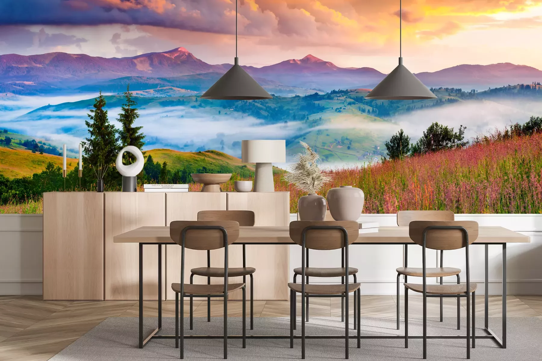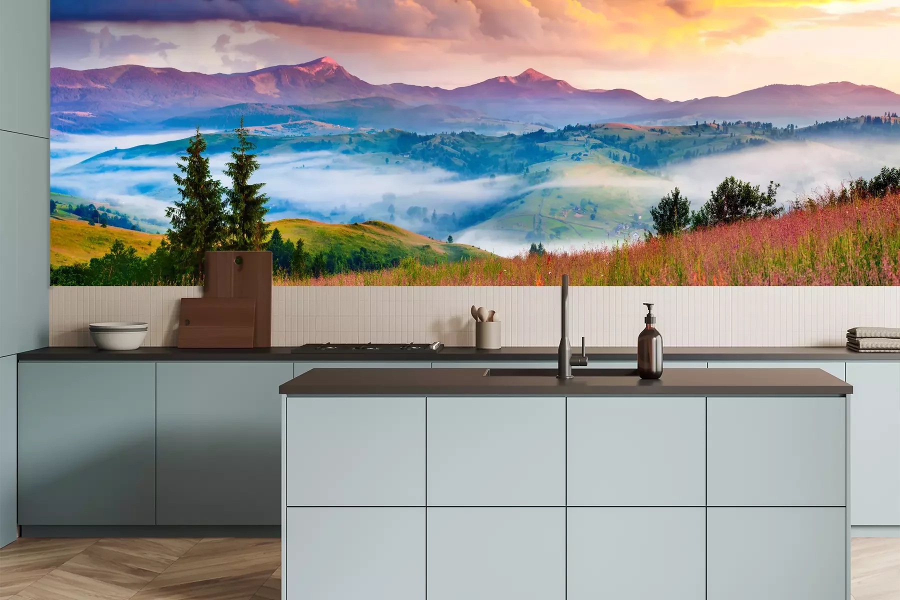 Das Material Premium+ besteht aus einer strukturierten Vinyl-Oberschicht und einem Trägermaterial (Vlies) mit einer Grammatur von 255 g/m², das kleine Unebenheiten der Wand zuverlässig kaschiert. Die feine Sandstruktur verleiht der Oberfläche eine luxuriöse Haptik, während das halbmatte Finish die Tiefe der Farben betont. Das Material ist dampfdurchlässig – so kann diese Fototapete auch in Küchen und Badezimmern eingesetzt werden. Die maximale Breite einer Tapetenbahn beträgt 100 cm. Bei größeren Abmessungen besteht die Fototapete aus mehreren gleich großen Bahnen. Der Kleber wird direkt auf die Wand aufgetragen, und die Fototapete wird auf Stoß angebracht, was für einen ästhetischen Effekt ohne sichtbare Fugen sorgt. Die Oberfläche ist pflegeleicht und kann bei Bedarf sanft mit einem feuchten Tuch abgewischt werden.