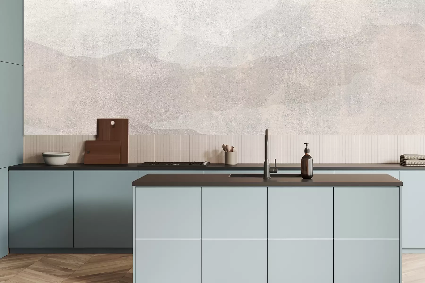 Das Material Premium+ besteht aus einer strukturierten Vinyl-Oberschicht und einem Trägermaterial (Vlies) mit einer Grammatur von 255 g/m², das kleine Unebenheiten der Wand zuverlässig kaschiert. Die feine Sandstruktur verleiht der Oberfläche eine luxuriöse Haptik, während das halbmatte Finish die Tiefe der Farben betont. Das Material ist dampfdurchlässig – so kann diese Fototapete auch in Küchen und Badezimmern eingesetzt werden. Die maximale Breite einer Tapetenbahn beträgt 100 cm. Bei größeren Abmessungen besteht die Fototapete aus mehreren gleich großen Bahnen. Der Kleber wird direkt auf die Wand aufgetragen, und die Fototapete wird auf Stoß angebracht, was für einen ästhetischen Effekt ohne sichtbare Fugen sorgt. Die Oberfläche ist pflegeleicht und kann bei Bedarf sanft mit einem feuchten Tuch abgewischt werden.