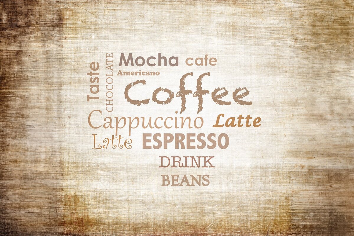 Fototapete: Beschriftungen mit Kaffeesorten auf Holz