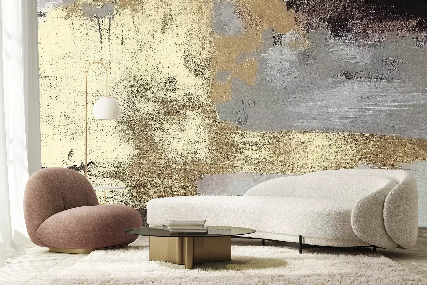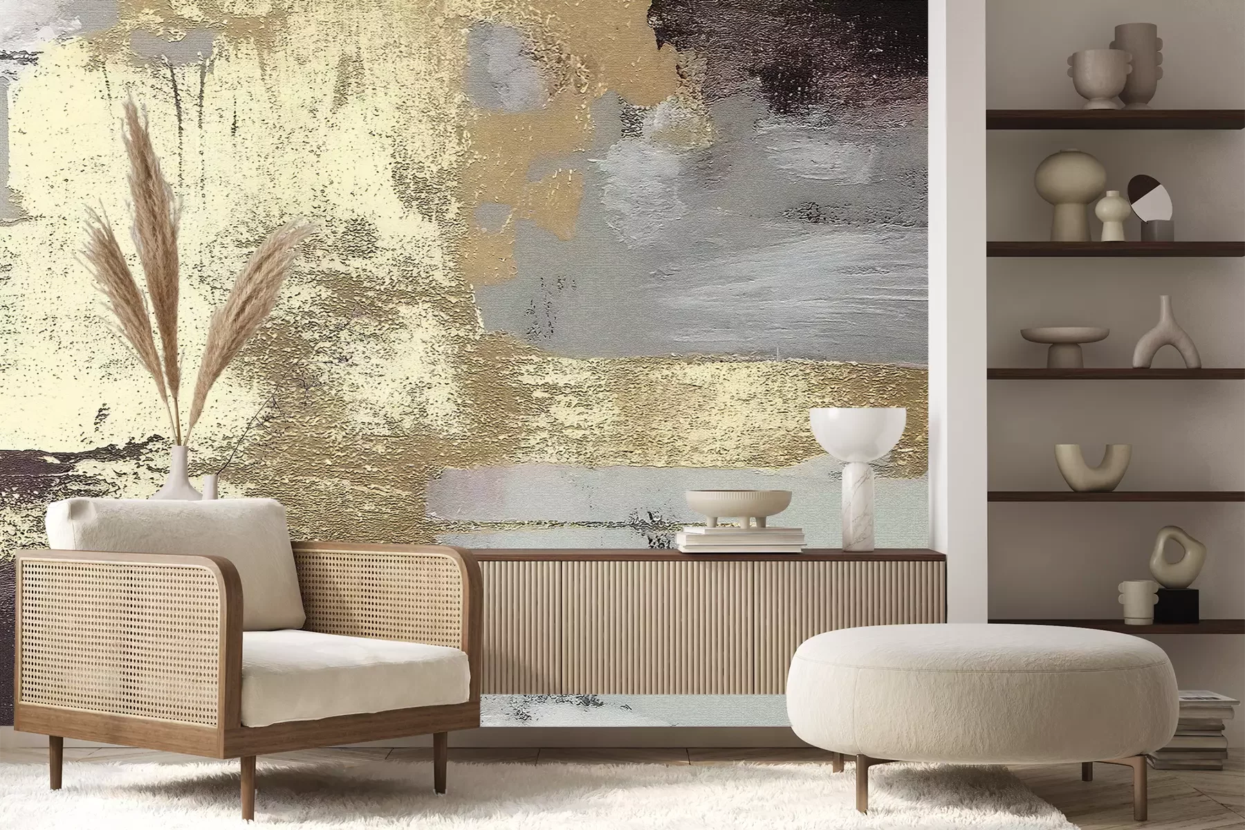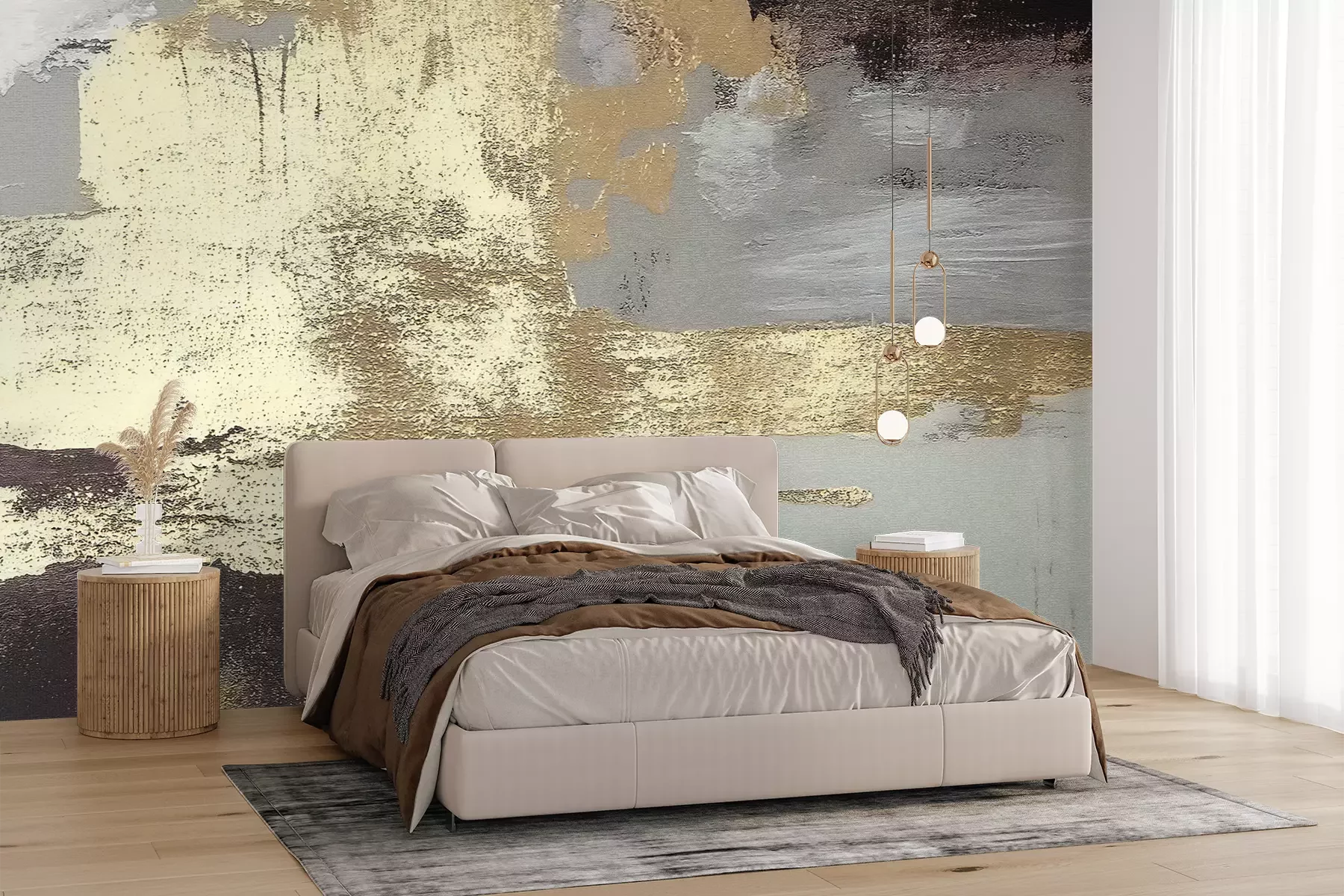 Das Material Premium+ besteht aus einer strukturierten Vinyl-Oberschicht und einem Trägermaterial (Vlies) mit einer Grammatur von 255 g/m², das kleine Unebenheiten der Wand zuverlässig kaschiert. Die feine Sandstruktur verleiht der Oberfläche eine luxuriöse Haptik, während das halbmatte Finish die Tiefe der Farben betont. Das Material ist dampfdurchlässig – so kann diese Fototapete auch in Küchen und Badezimmern eingesetzt werden. Die maximale Breite einer Tapetenbahn beträgt 100 cm. Bei größeren Abmessungen besteht die Fototapete aus mehreren gleich großen Bahnen. Der Kleber wird direkt auf die Wand aufgetragen, und die Fototapete wird auf Stoß angebracht, was für einen ästhetischen Effekt ohne sichtbare Fugen sorgt. Die Oberfläche ist pflegeleicht und kann bei Bedarf sanft mit einem feuchten Tuch abgewischt werden.