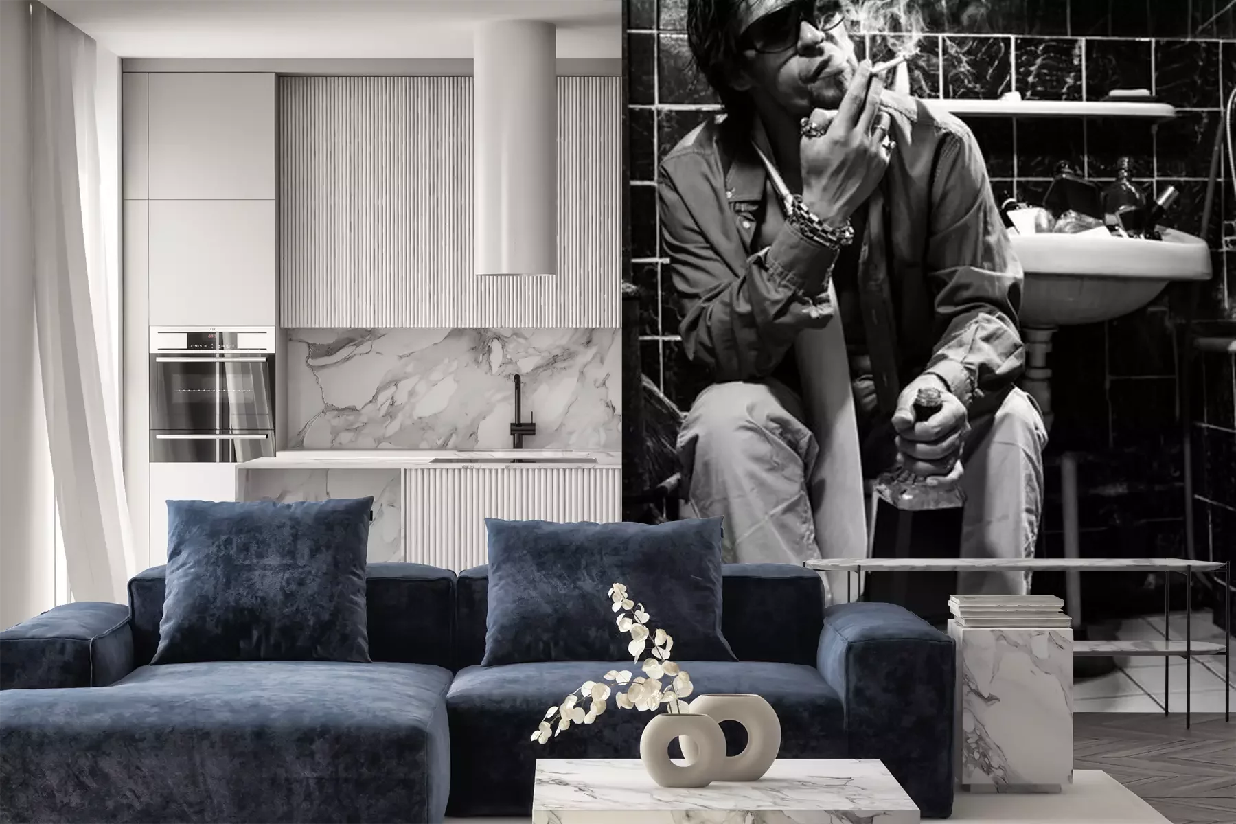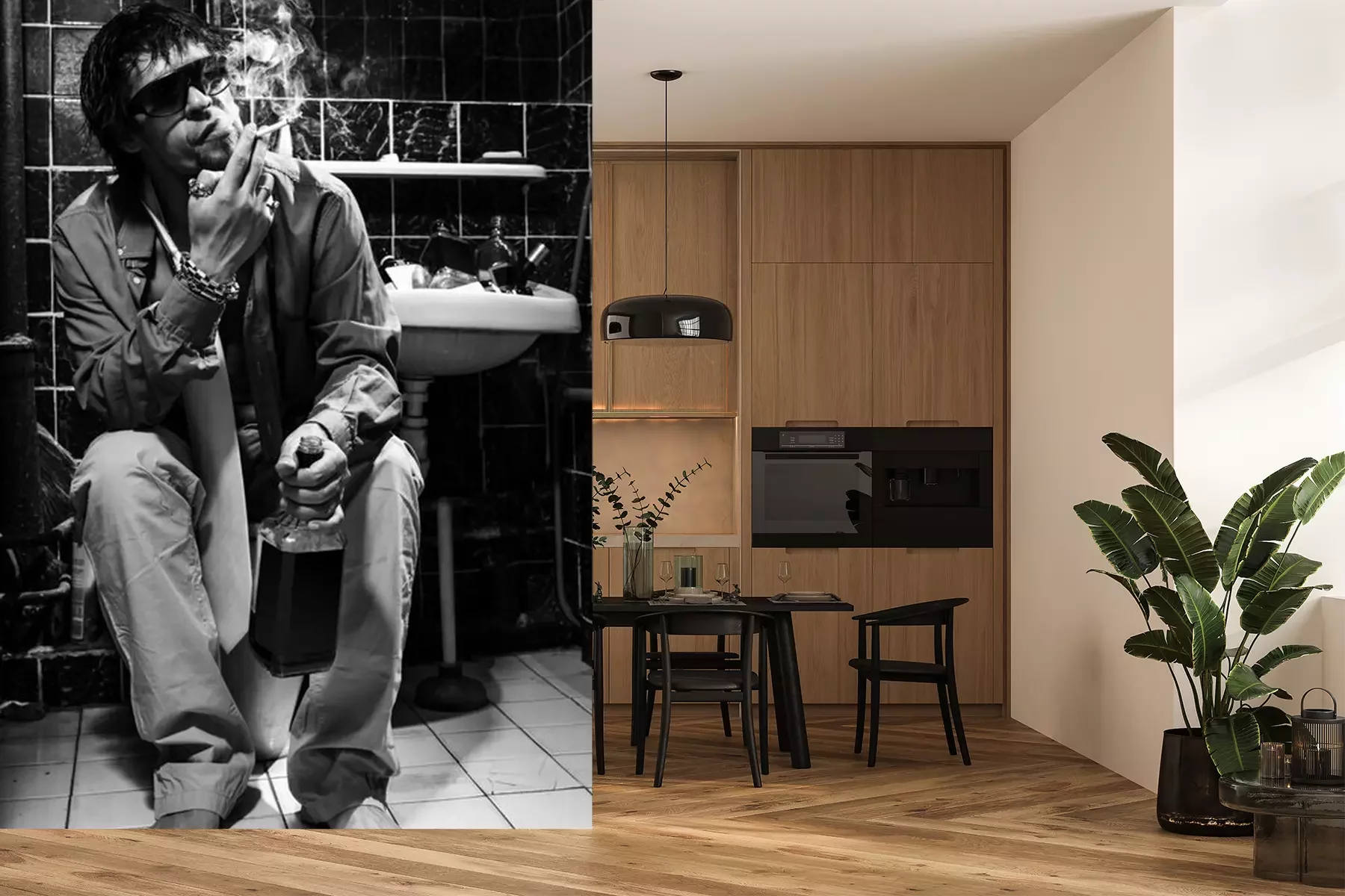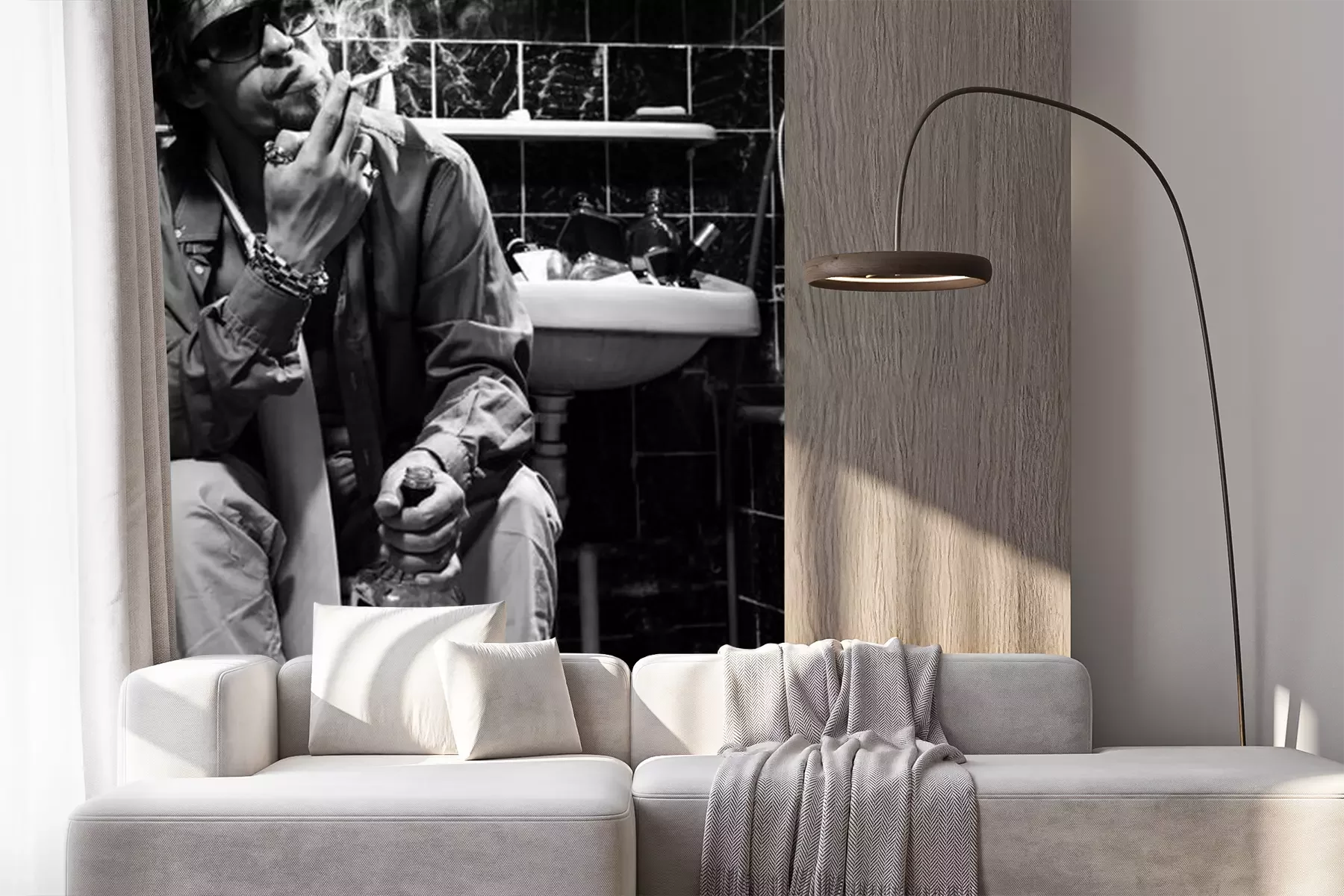 Fototapete Betrunkener Mann sitzt in einer Toilette mit einer Flasche Alkohol