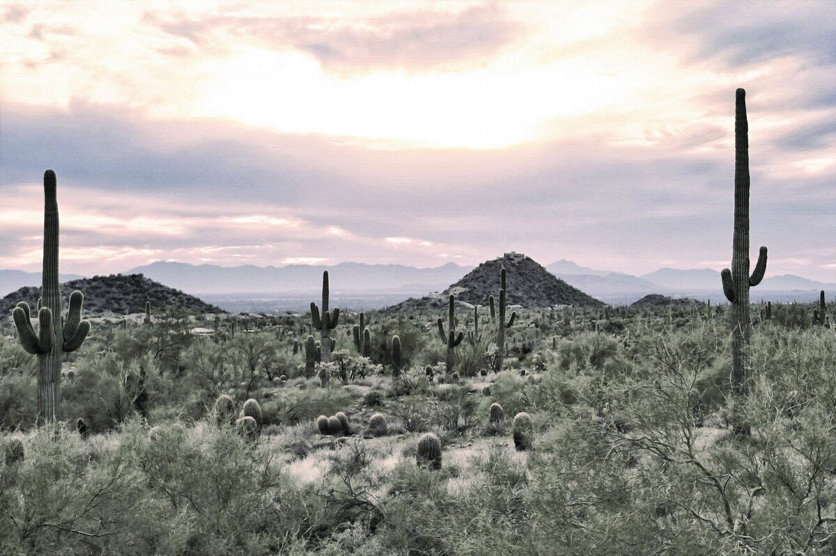 Fototapete: Bewachsene Wüste mit Kakteen und Felsen