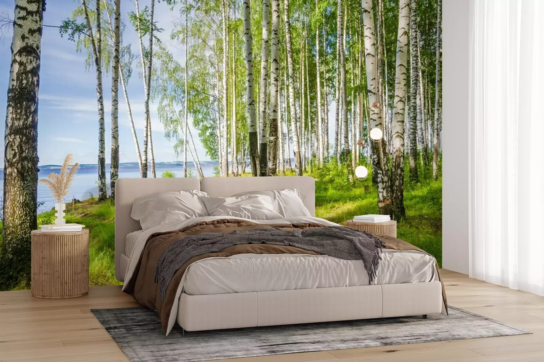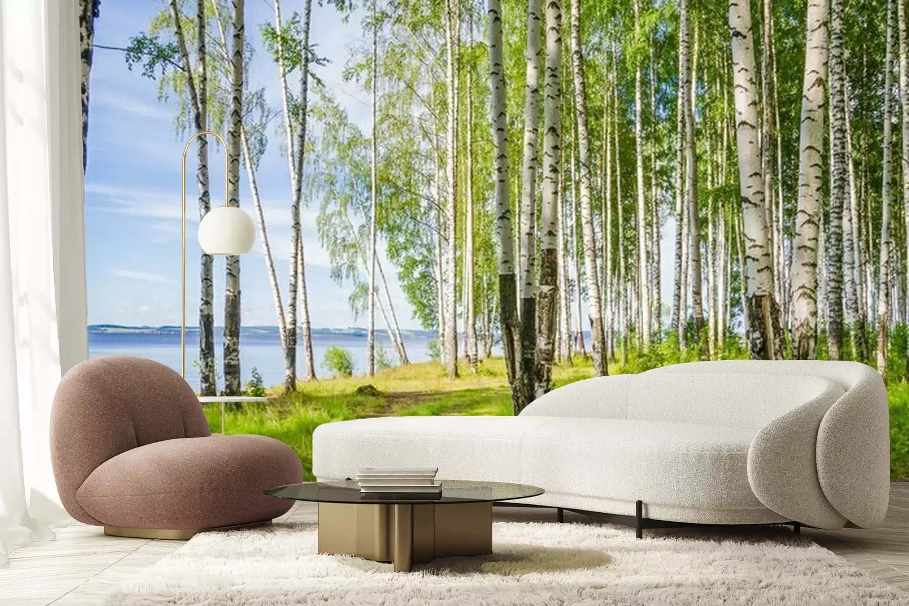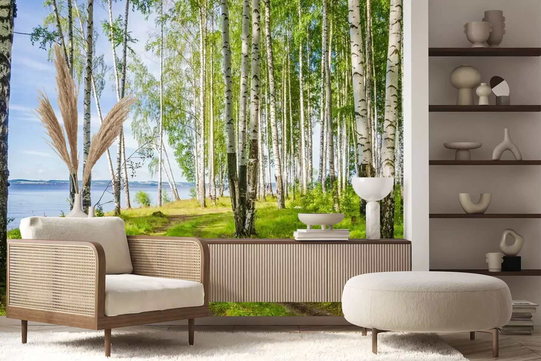 Landschaft mit Birkenwald am FlussProblemlose Lieferung durch vertrauenswürdige Spediteure