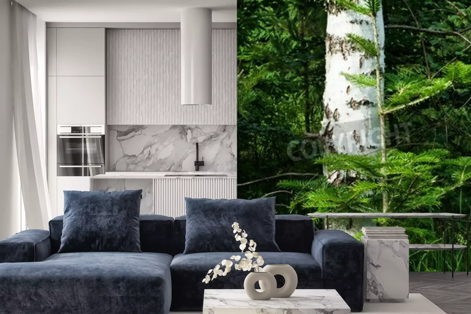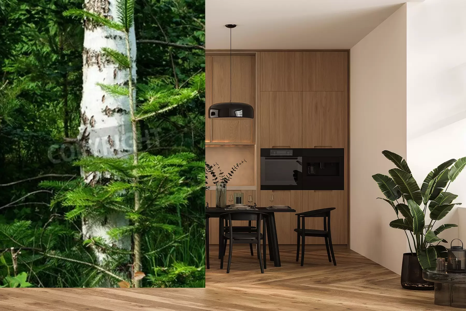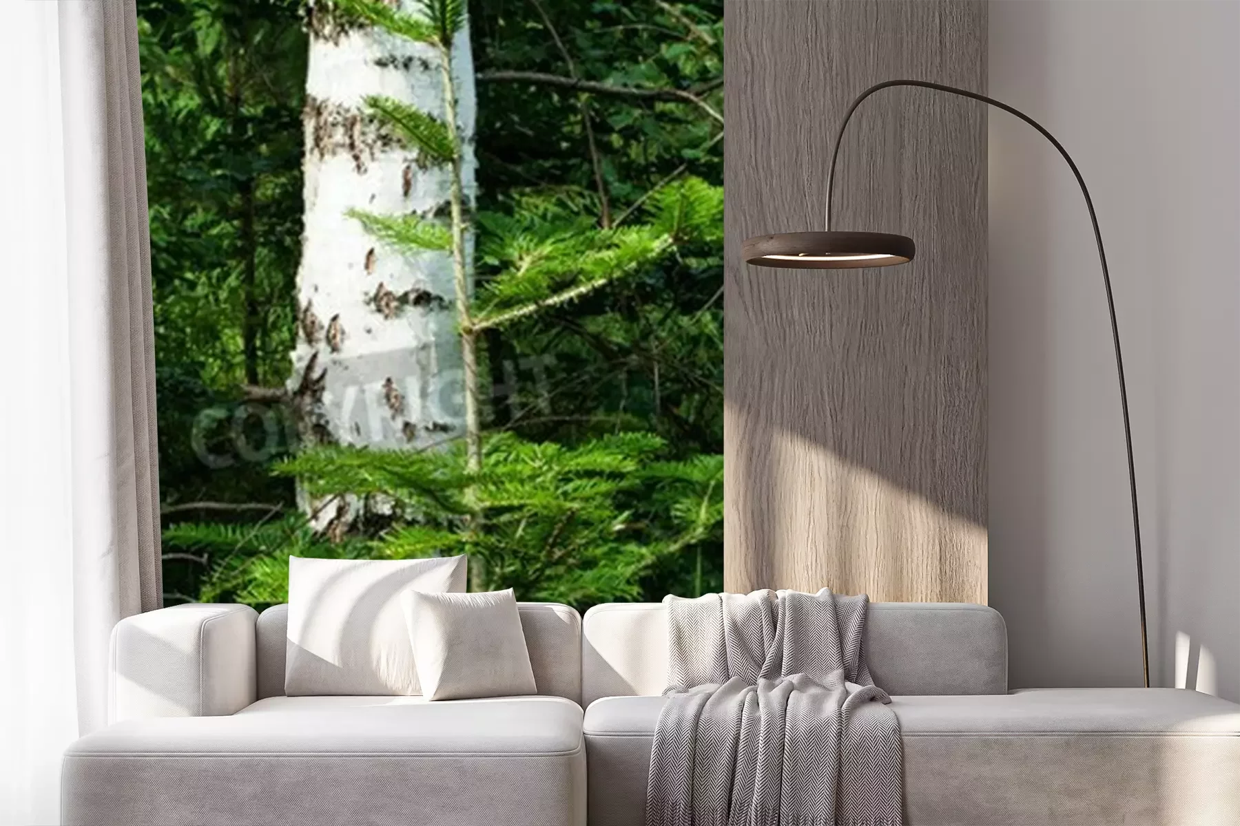 Fototapete Birke in Tannenbäumen