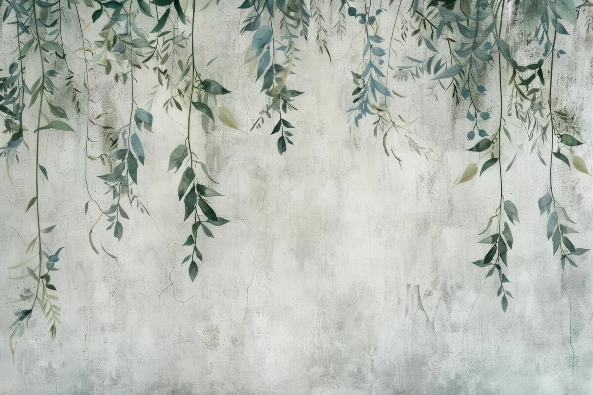 Fototapete: Blätter, die von oben auf einem grauen Betonhintergrund hängen