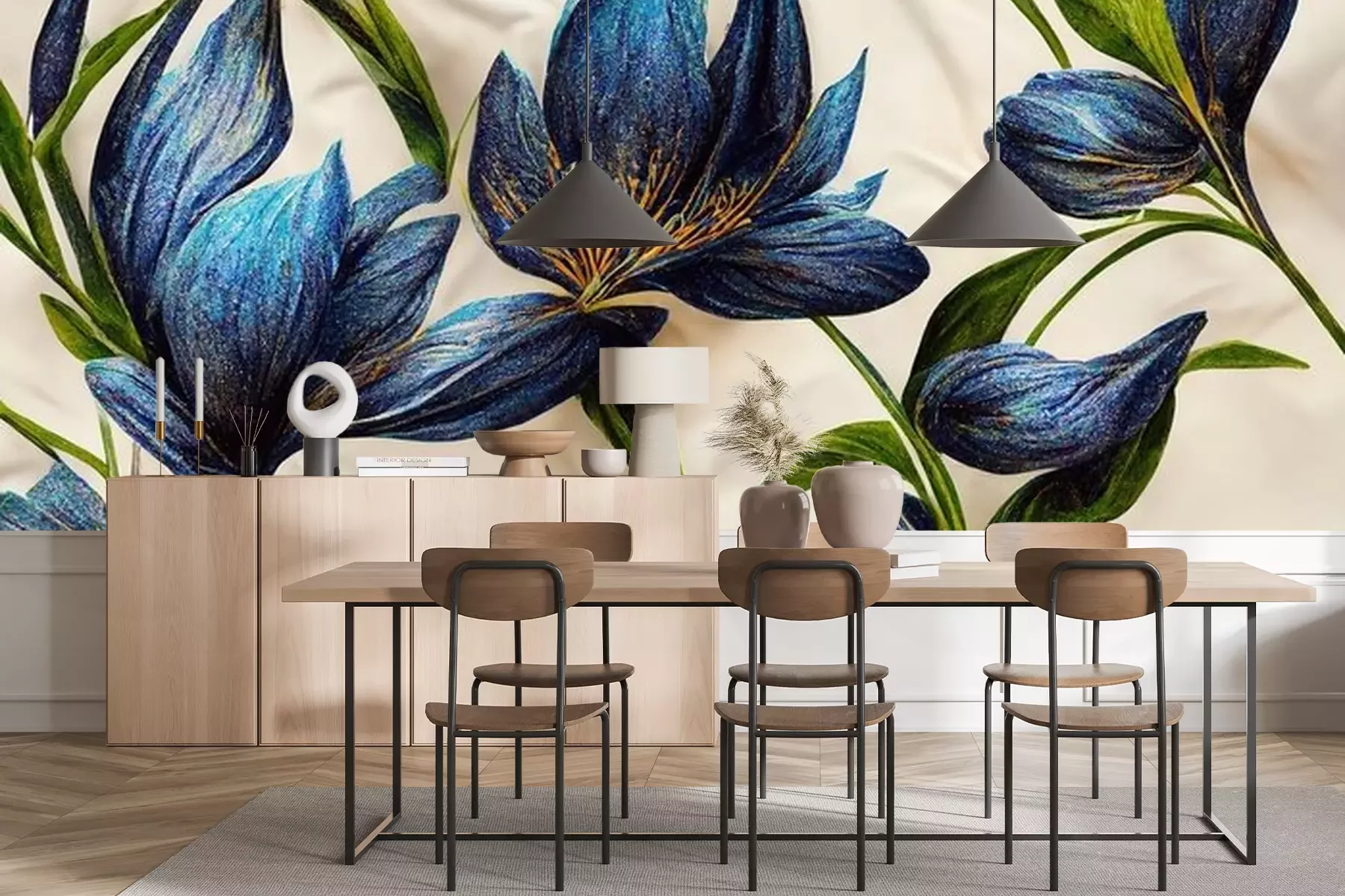 Fototapete Blaue Blumen auf beigem Hintergrund