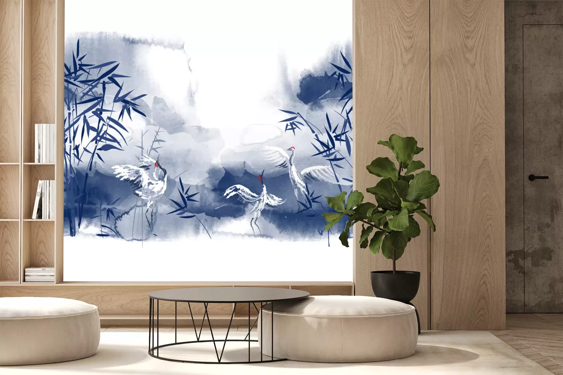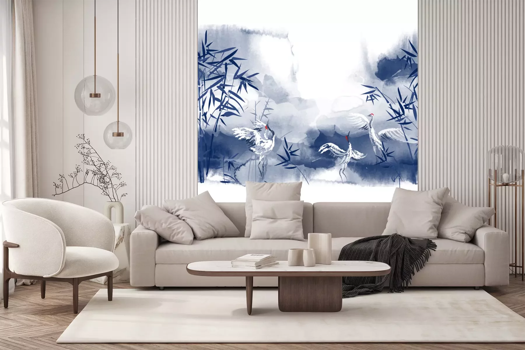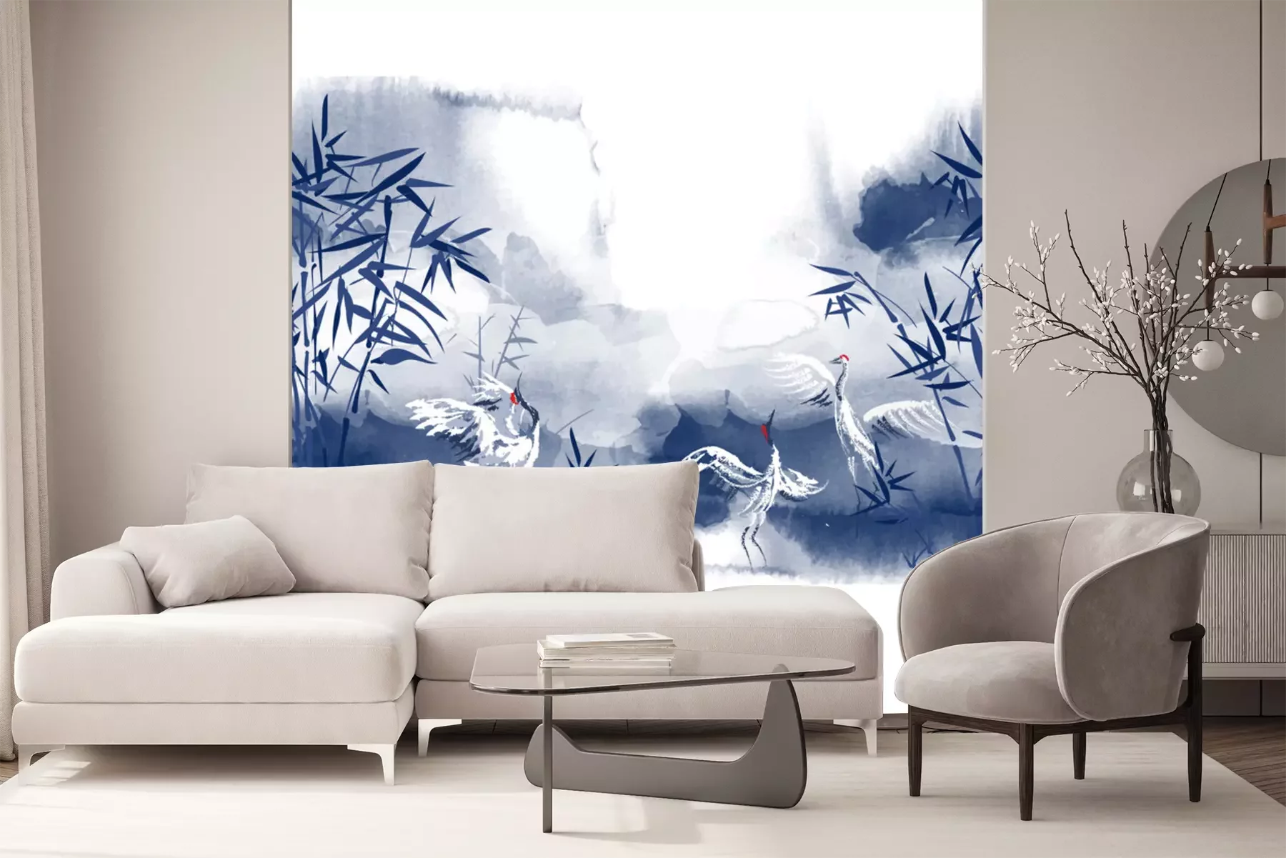 Fototapete Blauer Hintergrund tanzender Kraniche