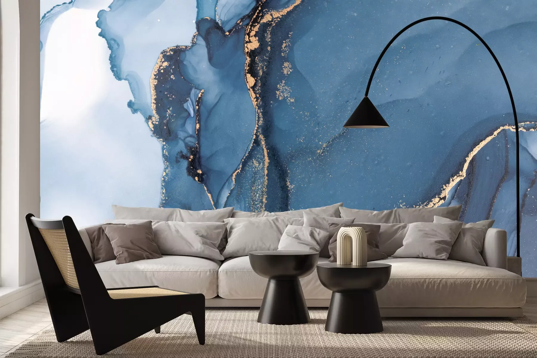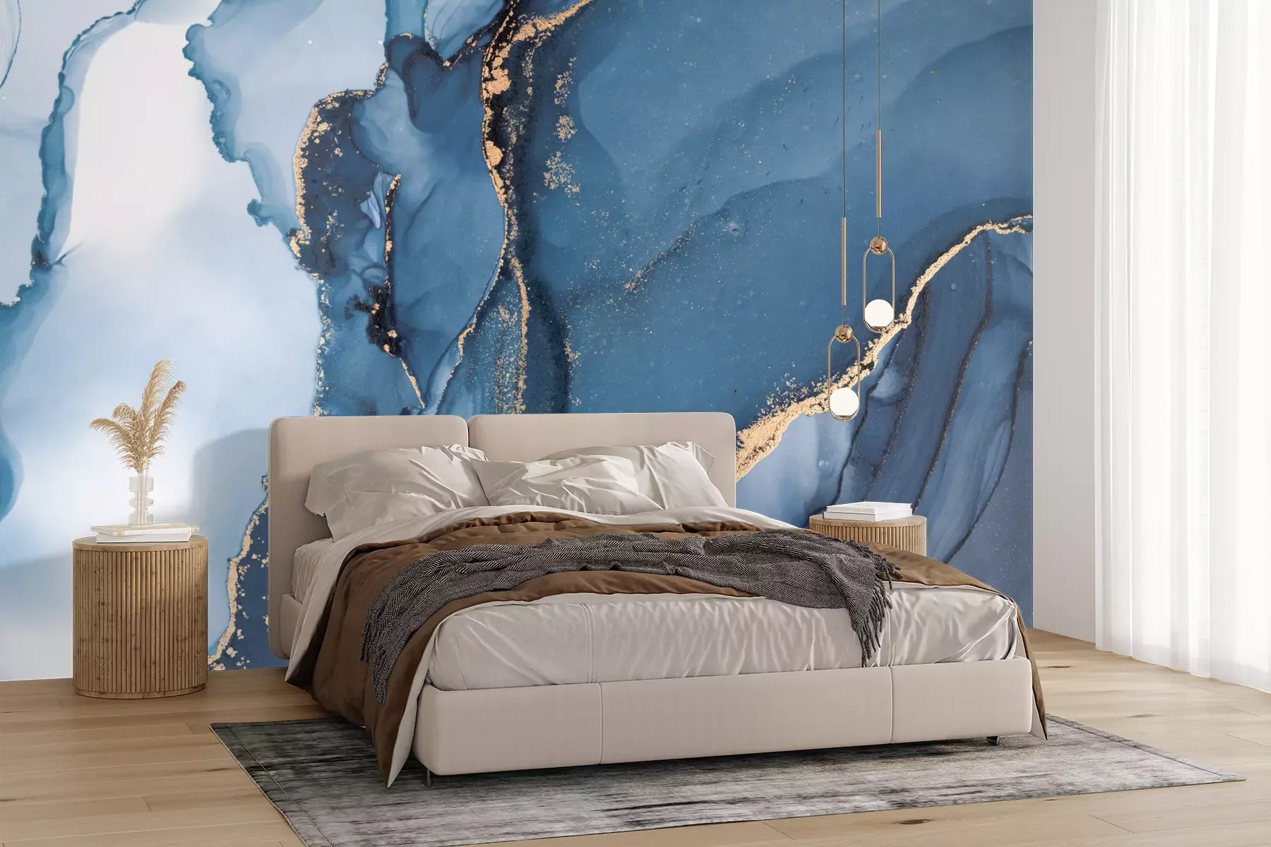 Das Material Premium+ besteht aus einer strukturierten Vinyl-Oberschicht und einem Trägermaterial (Vlies) mit einer Grammatur von 255 g/m², das kleine Unebenheiten der Wand zuverlässig kaschiert. Die feine Sandstruktur verleiht der Oberfläche eine luxuriöse Haptik, während das halbmatte Finish die Tiefe der Farben betont. Das Material ist dampfdurchlässig – so kann diese Fototapete auch in Küchen und Badezimmern eingesetzt werden. Die maximale Breite einer Tapetenbahn beträgt 100 cm. Bei größeren Abmessungen besteht die Fototapete aus mehreren gleich großen Bahnen. Der Kleber wird direkt auf die Wand aufgetragen, und die Fototapete wird auf Stoß angebracht, was für einen ästhetischen Effekt ohne sichtbare Fugen sorgt. Die Oberfläche ist pflegeleicht und kann bei Bedarf sanft mit einem feuchten Tuch abgewischt werden.
