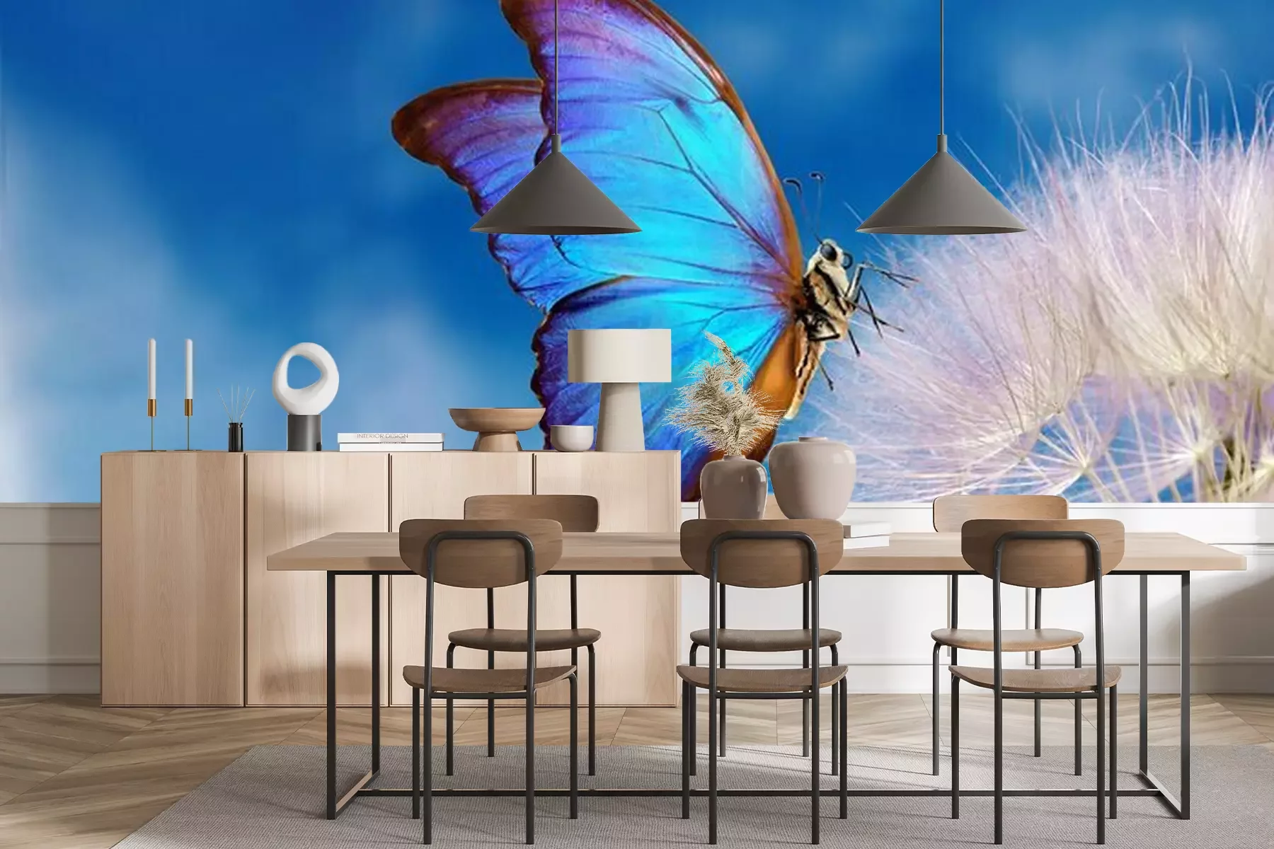 Fototapete Blauer Morpho-Schmetterling auf Löwenzahn