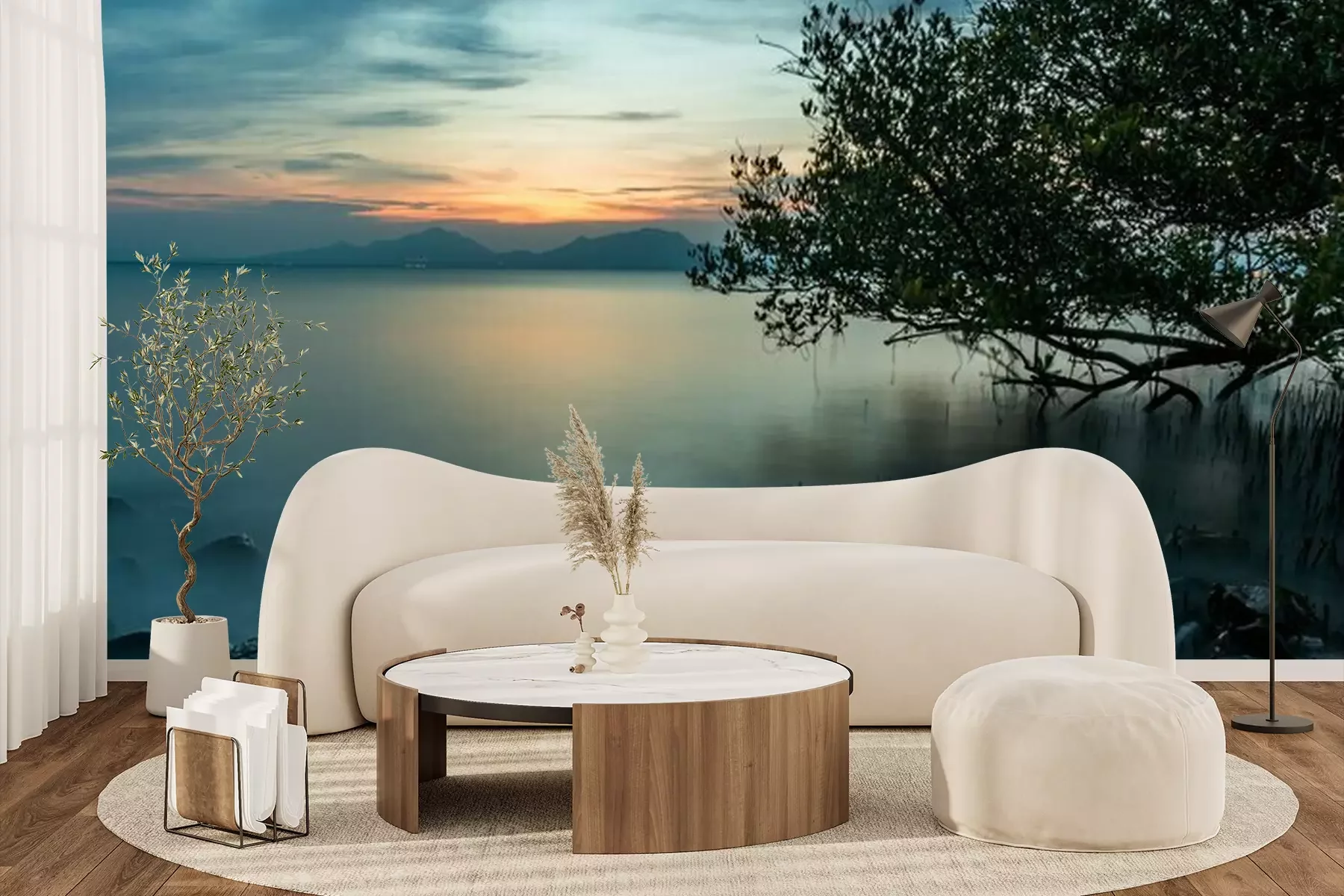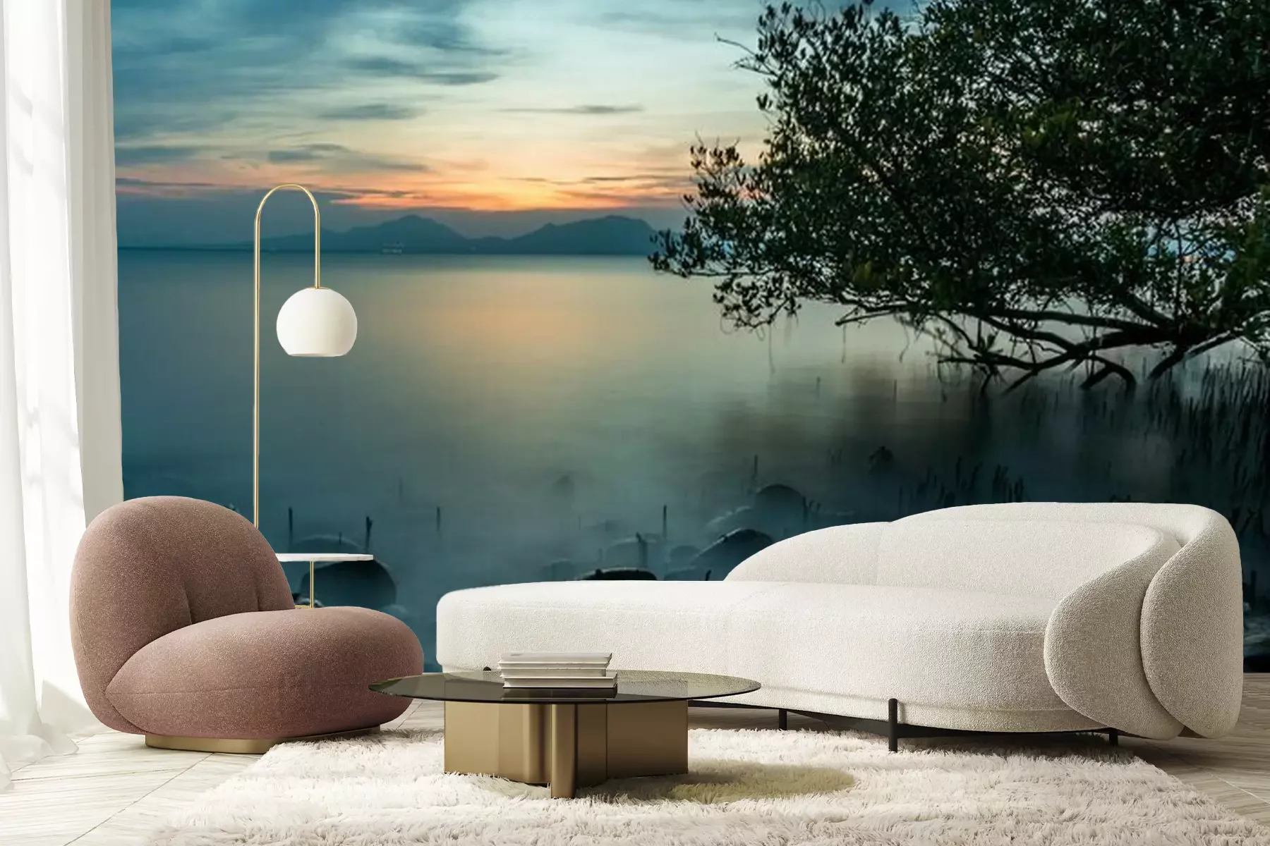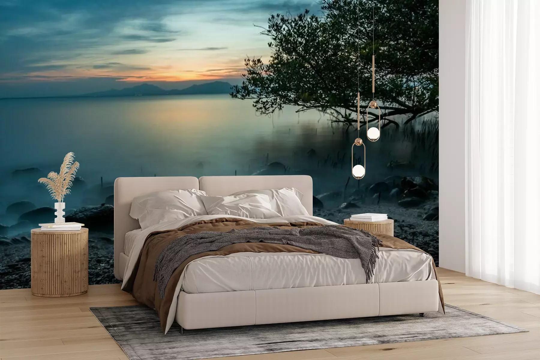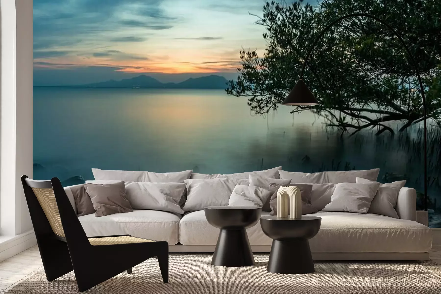 Fototapete Blick auf den Sonnenuntergang über den Berg von Mangroven
